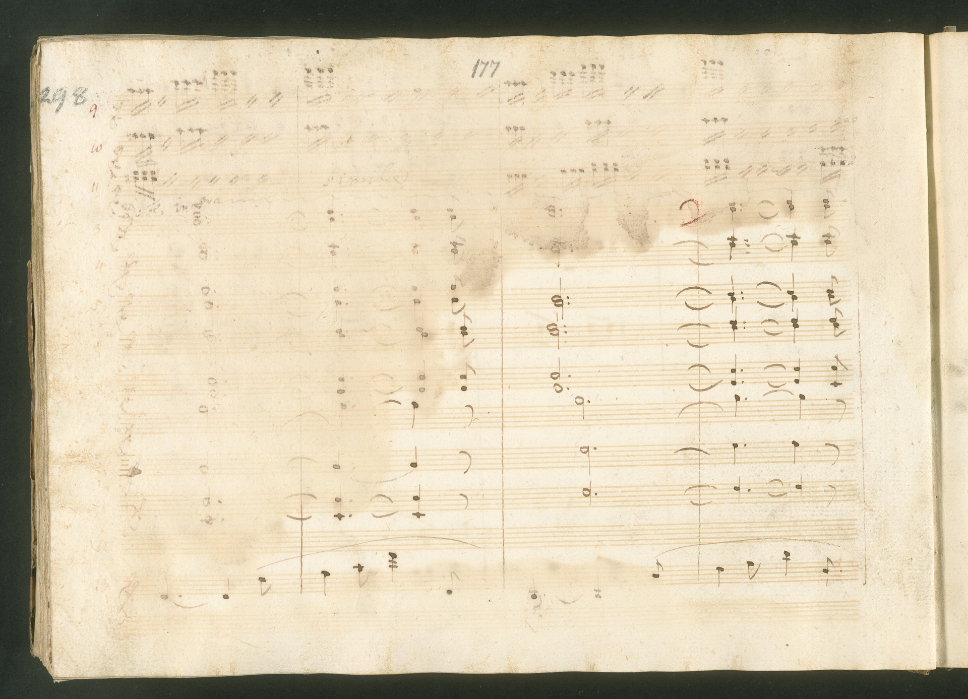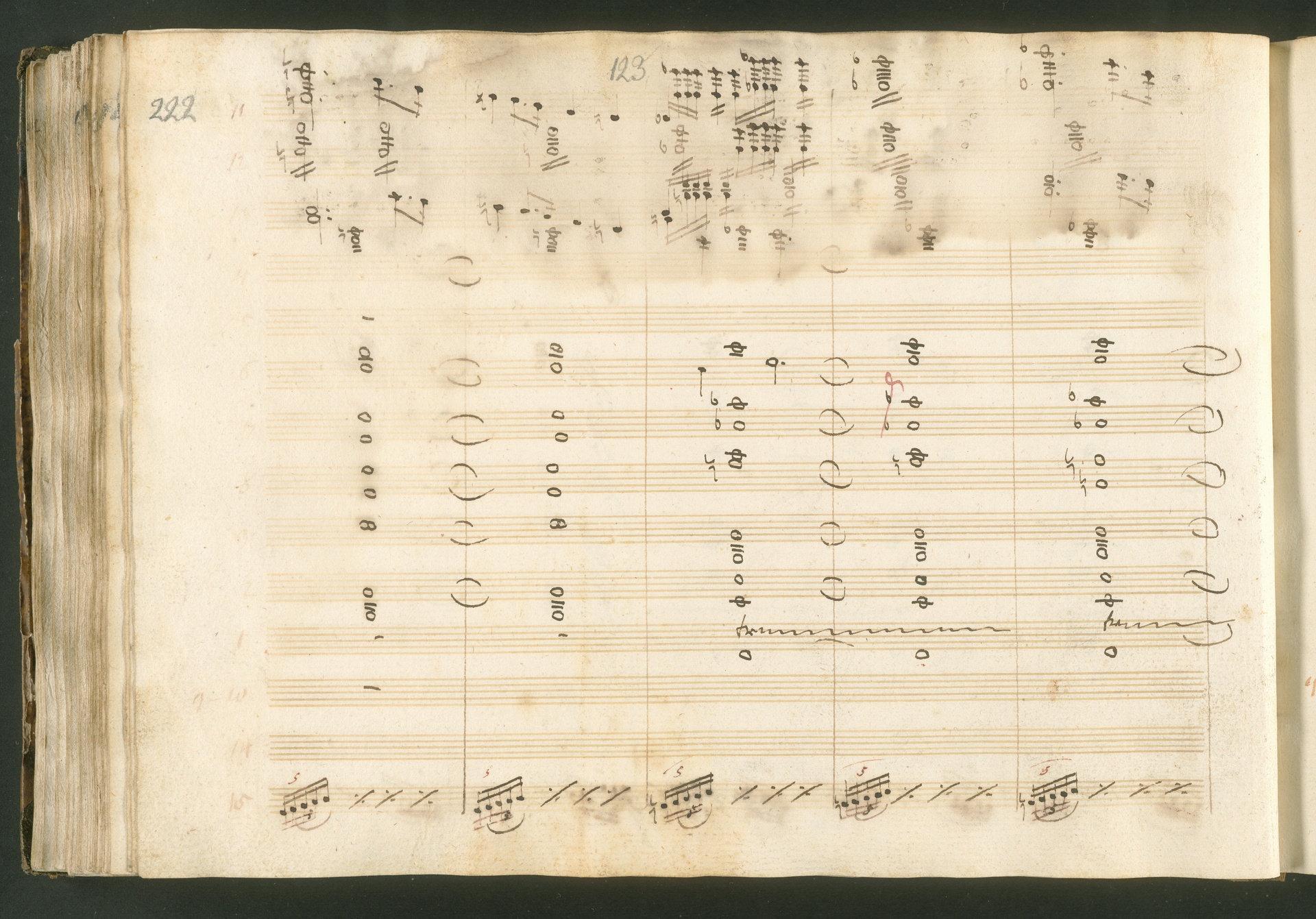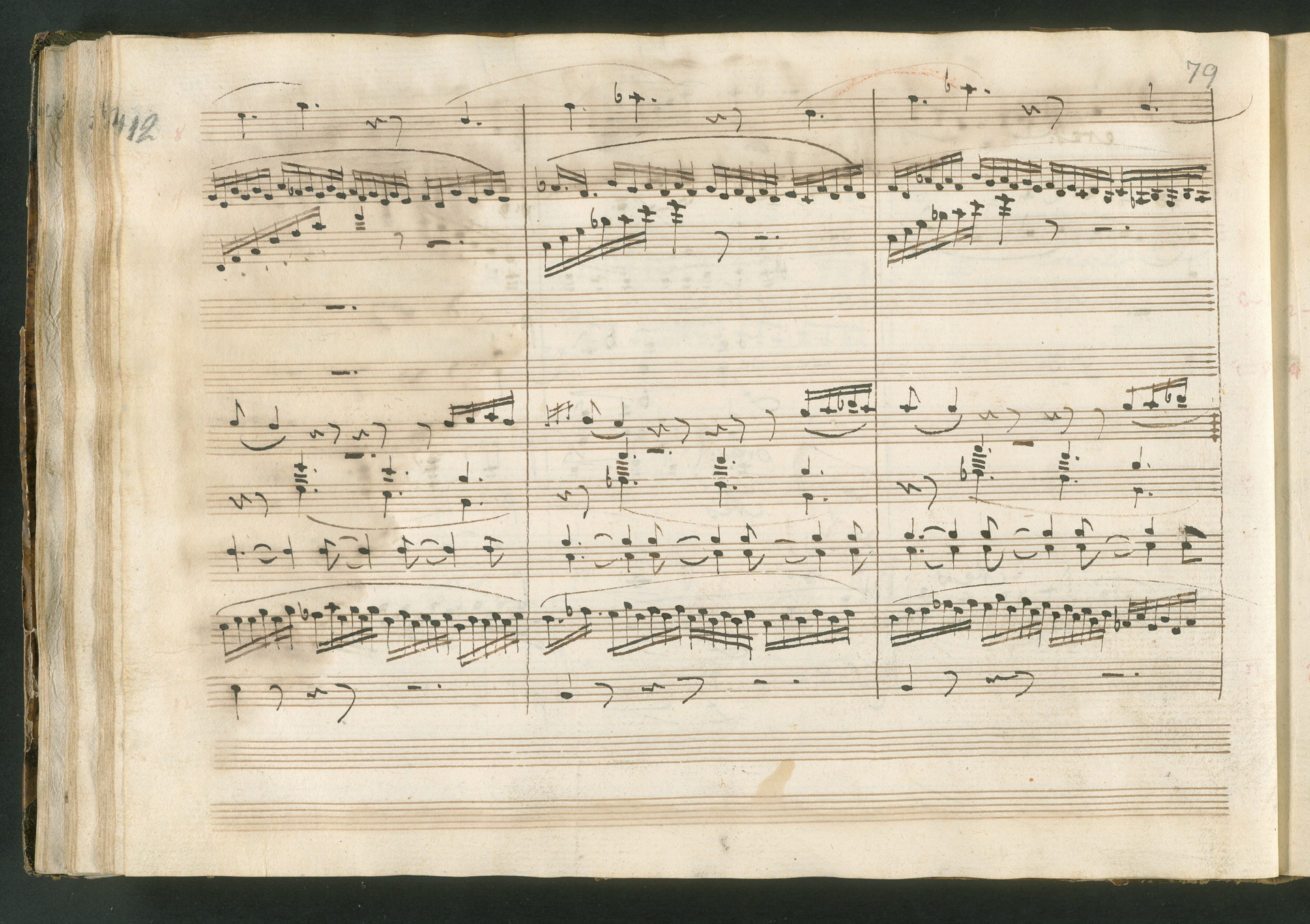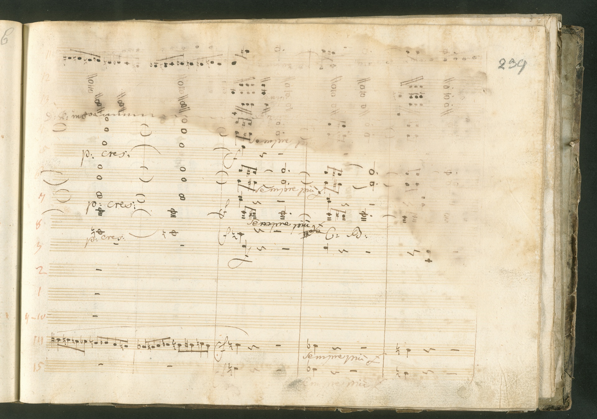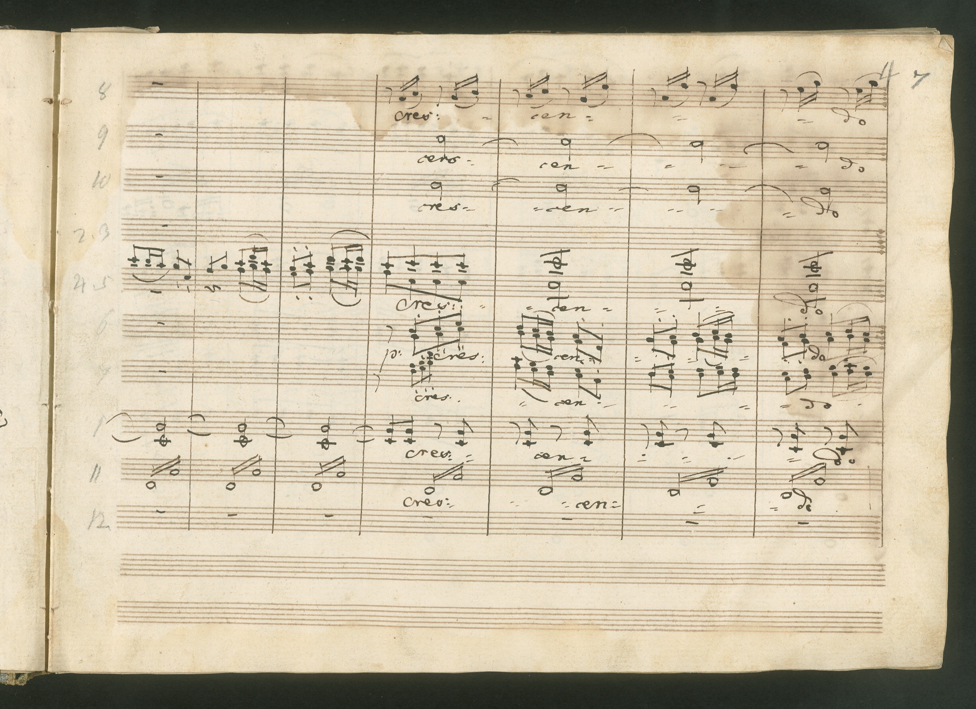 This copy of the score of the Sixth Symphony was removed from Breitkopf & Härtel's archives in the 1830s and was considered lost for a very long time. Even in the 1970s its whereabouts was still unknown. The copy only re-emerged in the 1980s and was acquired by the Beethoven-Haus. With its many corrections, which Beethoven made in a reddish-brown crayon and which the copyist partially went over in ink, it is a valuable document for research. Sadly the manuscript is in a very bad condition having been badly damaged by water; many pages in the last two movements are completely washed out and hardly legible anymore. (J.R.)