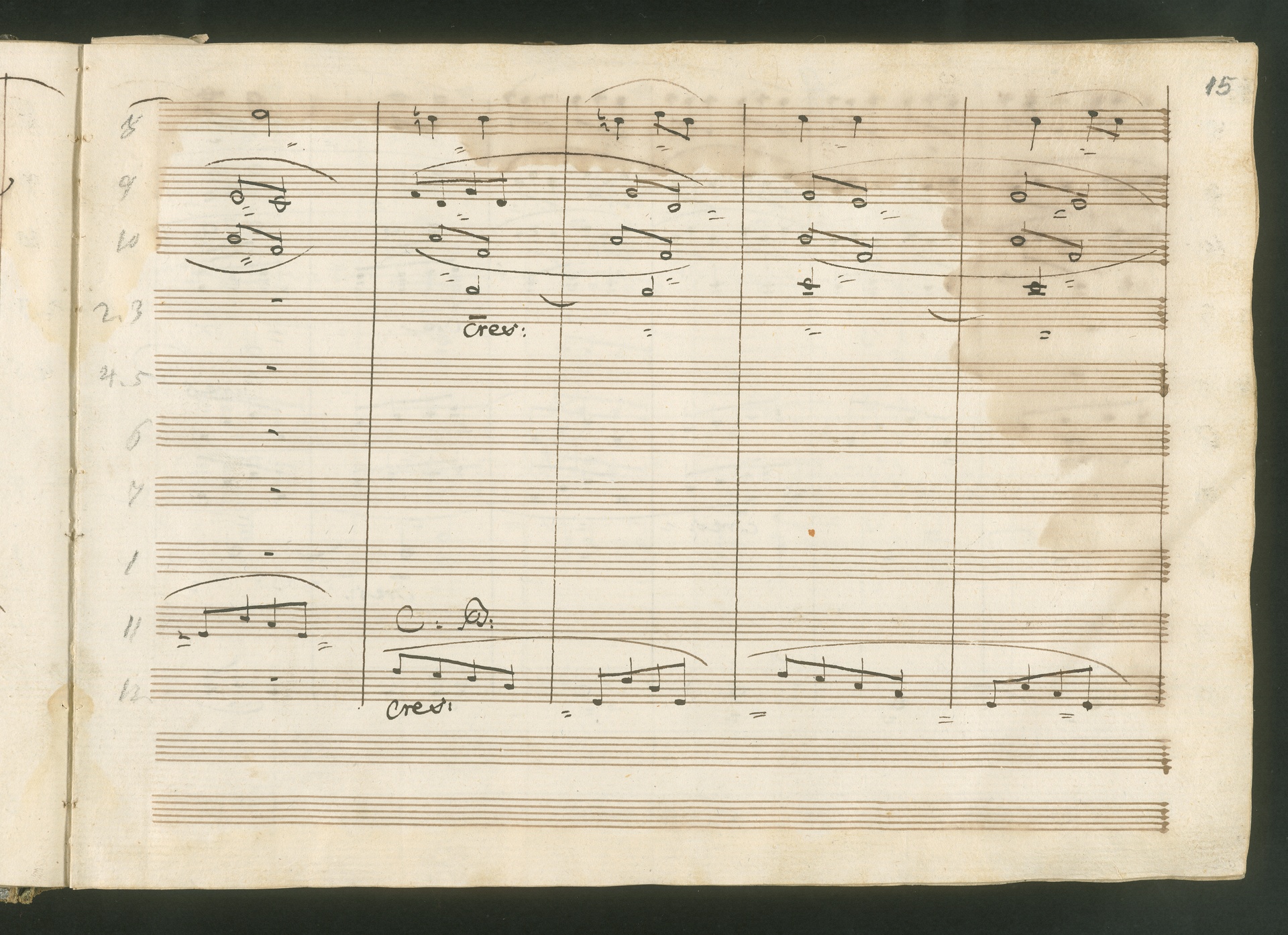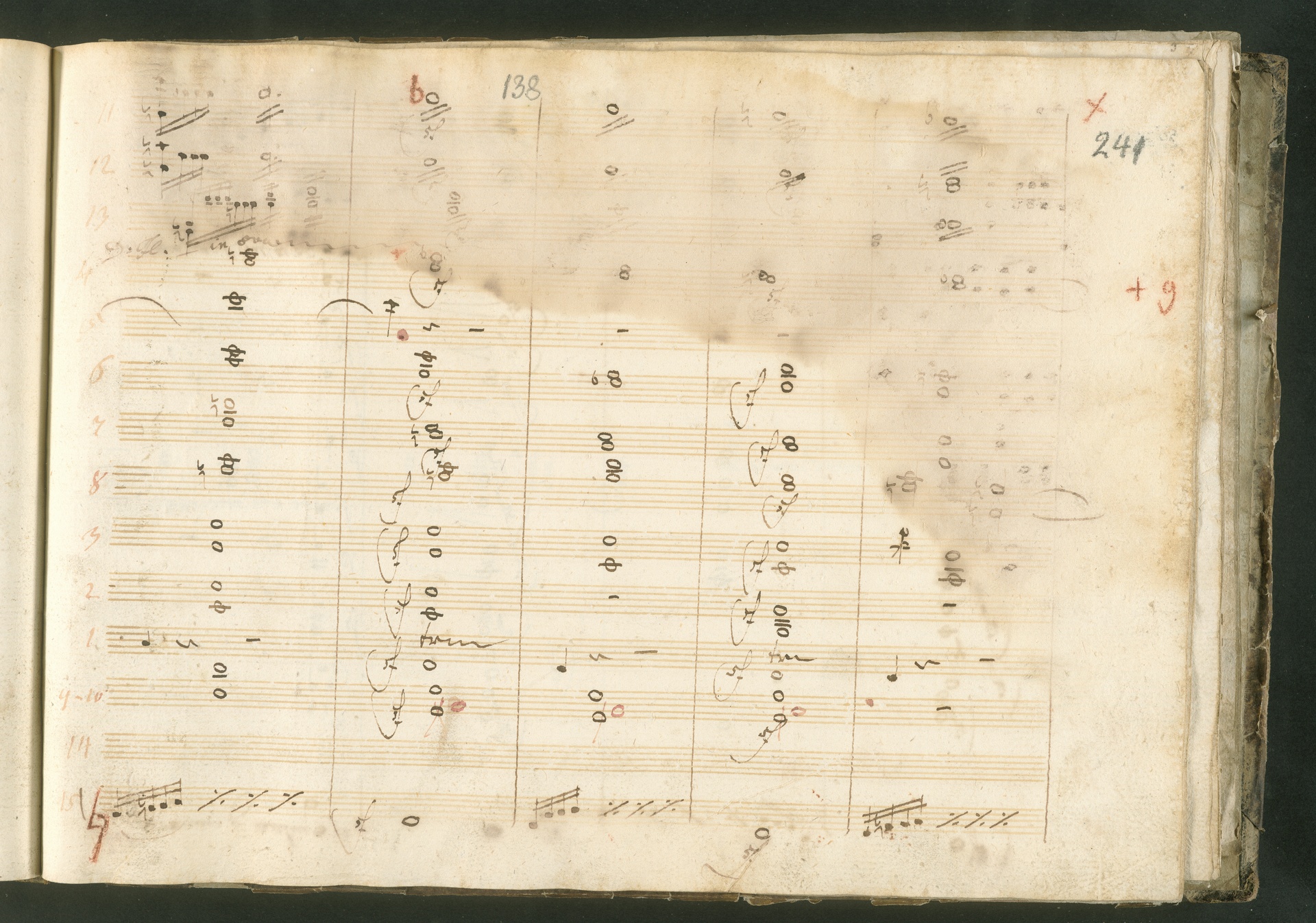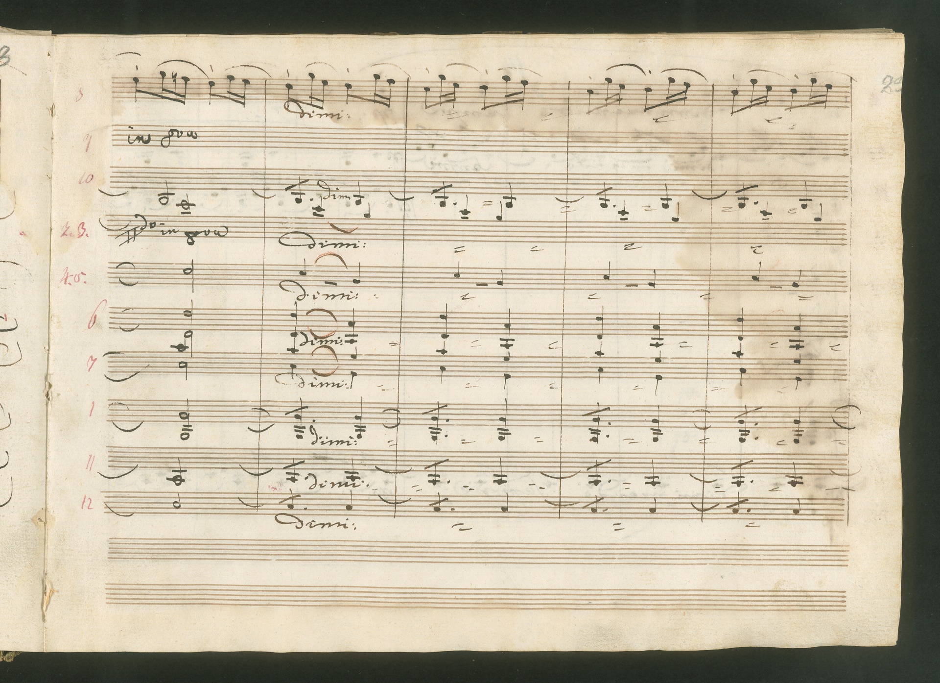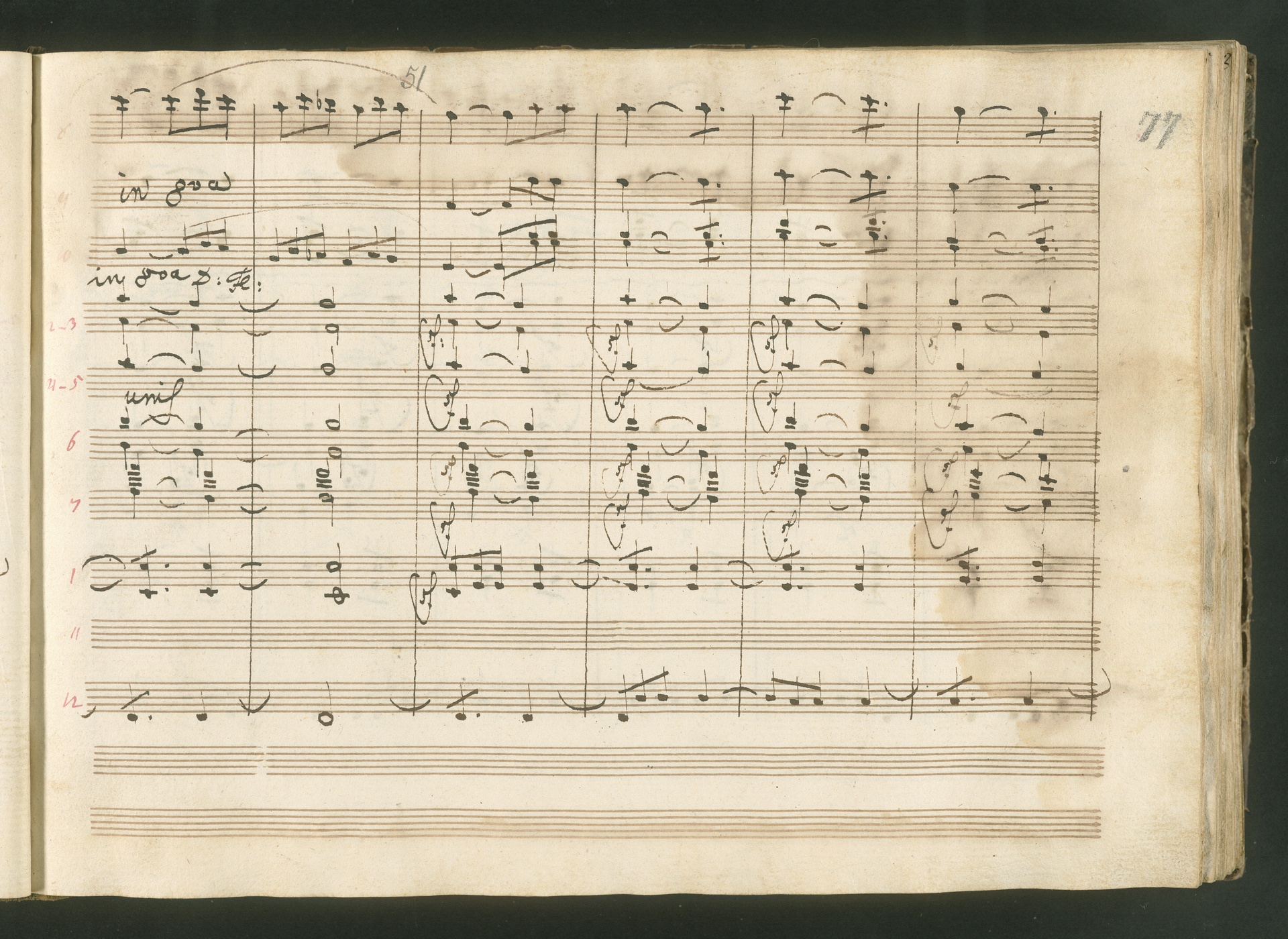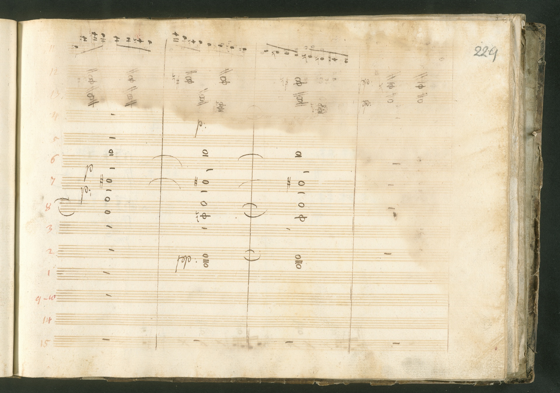 This copy of the score of the Sixth Symphony was removed from Breitkopf & Härtel's archives in the 1830s and was considered lost for a very long time. Even in the 1970s its whereabouts was still unknown. The copy only re-emerged in the 1980s and was acquired by the Beethoven-Haus. With its many corrections, which Beethoven made in a reddish-brown crayon and which the copyist partially went over in ink, it is a valuable document for research. Sadly the manuscript is in a very bad condition having been badly damaged by water; many pages in the last two movements are completely washed out and hardly legible anymore. (J.R.)