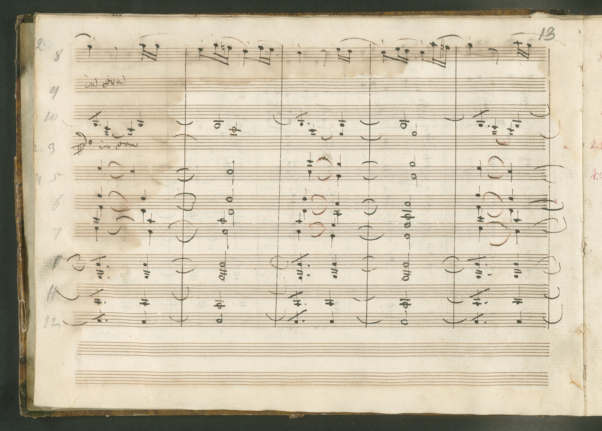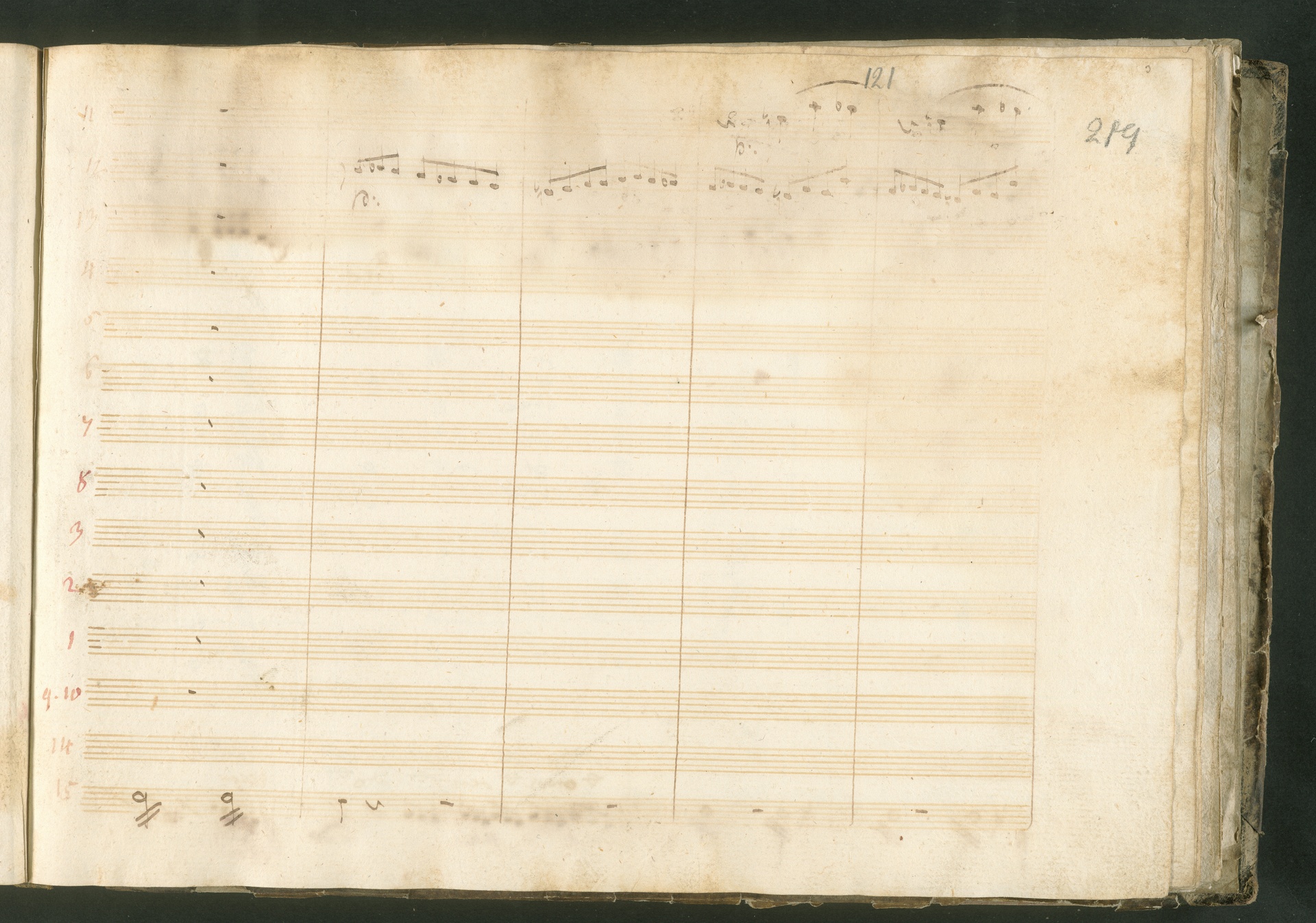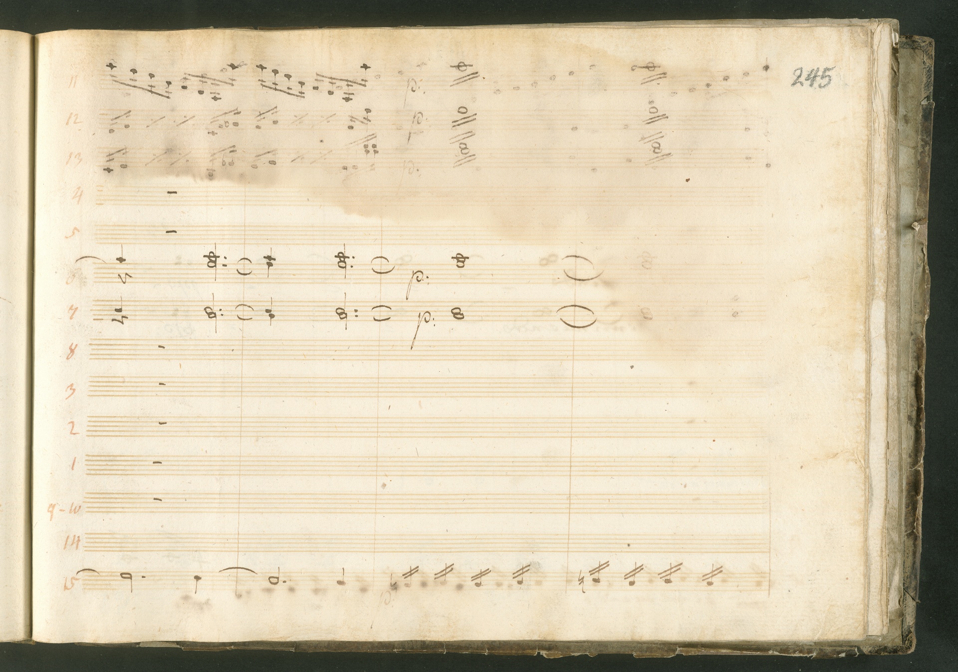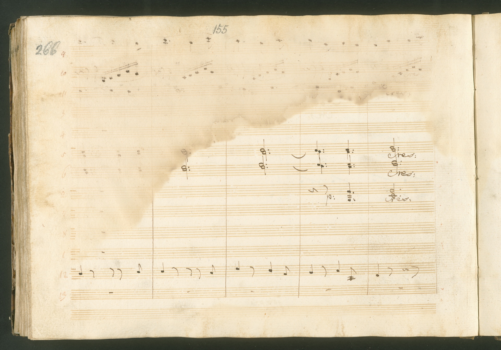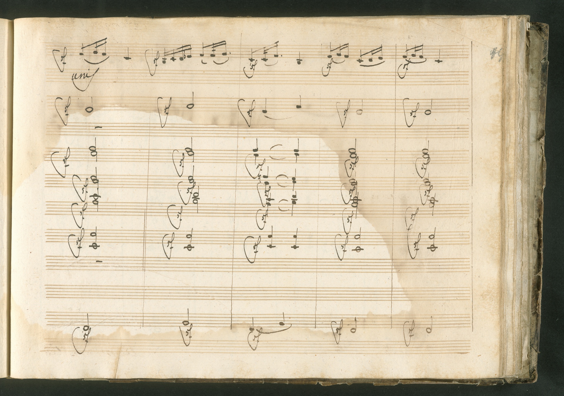 This copy of the score of the Sixth Symphony was removed from Breitkopf & Härtel's archives in the 1830s and was considered lost for a very long time. Even in the 1970s its whereabouts was still unknown. The copy only re-emerged in the 1980s and was acquired by the Beethoven-Haus. With its many corrections, which Beethoven made in a reddish-brown crayon and which the copyist partially went over in ink, it is a valuable document for research. Sadly the manuscript is in a very bad condition having been badly damaged by water; many pages in the last two movements are completely washed out and hardly legible anymore. (J.R.)
