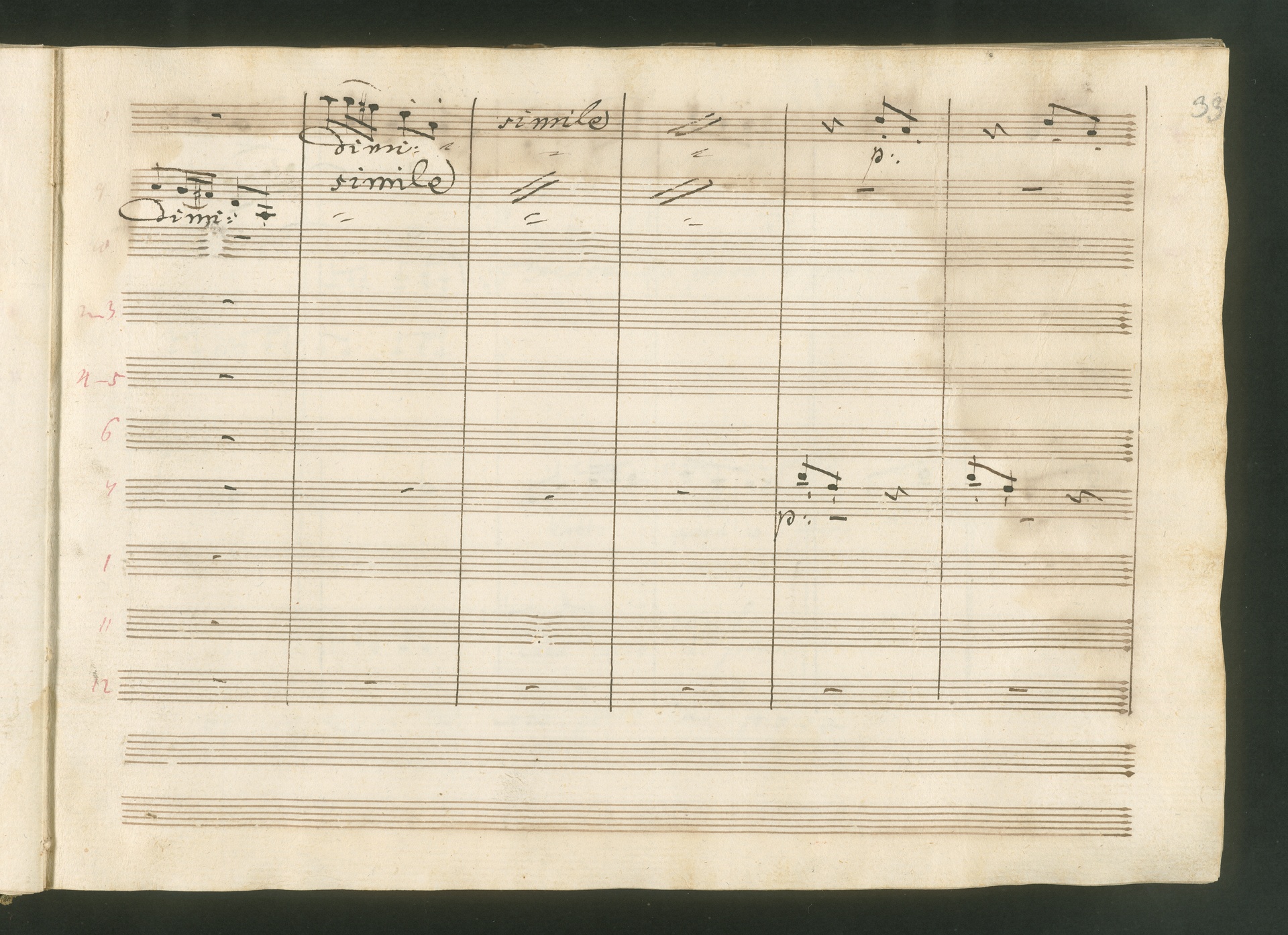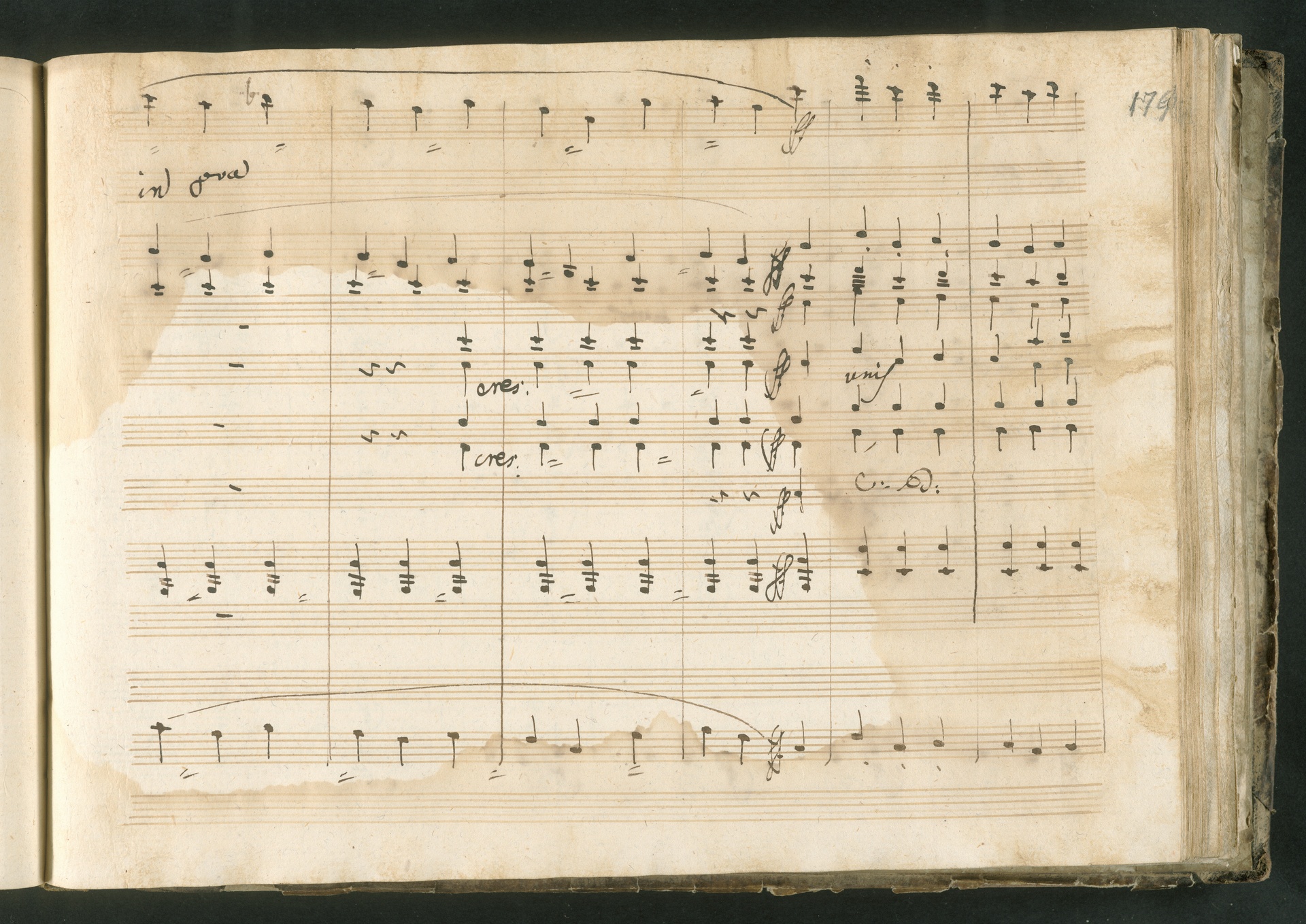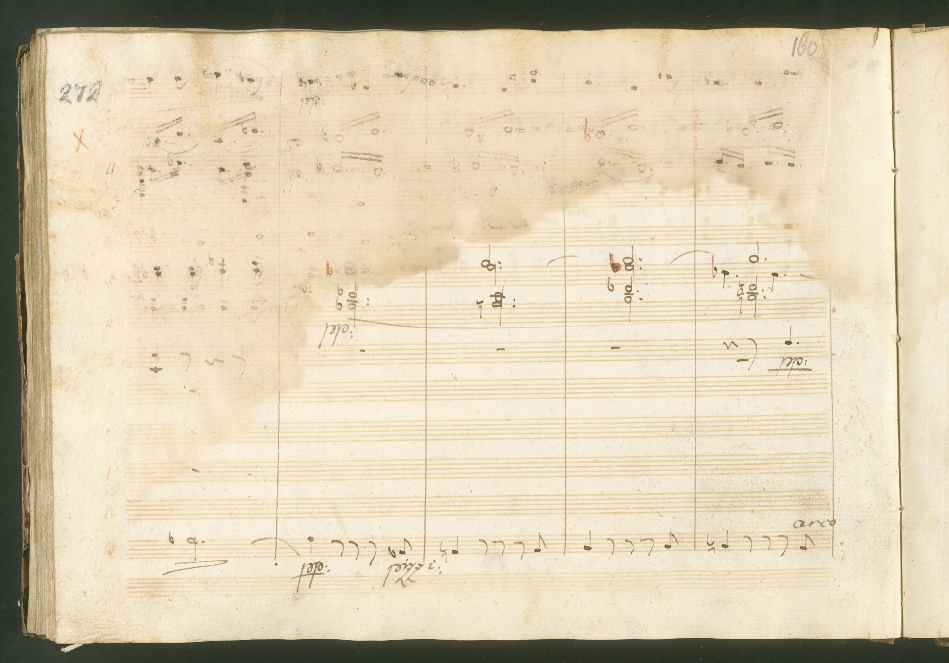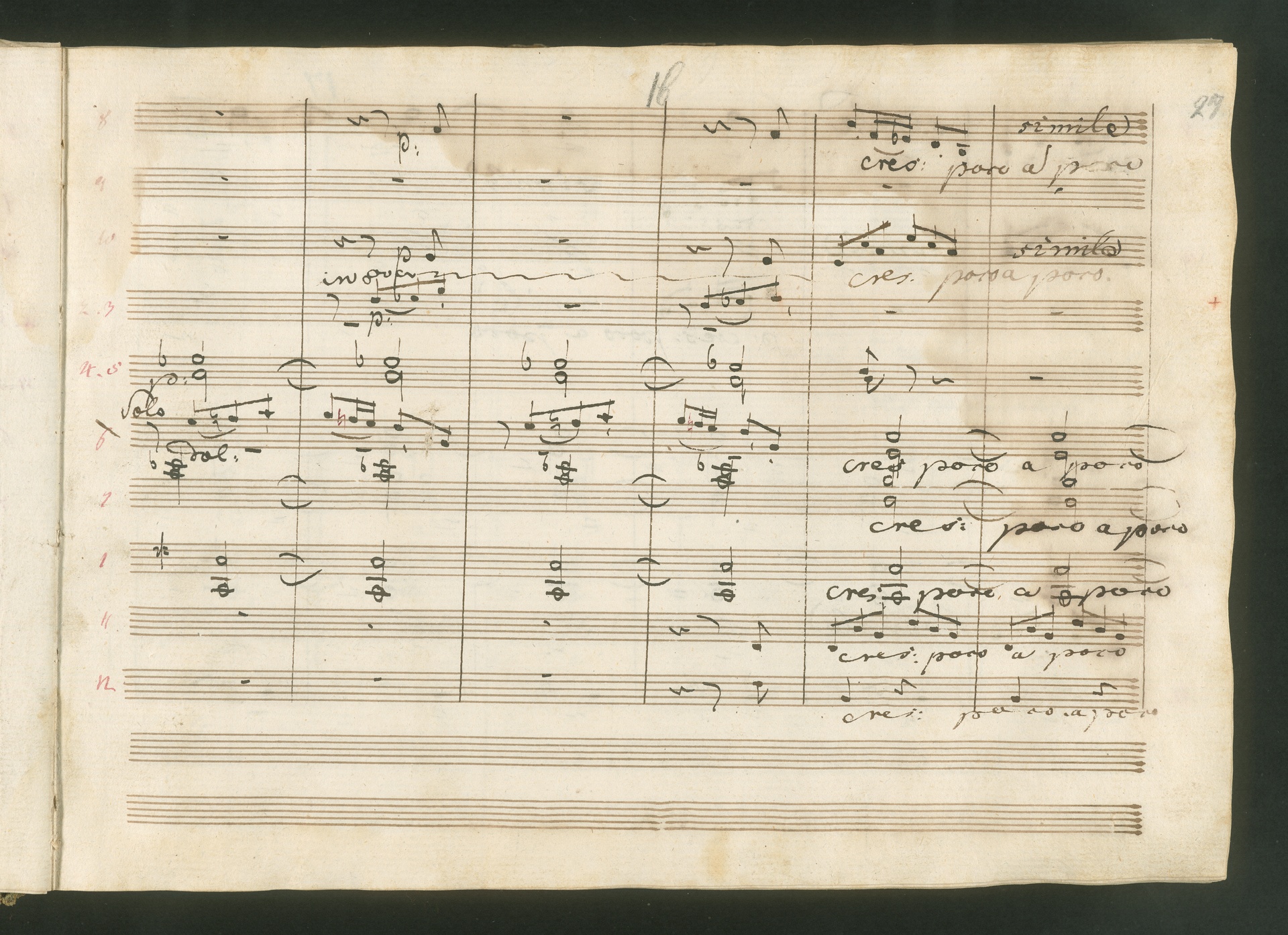 This copy of the score of the Sixth Symphony was removed from Breitkopf & Härtel's archives in the 1830s and was considered lost for a very long time. Even in the 1970s its whereabouts was still unknown. The copy only re-emerged in the 1980s and was acquired by the Beethoven-Haus. With its many corrections, which Beethoven made in a reddish-brown crayon and which the copyist partially went over in ink, it is a valuable document for research. Sadly the manuscript is in a very bad condition having been badly damaged by water; many pages in the last two movements are completely washed out and hardly legible anymore. (J.R.)