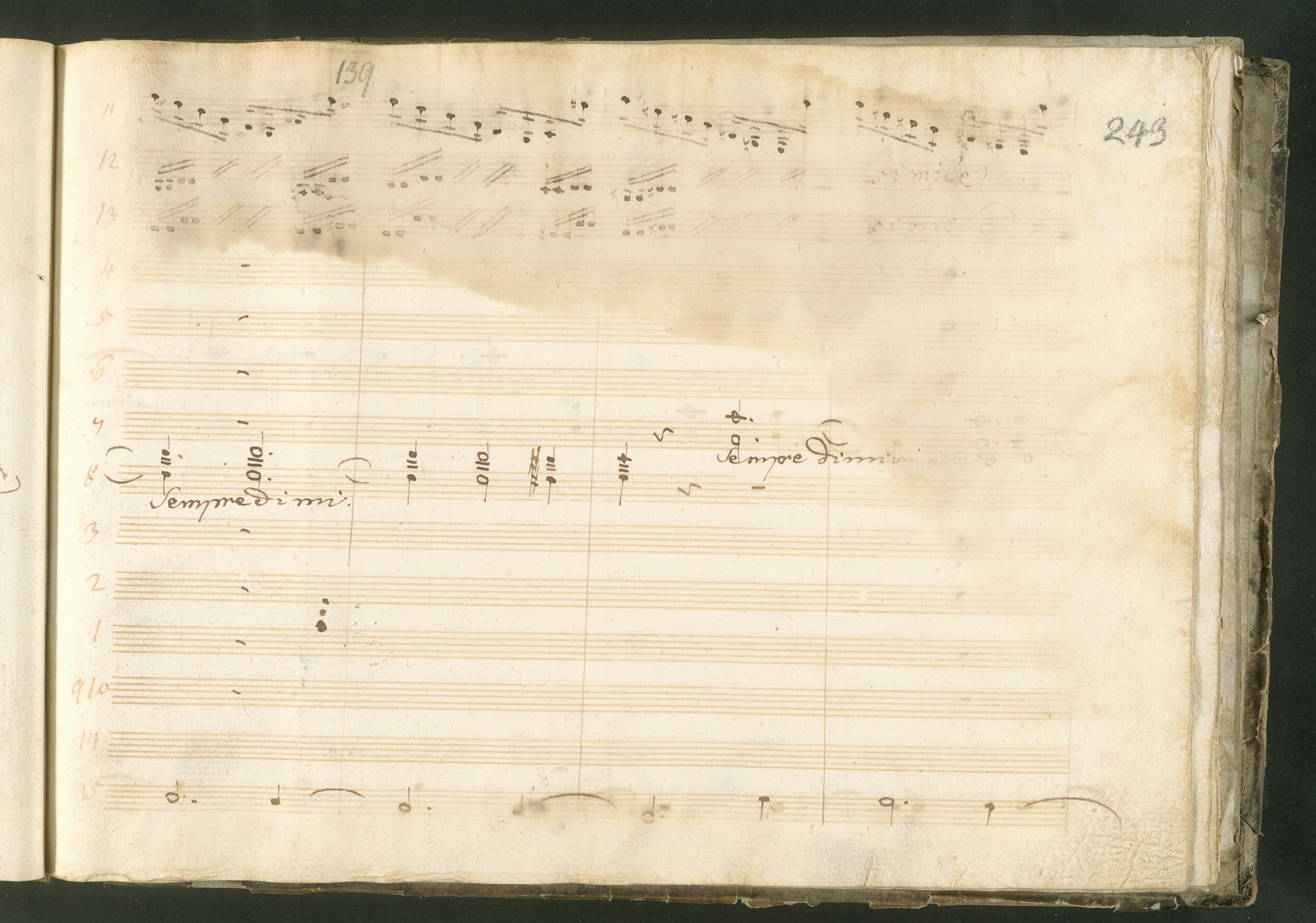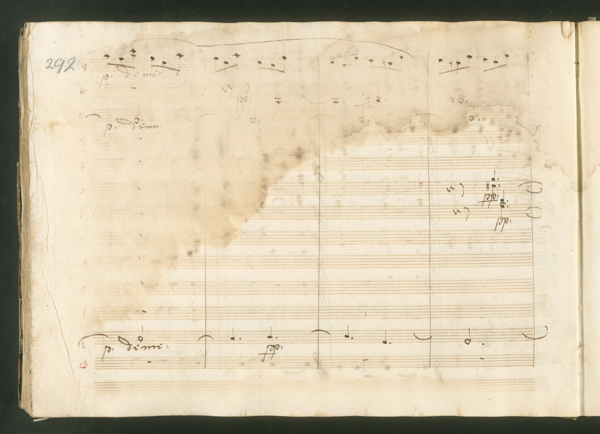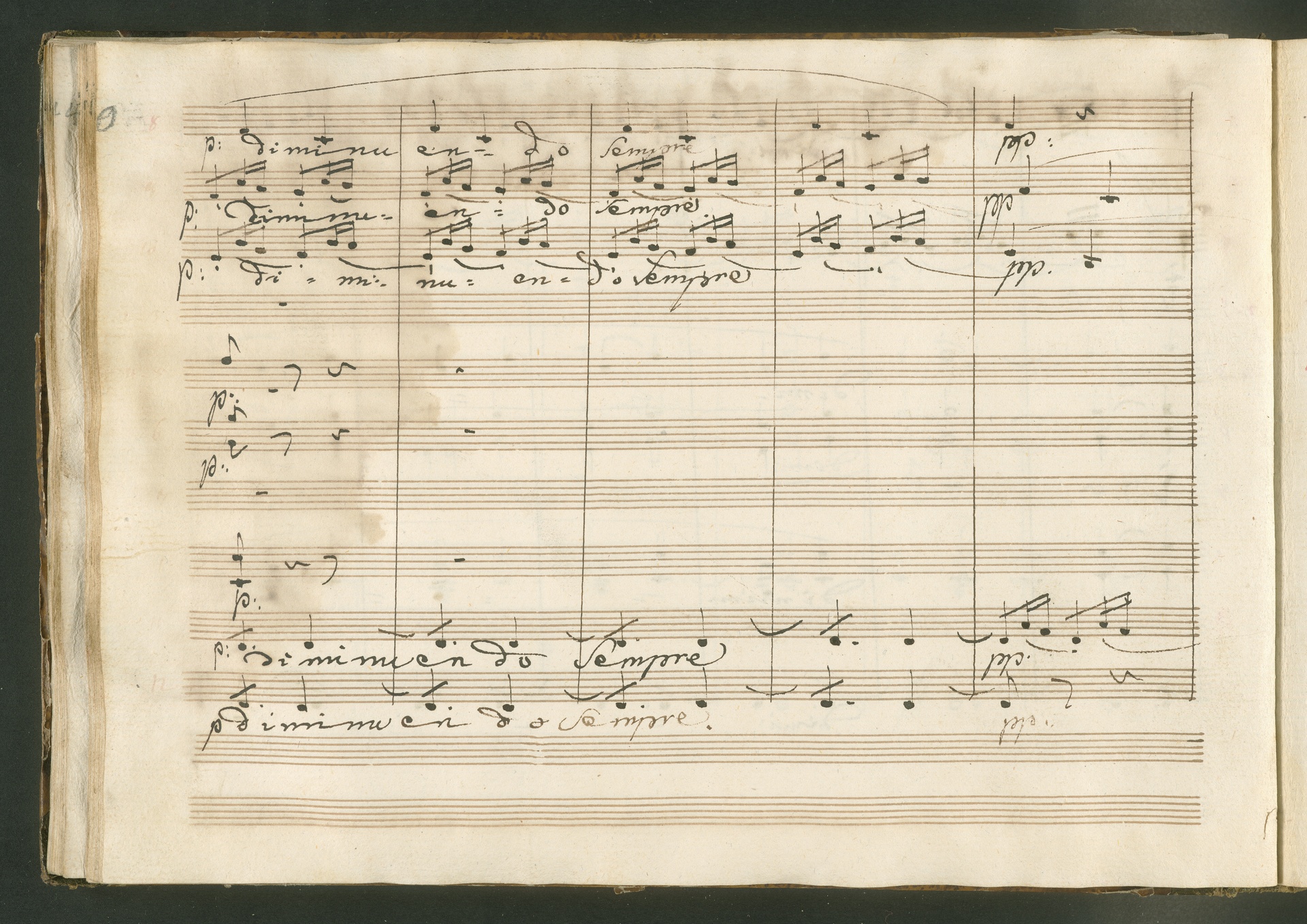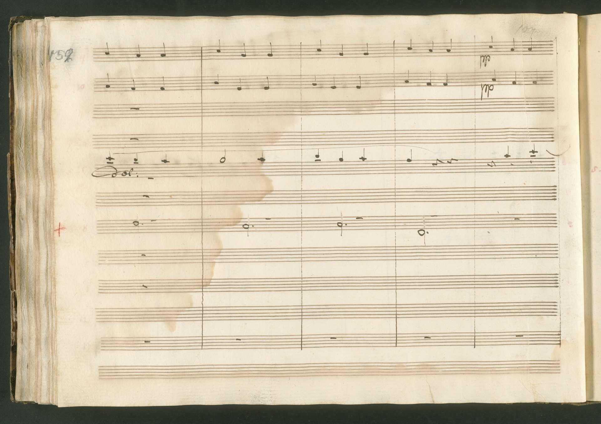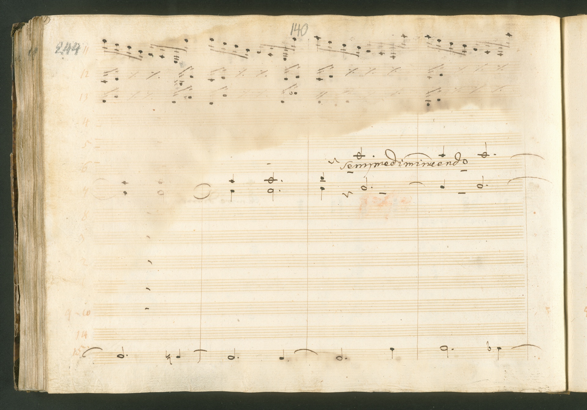 This copy of the score of the Sixth Symphony was removed from Breitkopf & Härtel's archives in the 1830s and was considered lost for a very long time. Even in the 1970s its whereabouts was still unknown. The copy only re-emerged in the 1980s and was acquired by the Beethoven-Haus. With its many corrections, which Beethoven made in a reddish-brown crayon and which the copyist partially went over in ink, it is a valuable document for research. Sadly the manuscript is in a very bad condition having been badly damaged by water; many pages in the last two movements are completely washed out and hardly legible anymore. (J.R.)