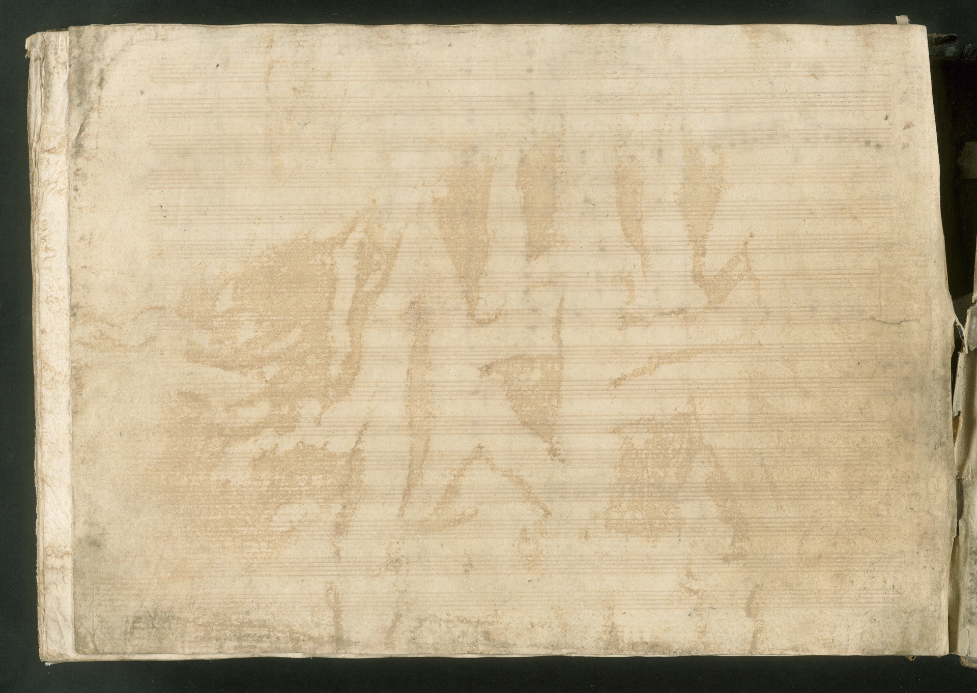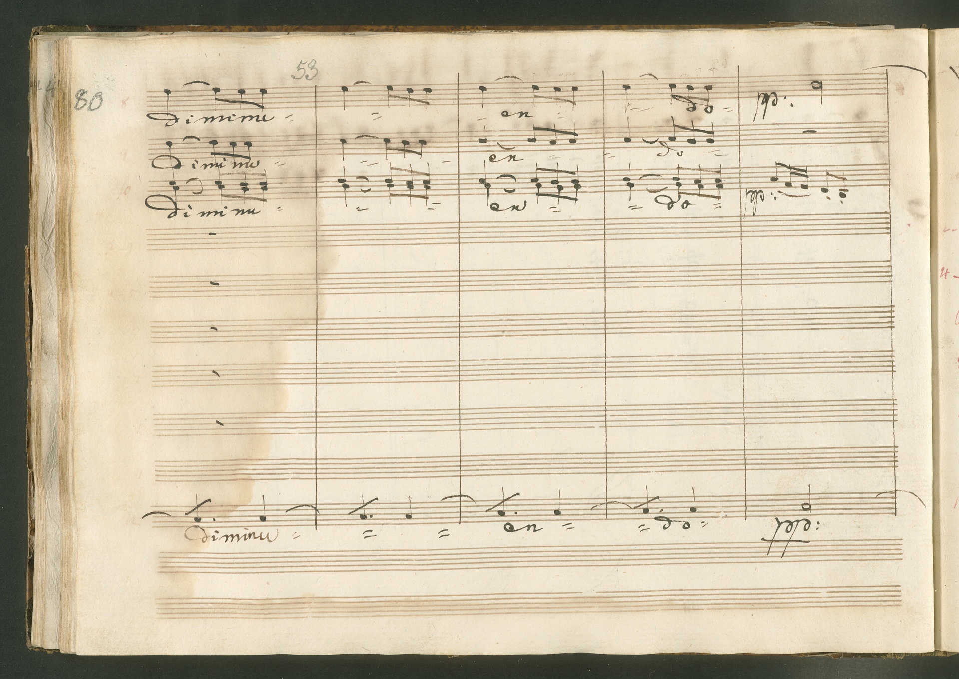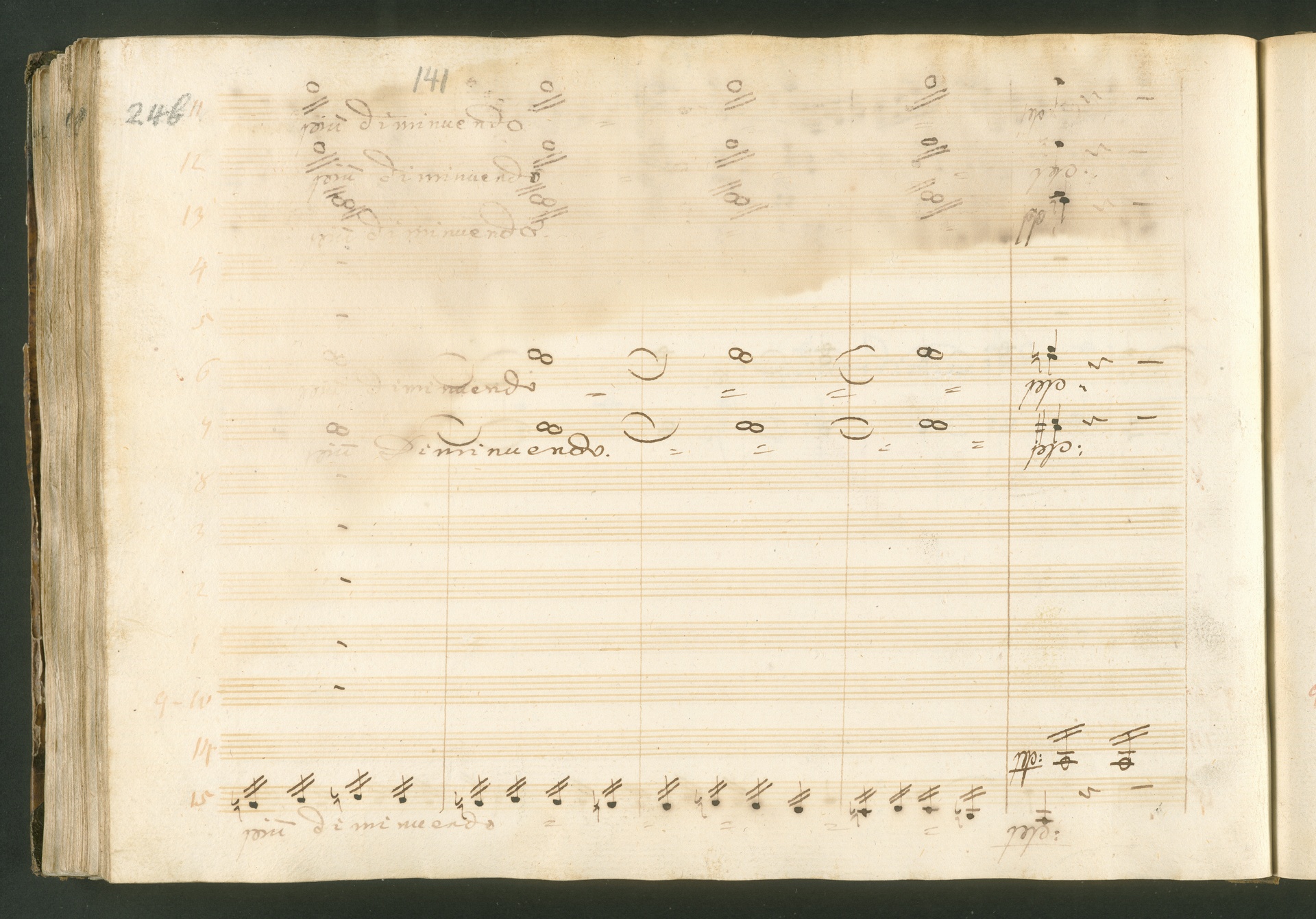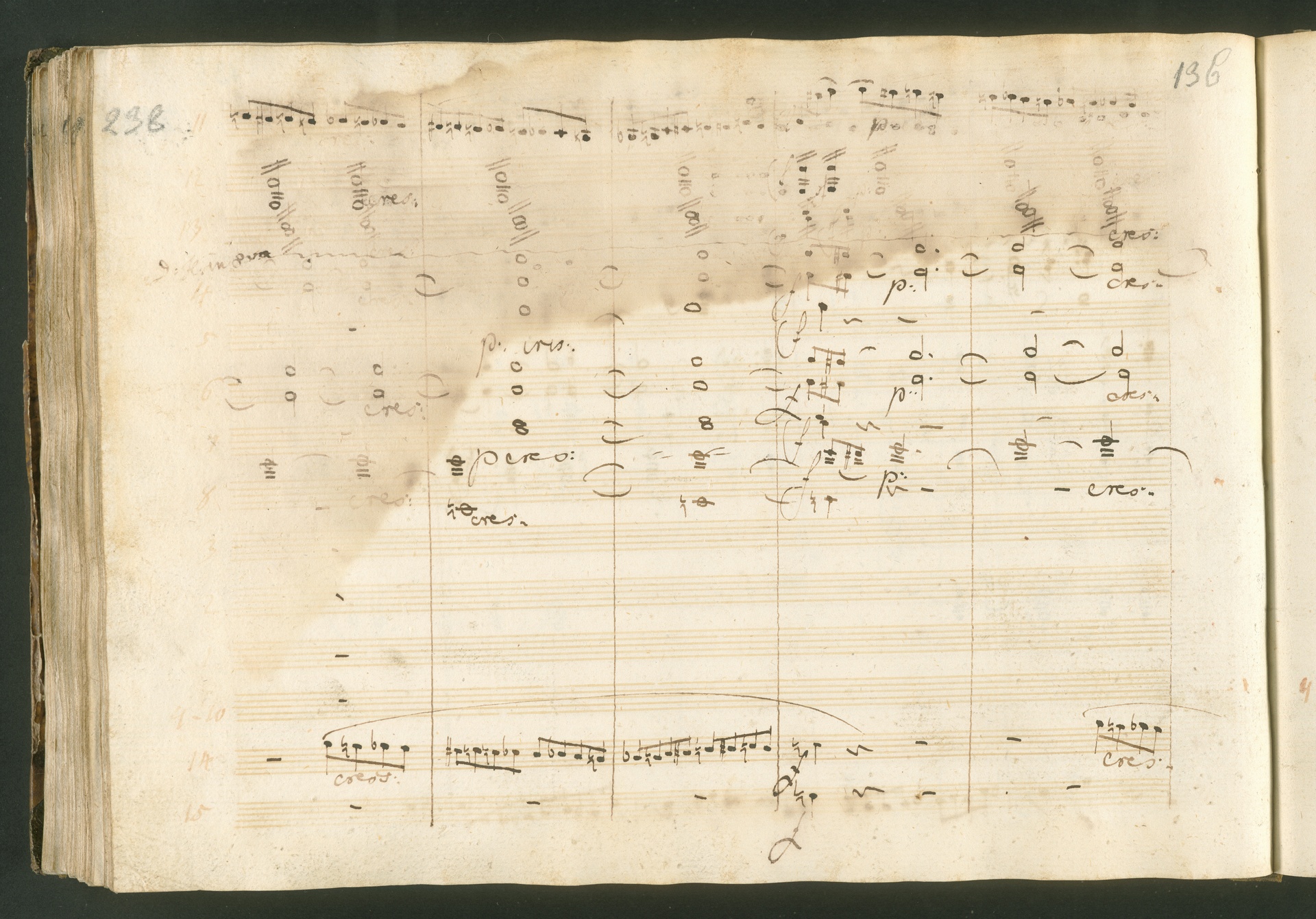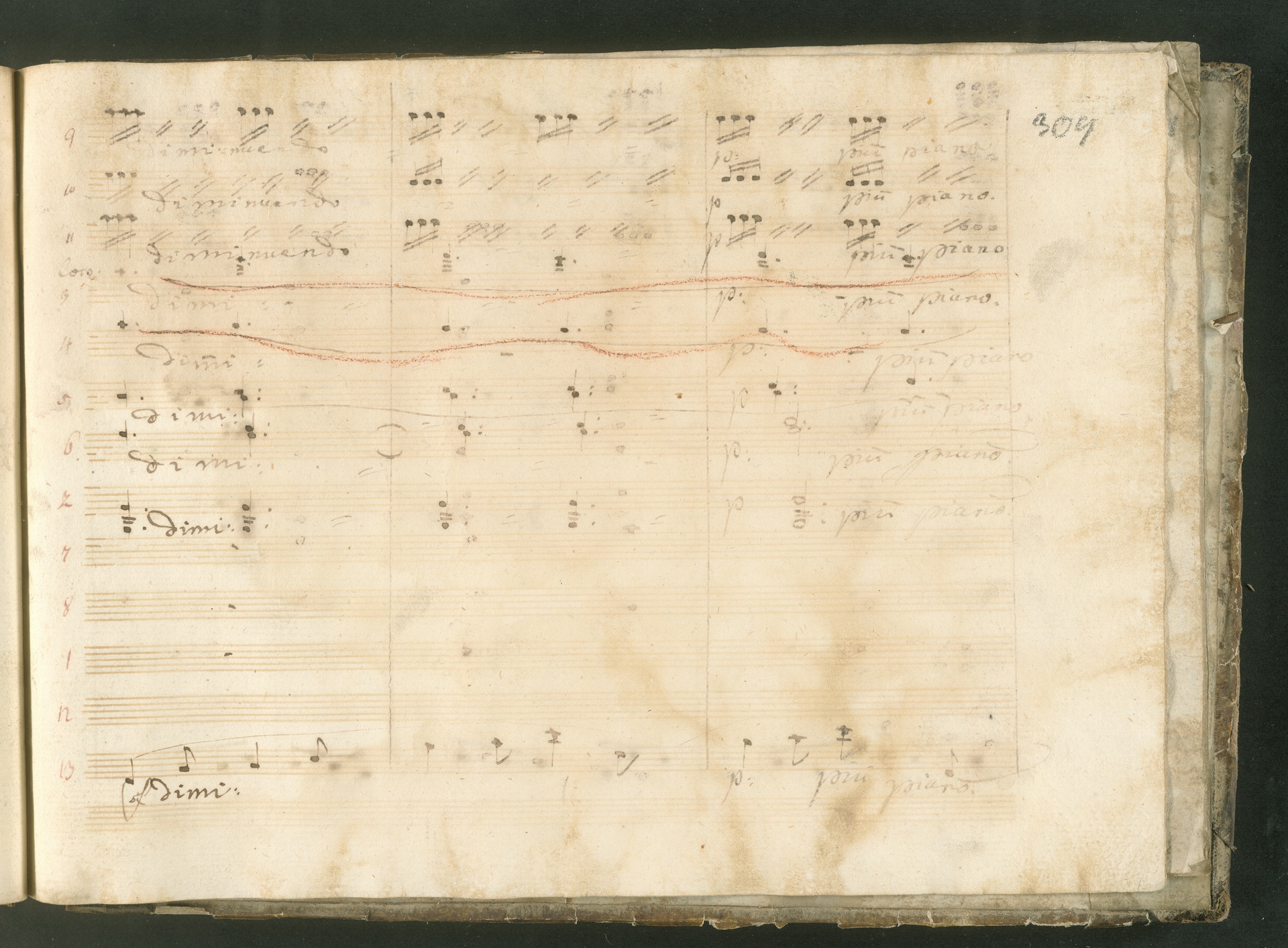 This copy of the score of the Sixth Symphony was removed from Breitkopf & Härtel's archives in the 1830s and was considered lost for a very long time. Even in the 1970s its whereabouts was still unknown. The copy only re-emerged in the 1980s and was acquired by the Beethoven-Haus. With its many corrections, which Beethoven made in a reddish-brown crayon and which the copyist partially went over in ink, it is a valuable document for research. Sadly the manuscript is in a very bad condition having been badly damaged by water; many pages in the last two movements are completely washed out and hardly legible anymore. (J.R.)