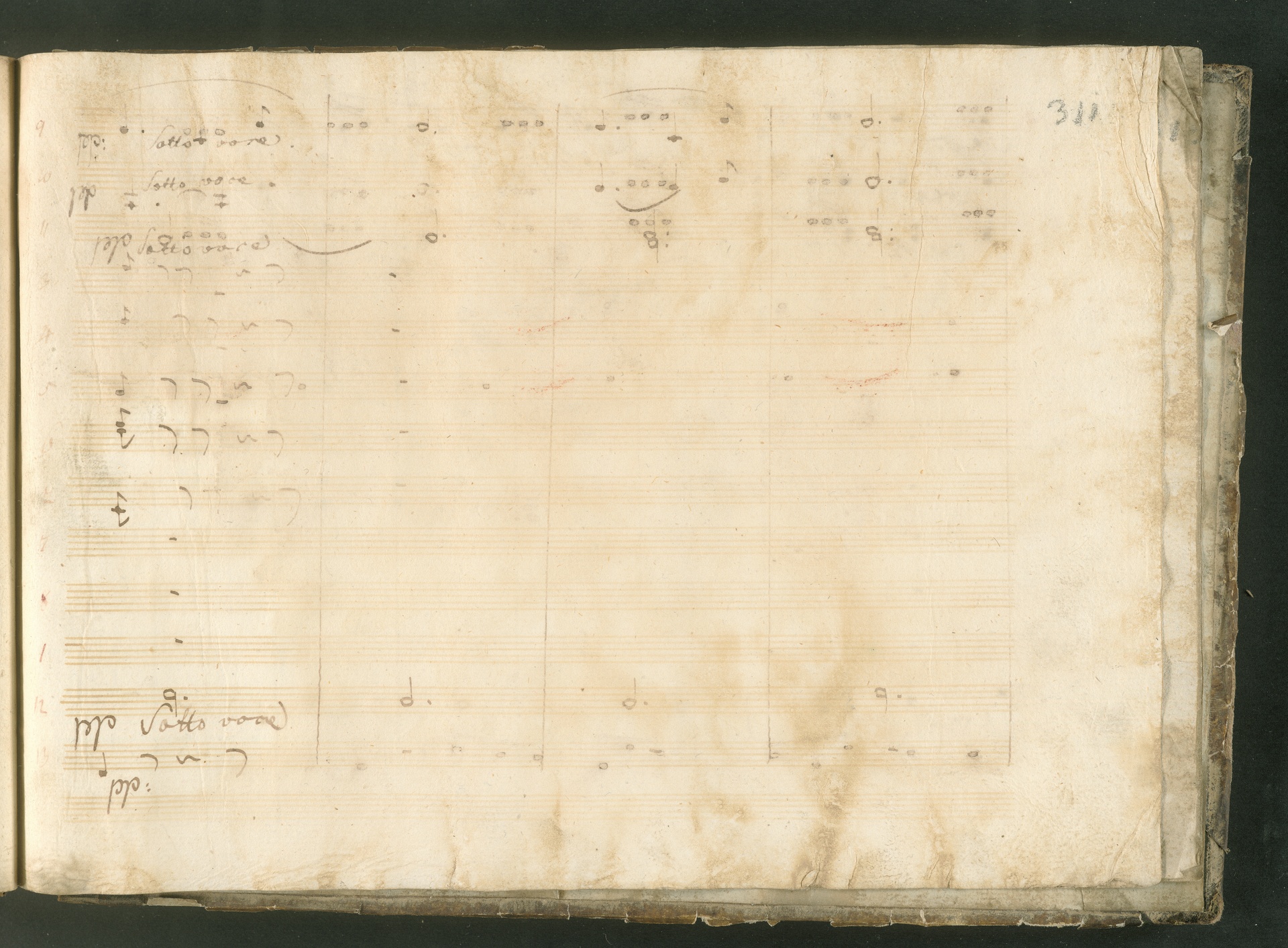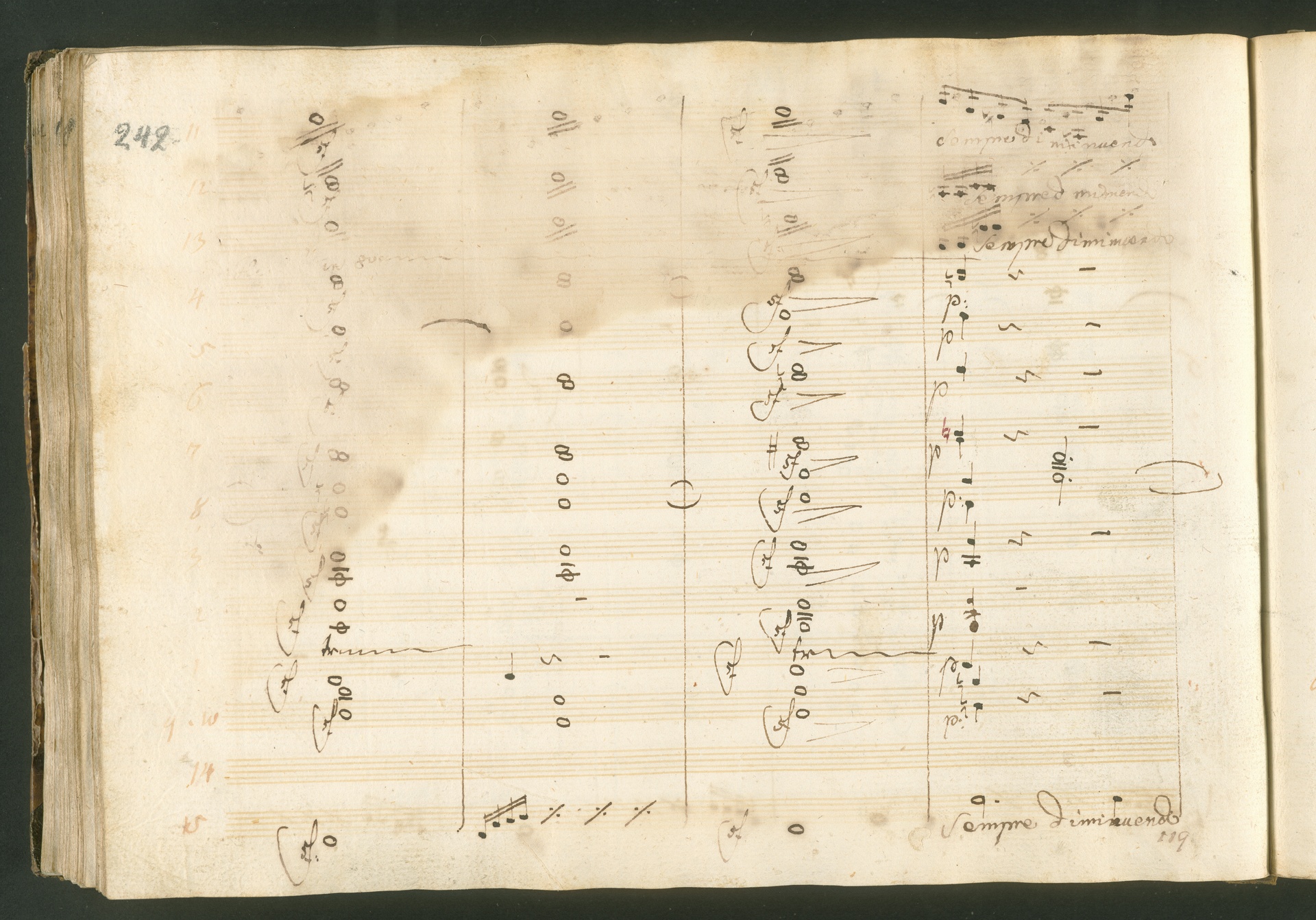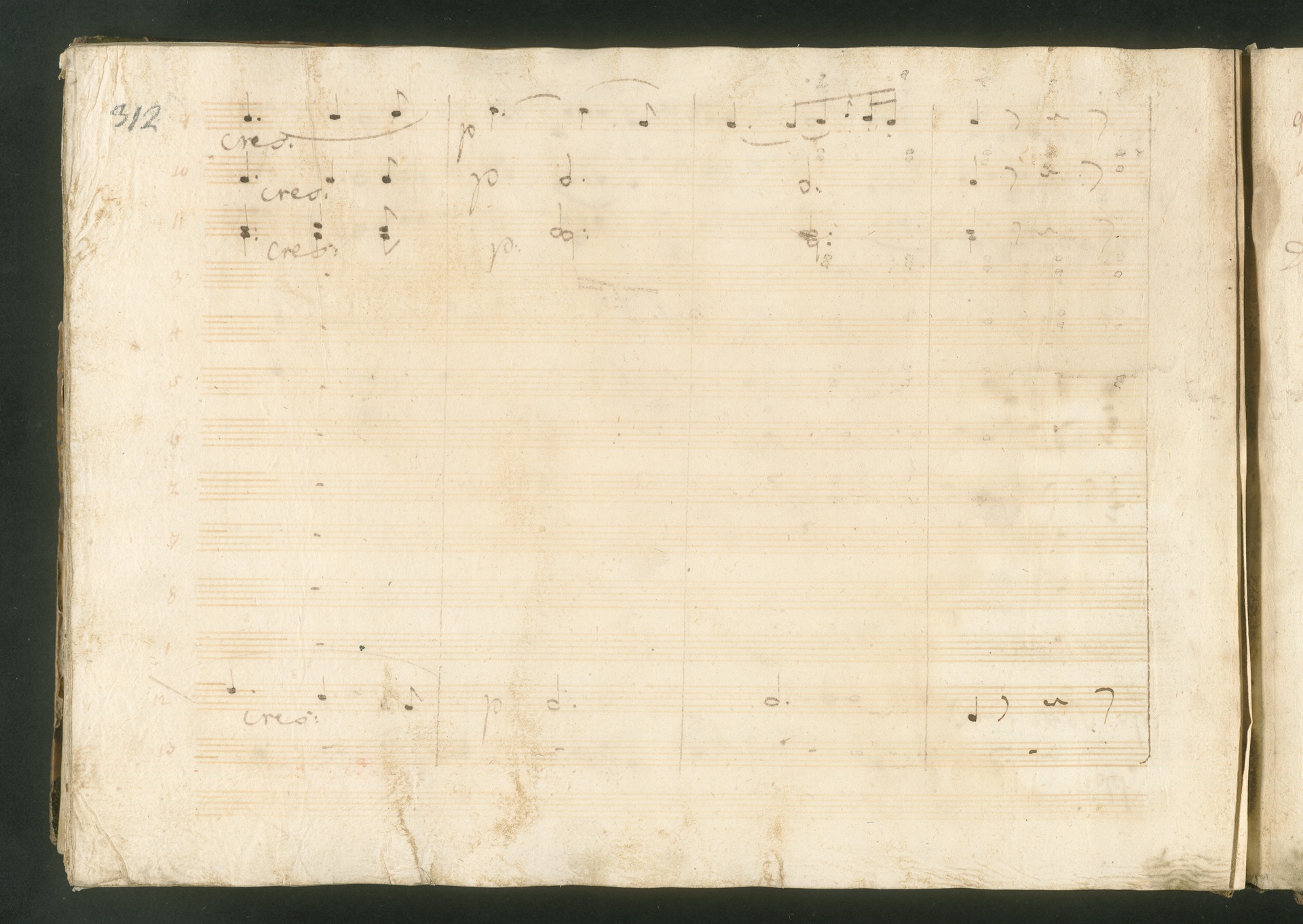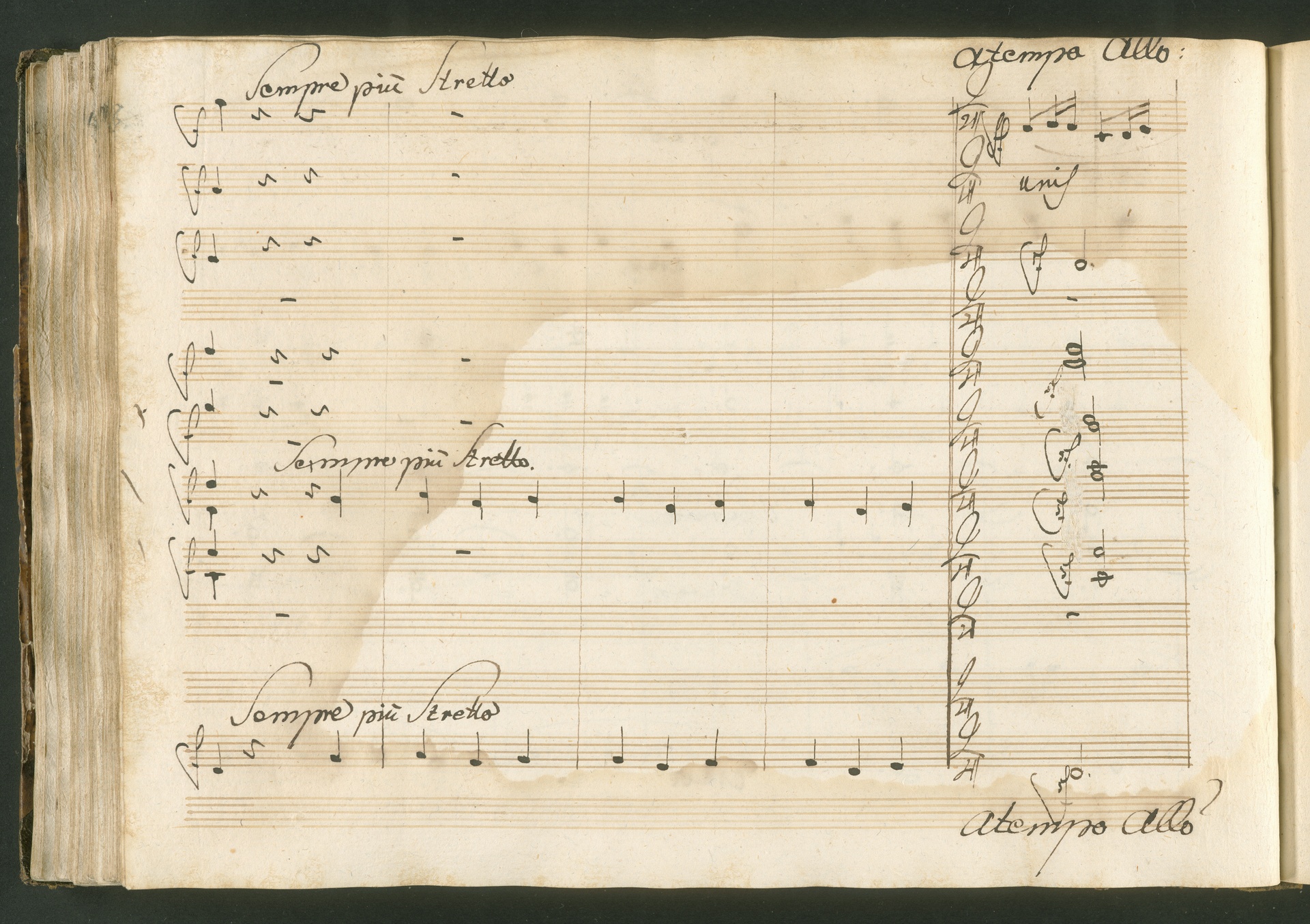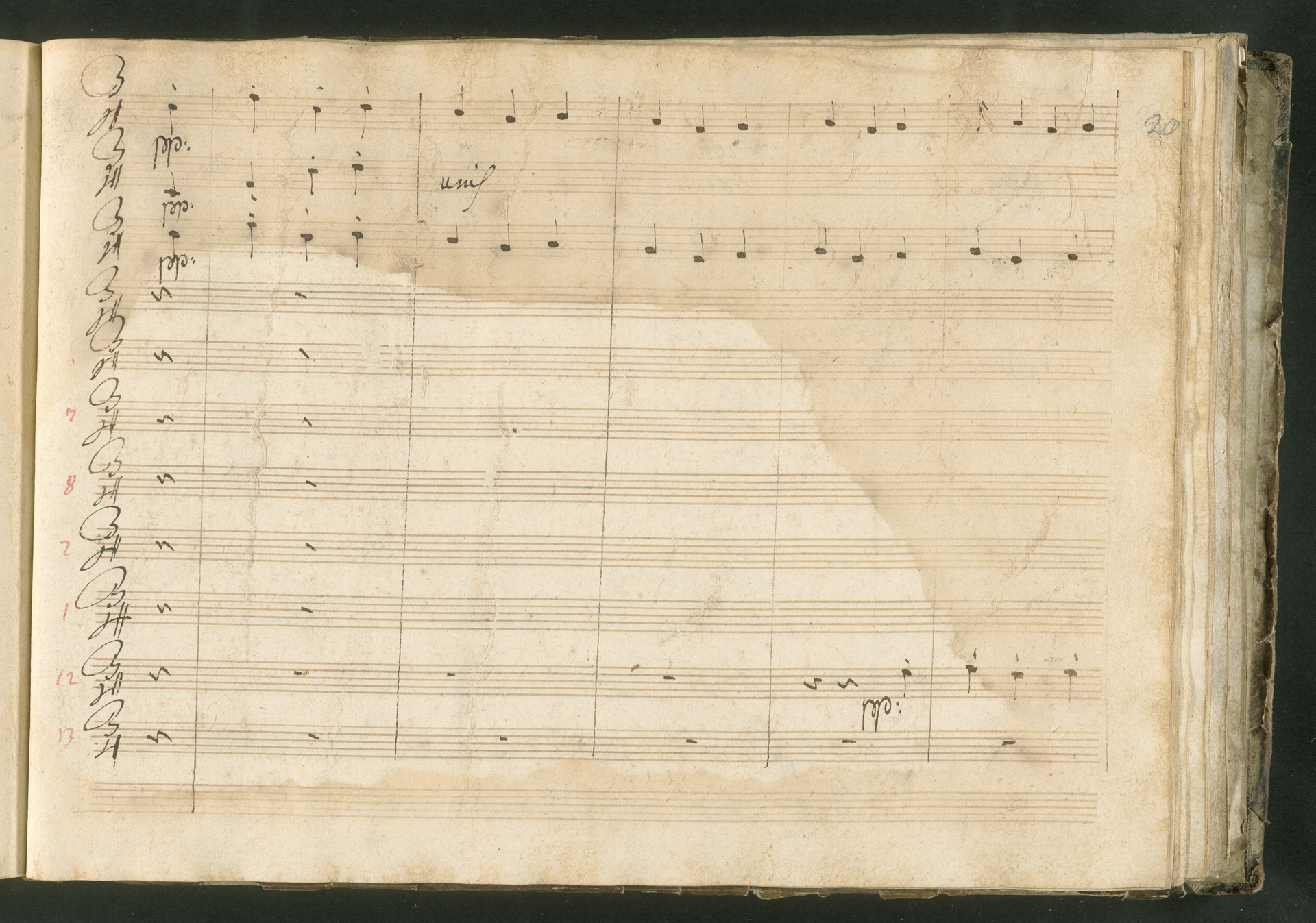 This copy of the score of the Sixth Symphony was removed from Breitkopf & Härtel's archives in the 1830s and was considered lost for a very long time. Even in the 1970s its whereabouts was still unknown. The copy only re-emerged in the 1980s and was acquired by the Beethoven-Haus. With its many corrections, which Beethoven made in a reddish-brown crayon and which the copyist partially went over in ink, it is a valuable document for research. Sadly the manuscript is in a very bad condition having been badly damaged by water; many pages in the last two movements are completely washed out and hardly legible anymore. (J.R.)