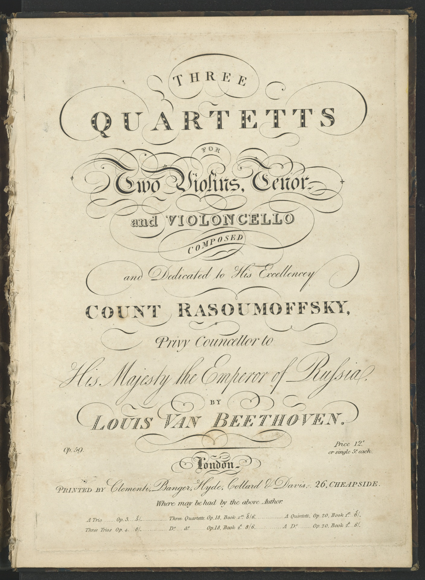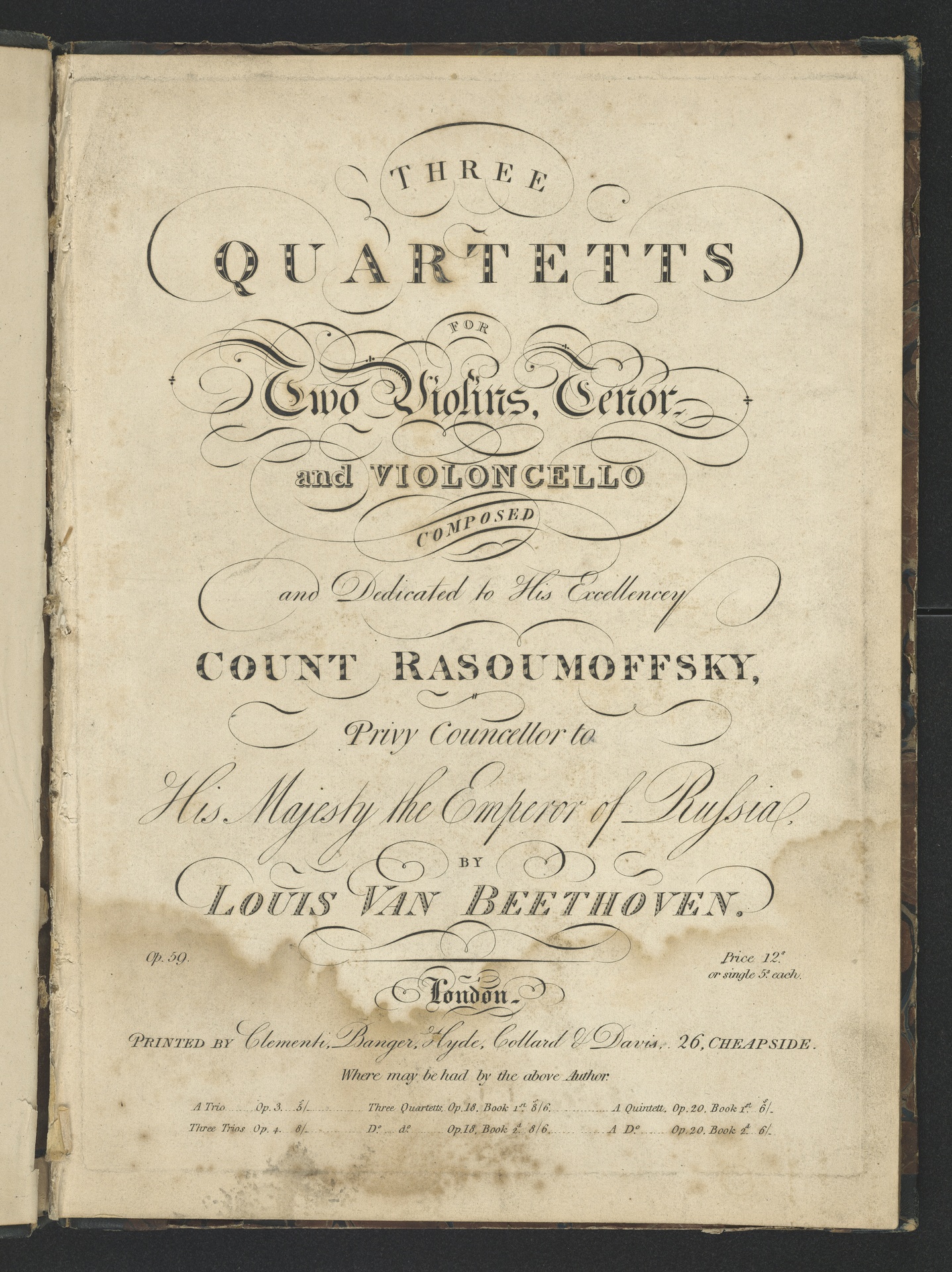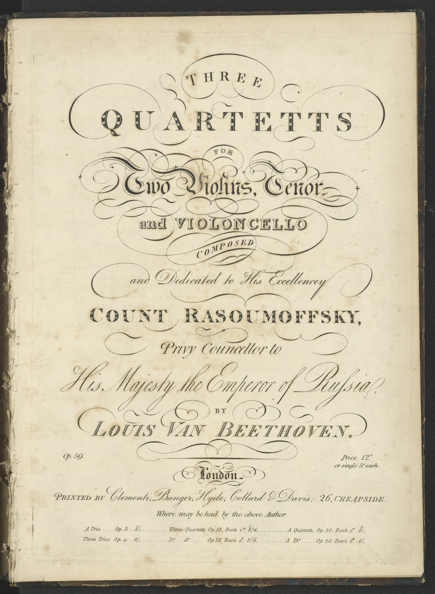 Ludwig van Beethoven, Quartette für 2 Violinen, Viola, Violoncello (F-Dur, e-Moll, C-Dur) op. 59, 1-3, Stimmen, Clementi
