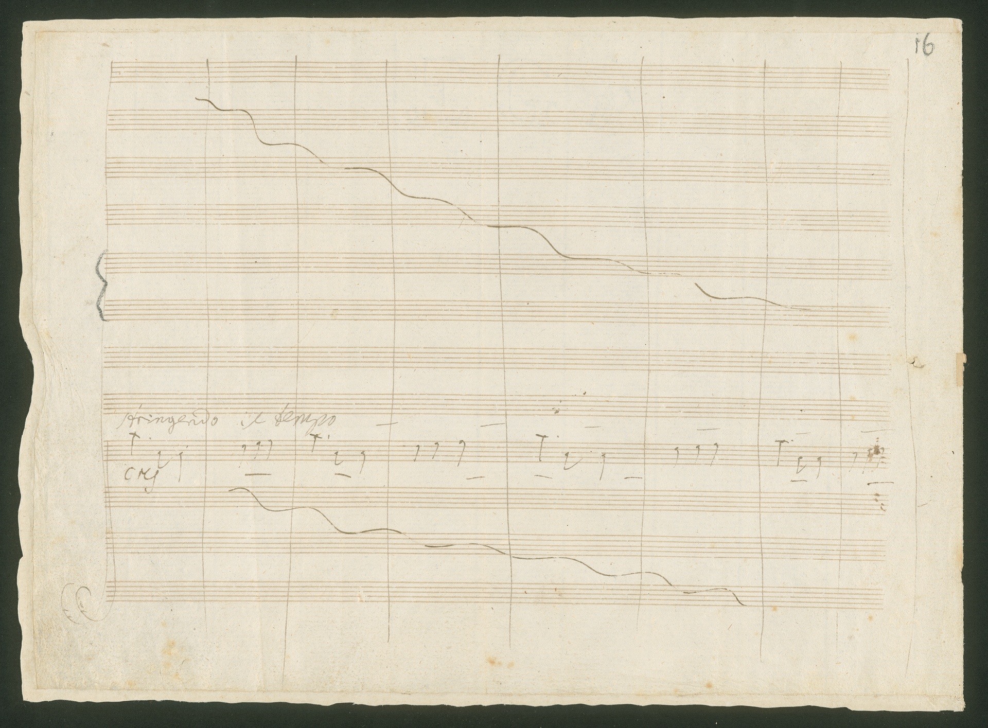Both of these autograph leaves, containing the coda for the second movement of the Ninth Symphony op. 125, were already separated in the nineteenth century. It was only in the mid twentieth century that they both landed, via different routes, in the collection of Hans Conrad Bodmer in Zurich, who in turn bequeathed them with his collection to the Beethoven-Haus in 1956. The paper on which the Coda is written is different to that of the autograph score (held in Berlin). The rastrology is also different: the coda only has twelve systems. The two leaves with the coda are the manuscript which Beethoven sent to his copyist Peter Gläser at a later stage. Beethoven sent a letter to Gläser on the subject shortly after 19 April 1824, "I am sending you the second movement too, so that the coda may be added as well. The coda has not been altered; it was only due to my forgetfulness that it was not added at once." (From the translation by Emily Anderson, 1961.) (J.R.)