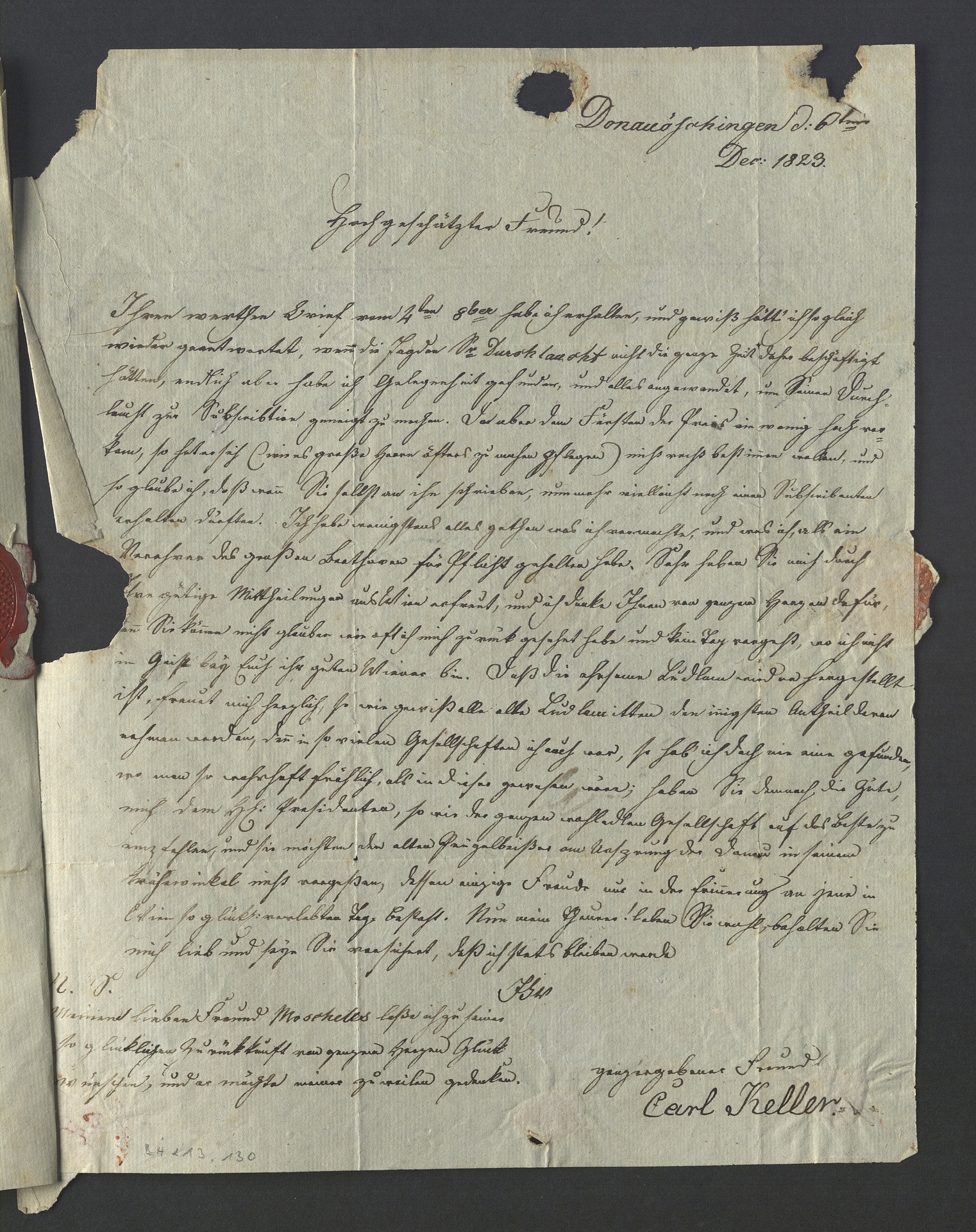 Carl Keller, Brief an Anton Schindler in Wien, Donaueschingen, 6. Dezember 1823