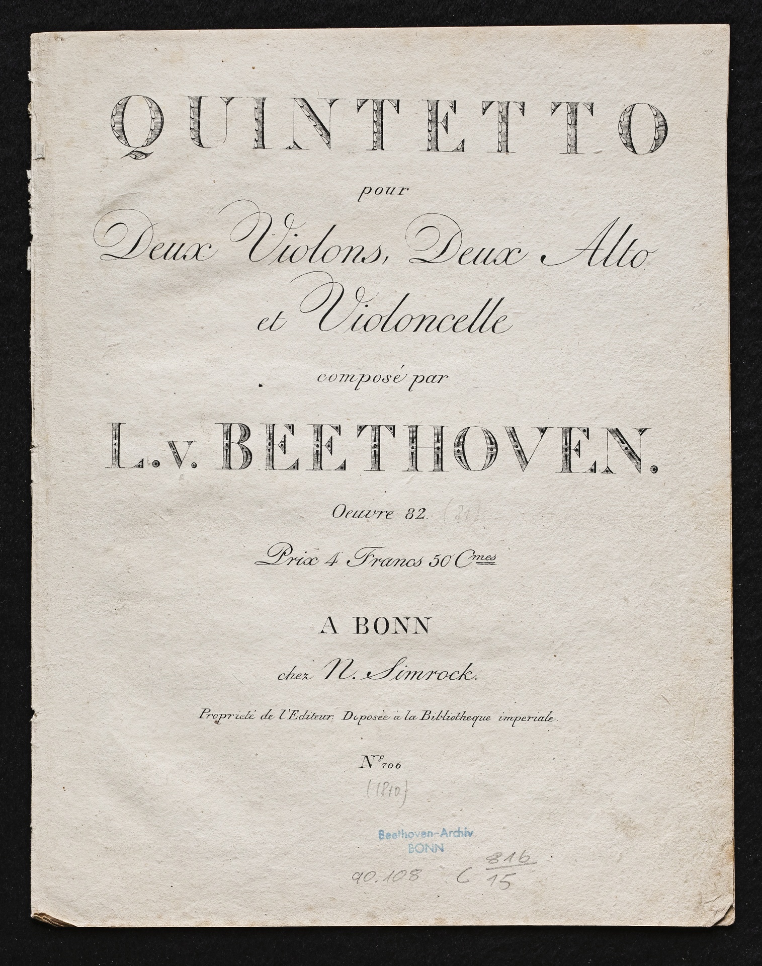 Ludwig van Beethoven, Sextett für 2 Violinen, Viola, Violoncello und 2 Hörner (Es-Dur) op. 81b, Bearbeitung für 2 Violinen, 2 Violen und Violoncello, Stimmen, Simrock, 706