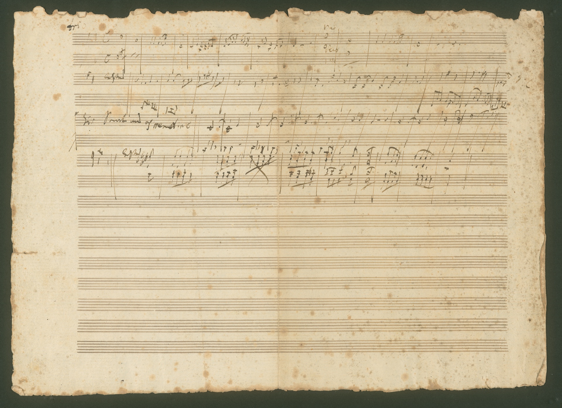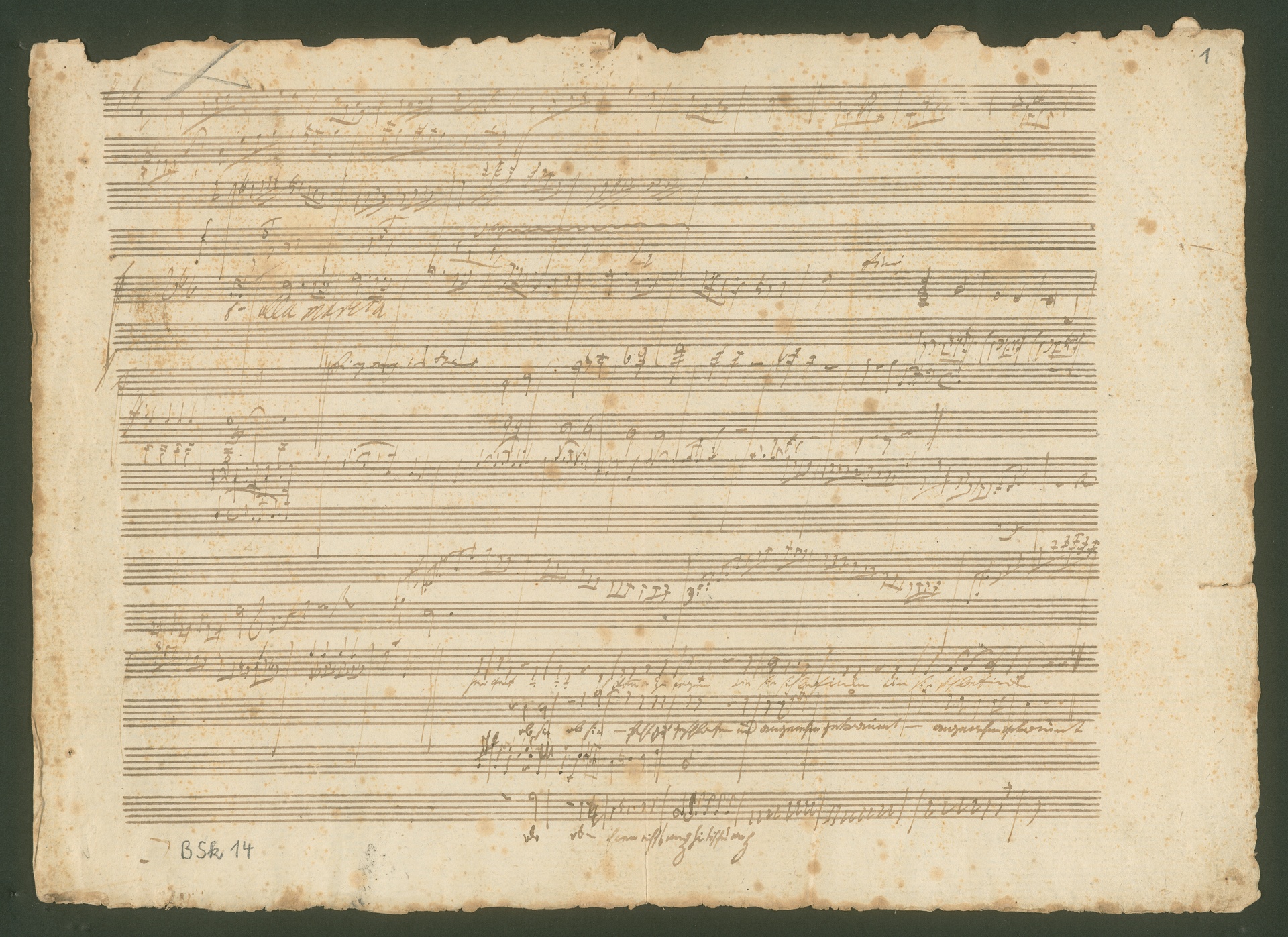 This sketch leaf is probably from the year 1797 and mainly contains sketches for unidentified works or ones which were not performed. On the front on the lower four staves Beethoven wrote down a three-part canon with the words, "Herr Graf, ich komme zu fragen wie Sie sich befinden, ob sie gut geschlafen und angenehm geträumt (...)" ("Dear Count, I come to ask how you are, whether you slept well and [had] pleasant dreams (...)"). The text leads one to believe that the Count referred to was Beethoven's friend Nikolaus Zmeskall, whom he often called the "musical Count". Zmeskall was a Hungarian official who carried out countless small tasks and everyday favours for Beethoven. He was also an amateur musician and a good cellist. Beethoven often sent him short messages, partly in the form of jokes as with this canon, to arrange a meeting or to request a favour. (J.R.)