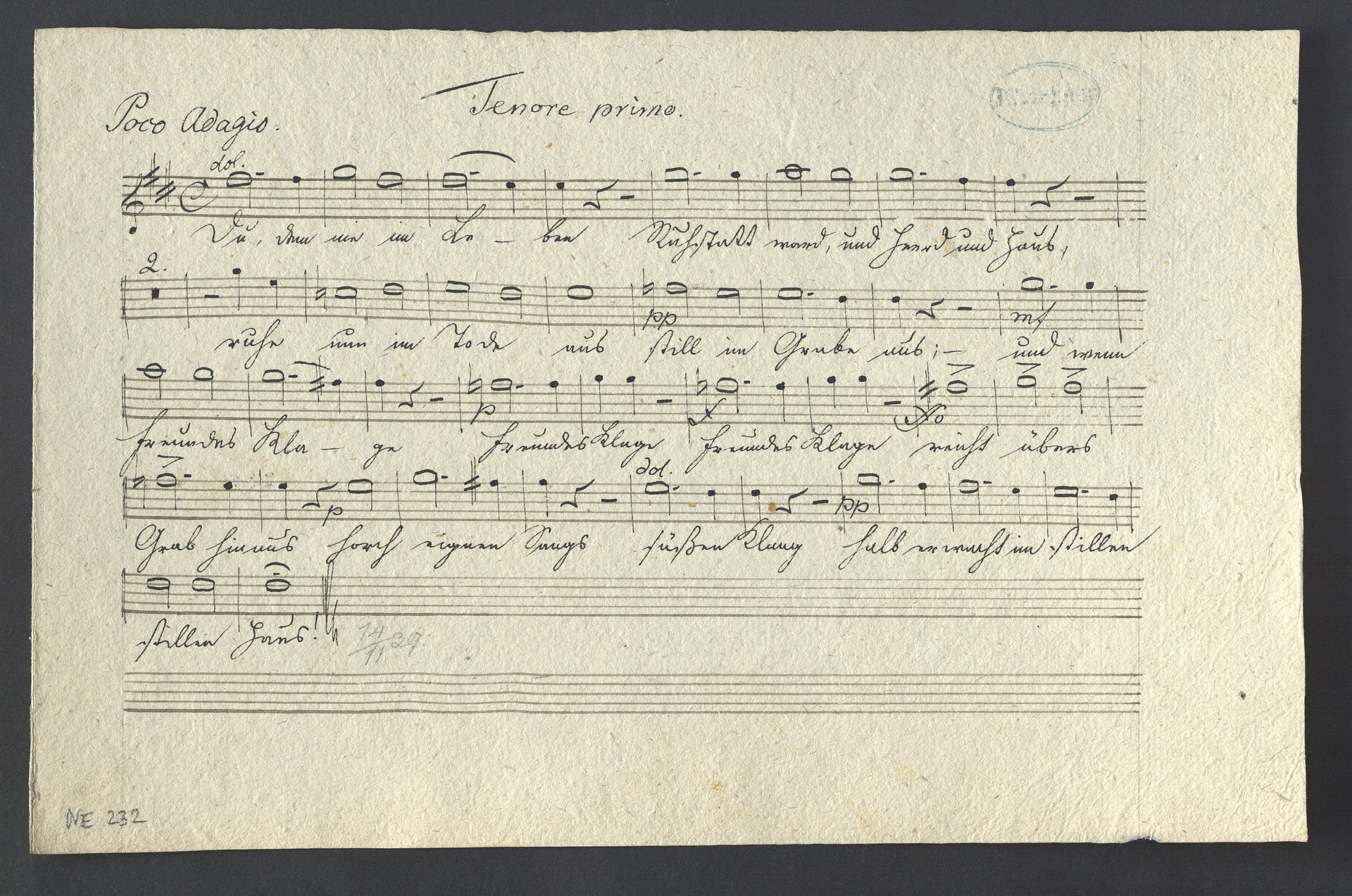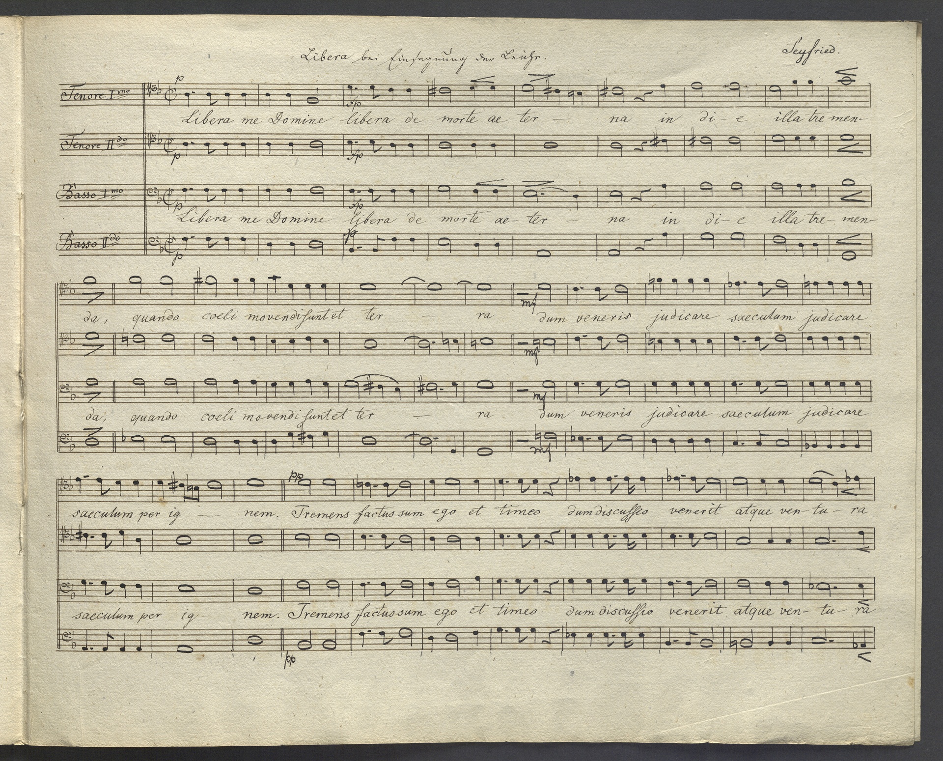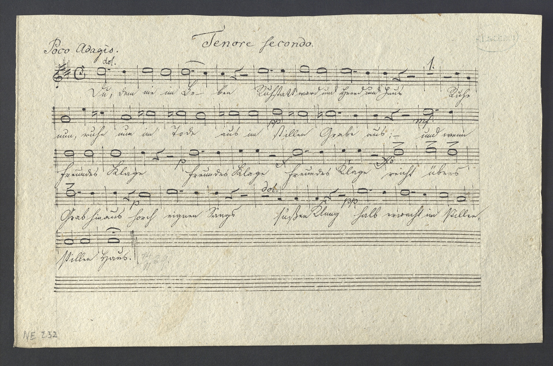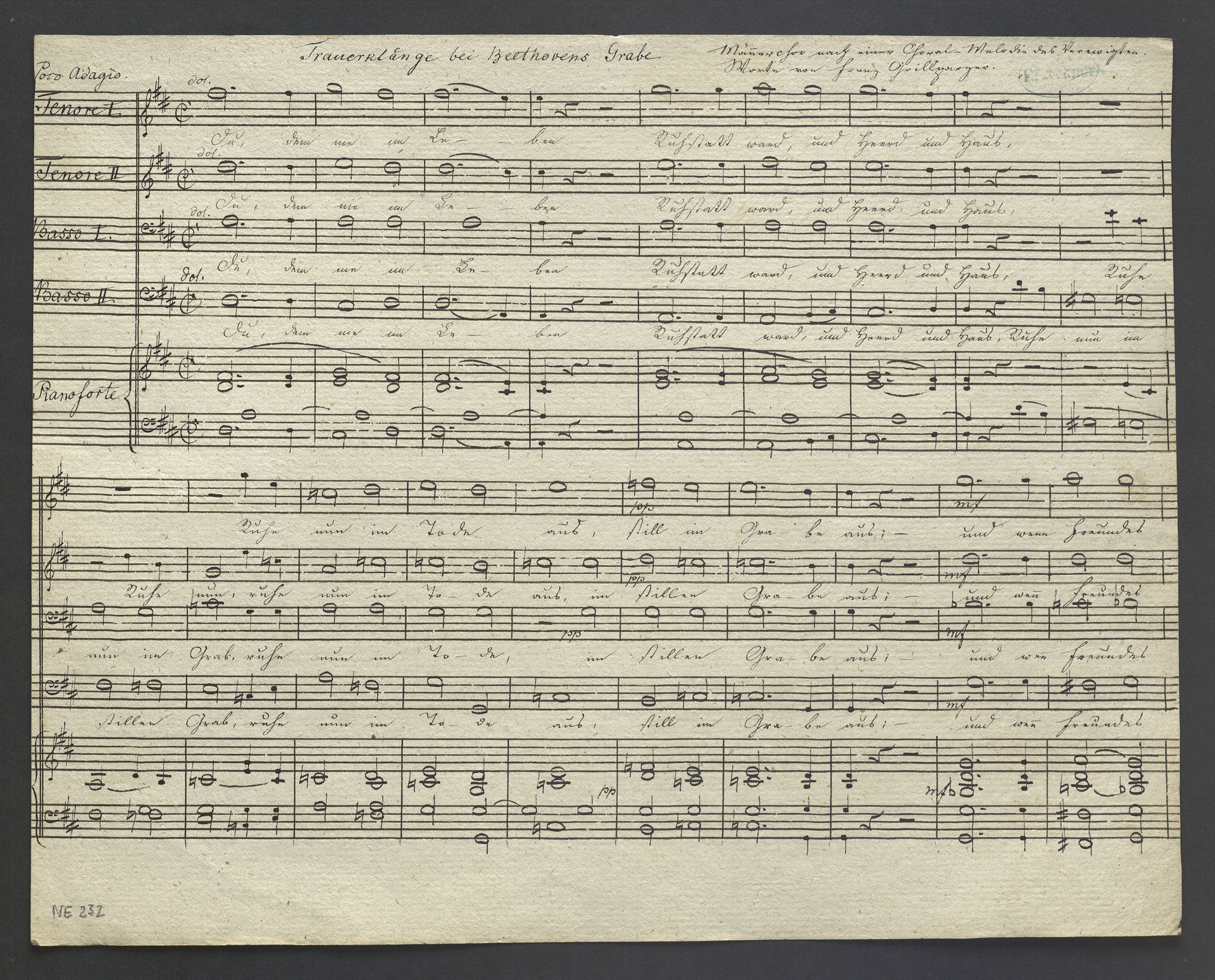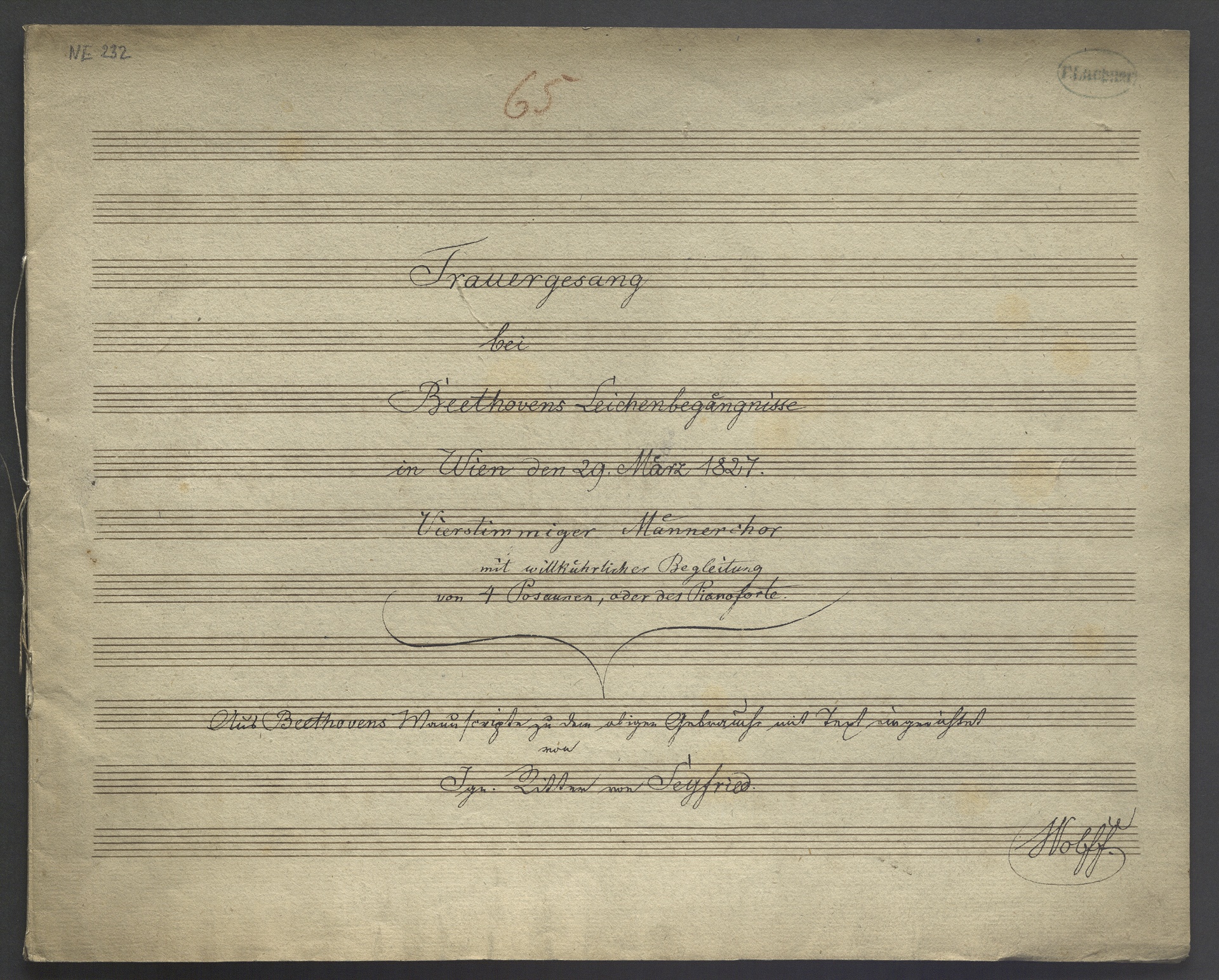 Ludwig van Beethoven, Equale für vier Posaunen (d-Moll, D-Dur, B-Dur) WoO 30, Bearbeitung von Ignaz von Seyfried für Männerchor, vier Posaunen oder Klavier, Partitur, Stimmen, Abschrift