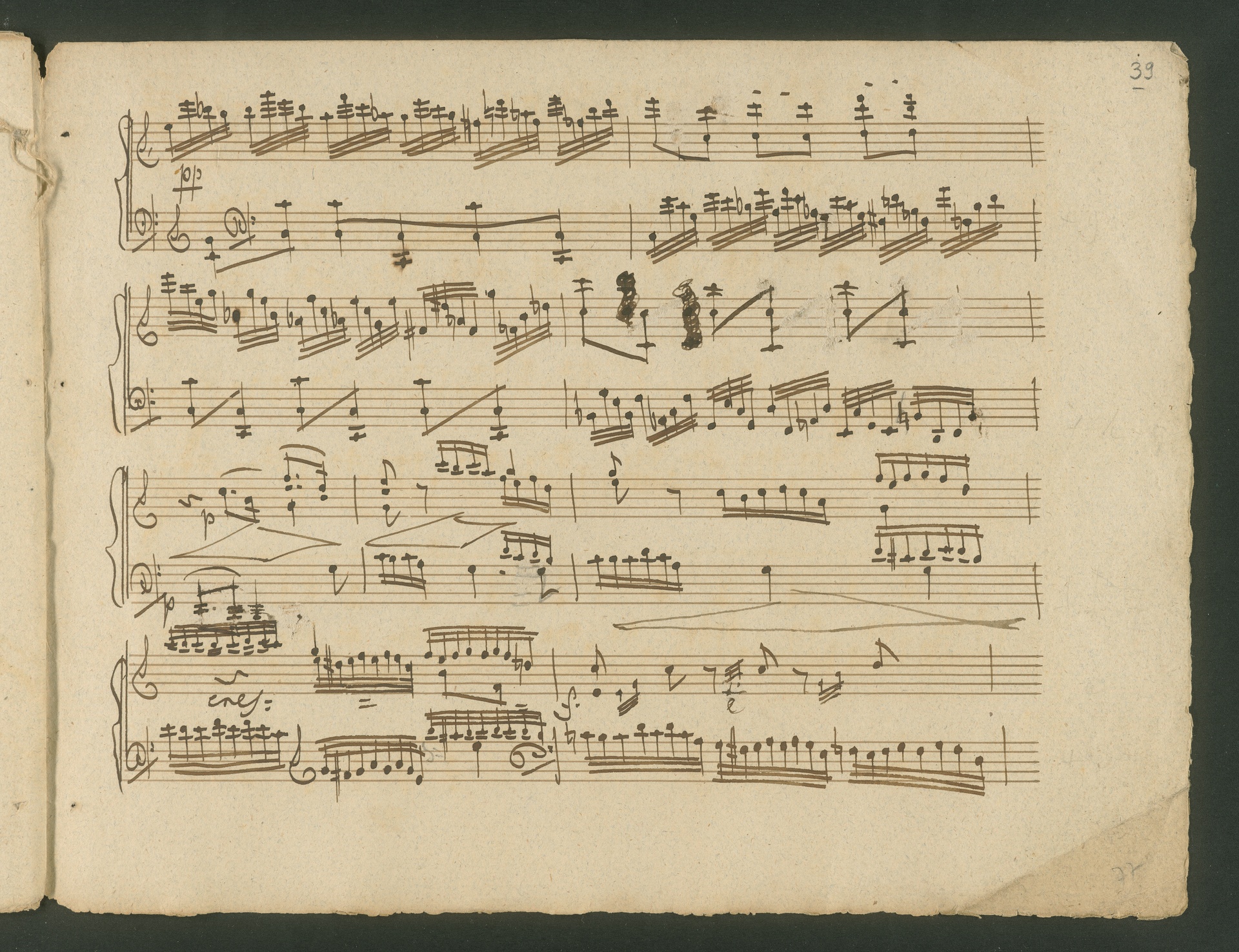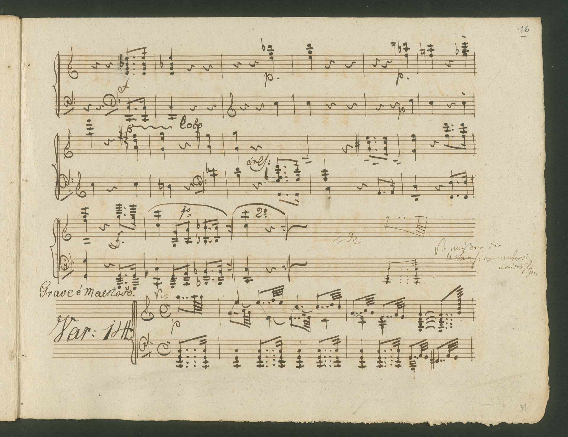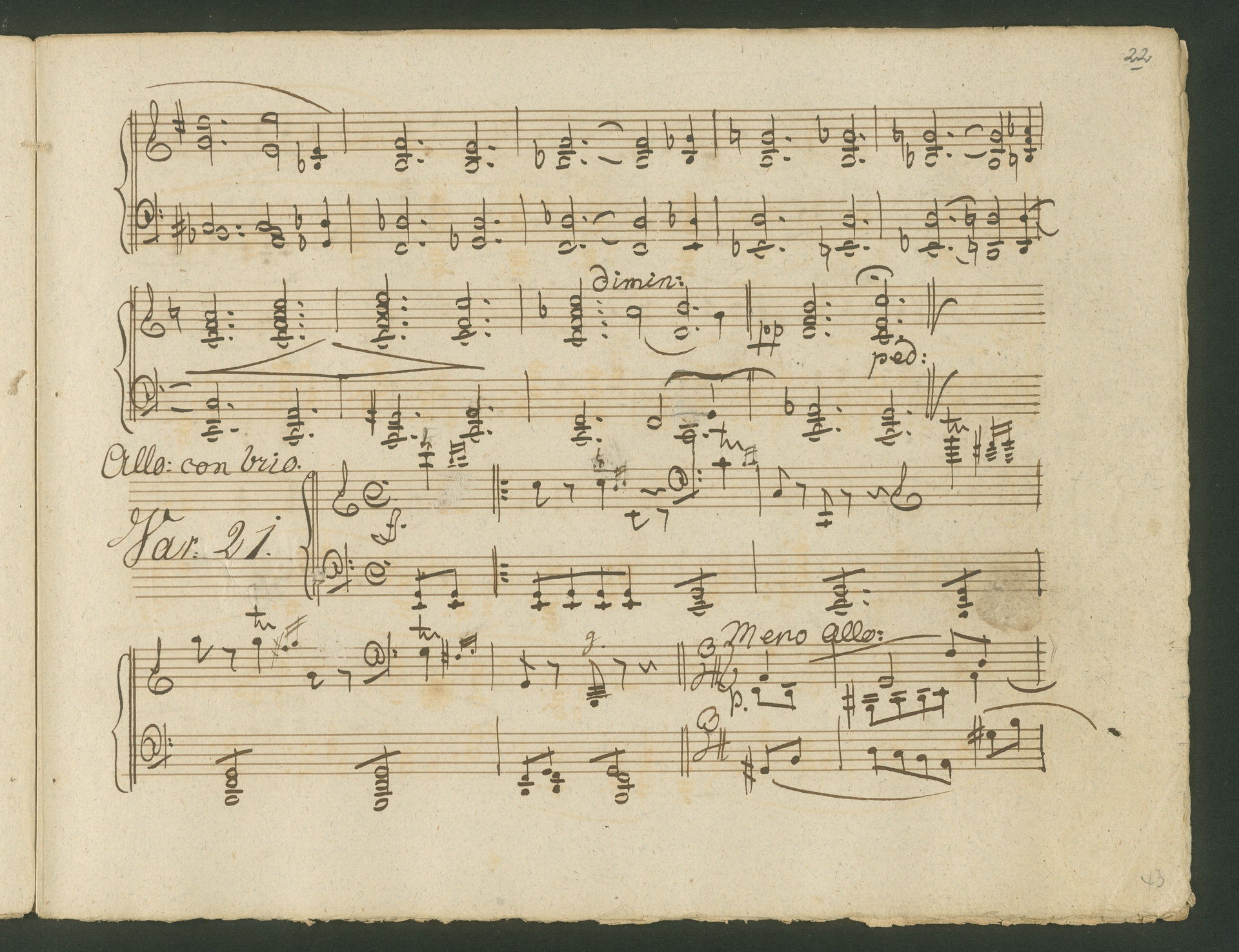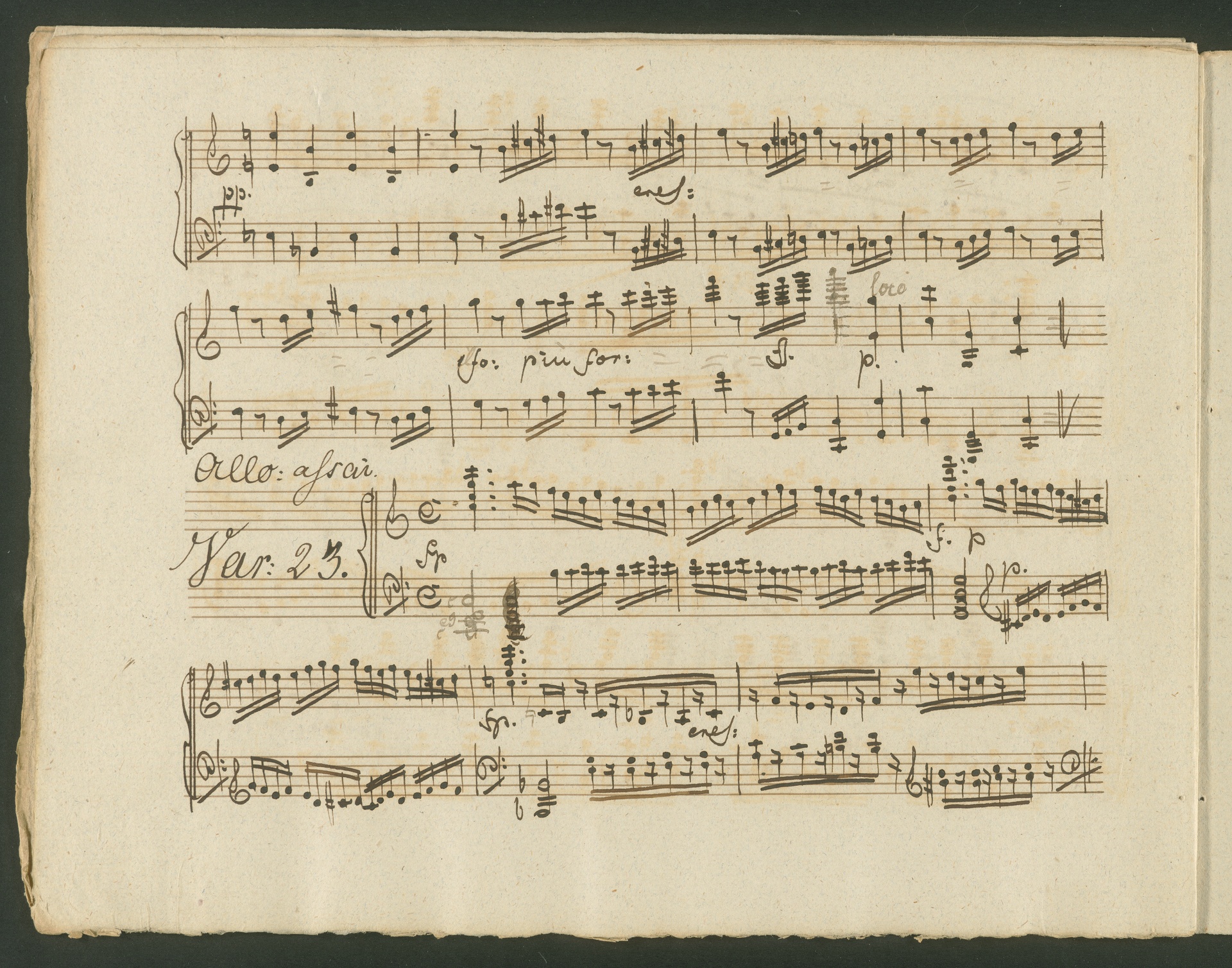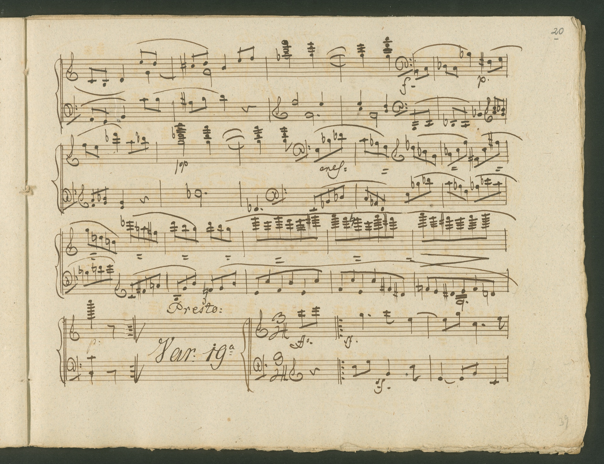 Beethoven's former pupil Ferdinand Ries lived in London from 1813 to 1824. Out of feelings of kindliness and closeness he often represented the interests of his former teacher with London publishers. Ries was also supposed to offer the Diabelli-Variations op. 120 for publication in England. As early as 25 April 1823 Beethoven informed him, "In a few weeks you will also receive a new work, 33 Variations on a theme (Waltzes op. 120), dedicated to your wife". The corrected copy is this manuscript, Beethoven wrote the dedication and date on the title page, "33 Veränderungen über einen walzer Der Gemahlin meines lieben Freundes Ries gewidmet von Ludwig van Beethoven Vien am 30ten April 1823" (33 changes on a waltz dedicated by Ludwig van Beethoven to the wife of my dear friend Ries, Vienna 30 April 1823). In the end, however, there was no English edition, as Ries writes in his memoirs on Beethoven, "For Beethoven had put off sending them for so long and forgotten his commission, that when I took the variations to Boosey [the London publisher, who wanted to publish the work], we found it had already been engraved in Vienna, and with a dedication to Madame Brentano." (J.R.)