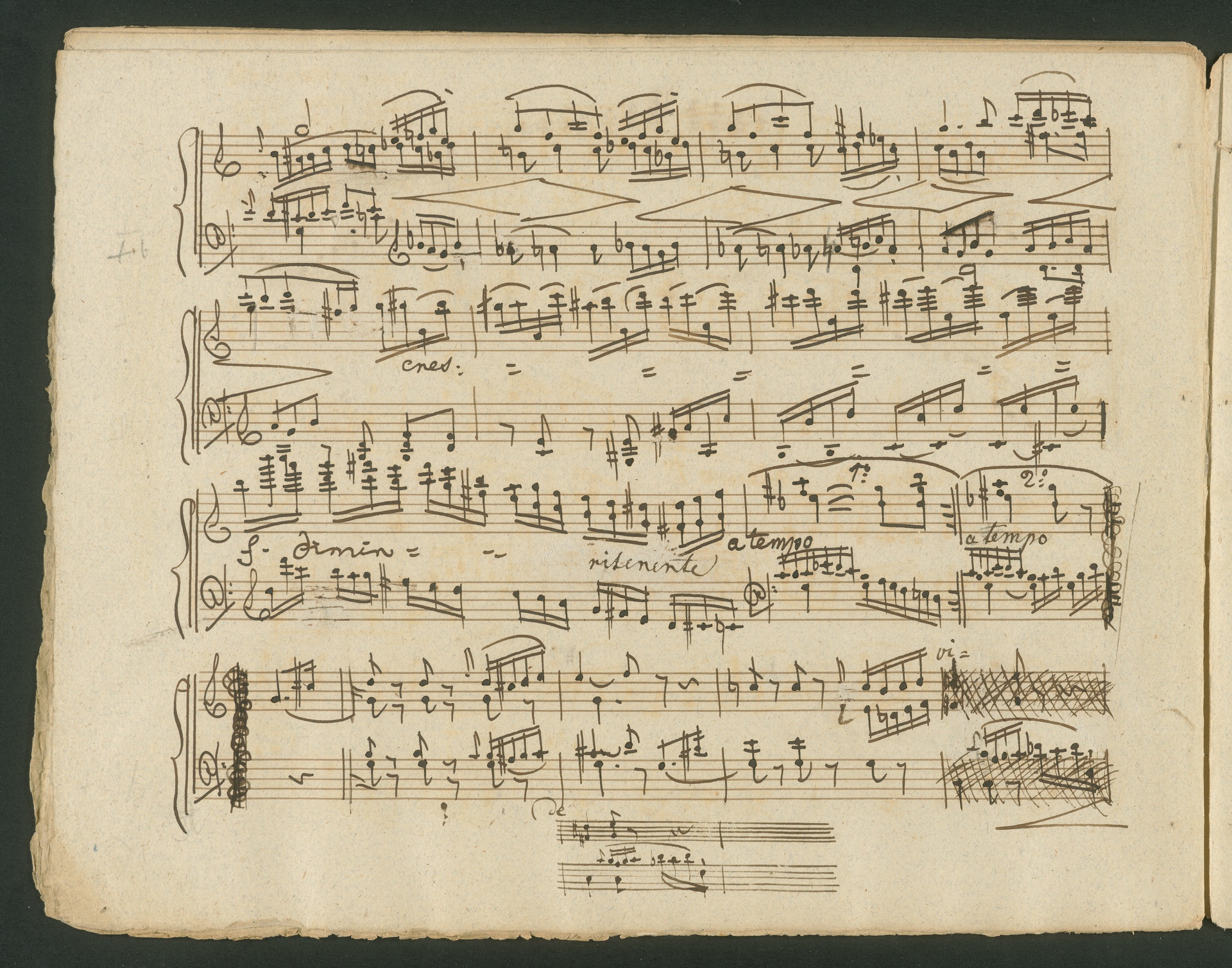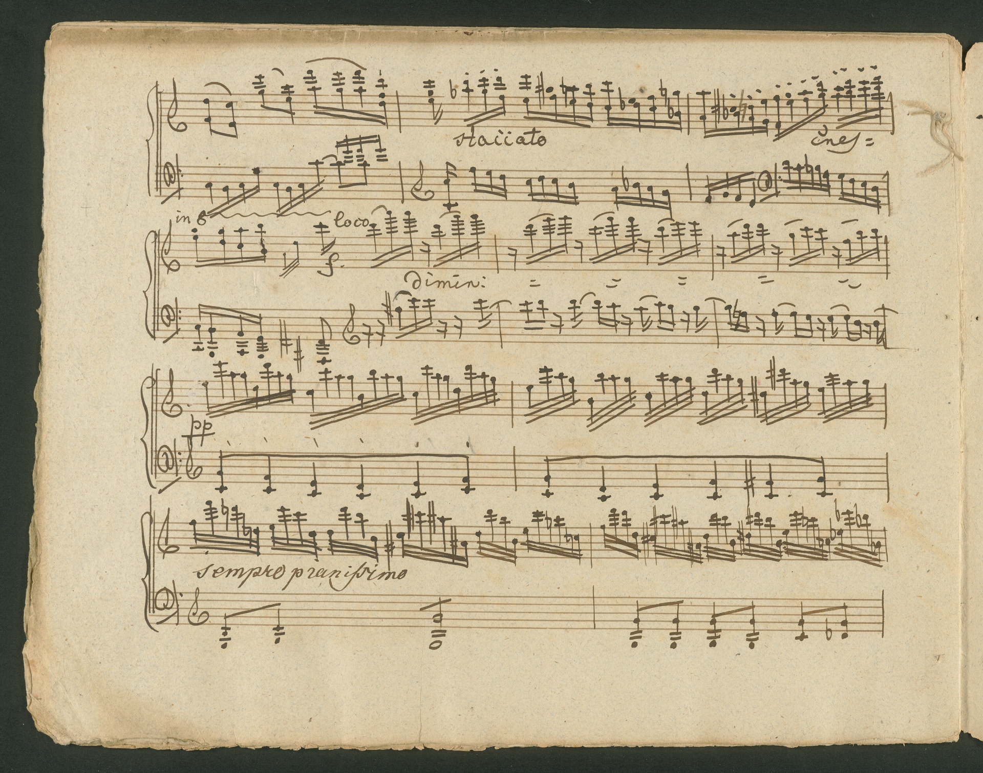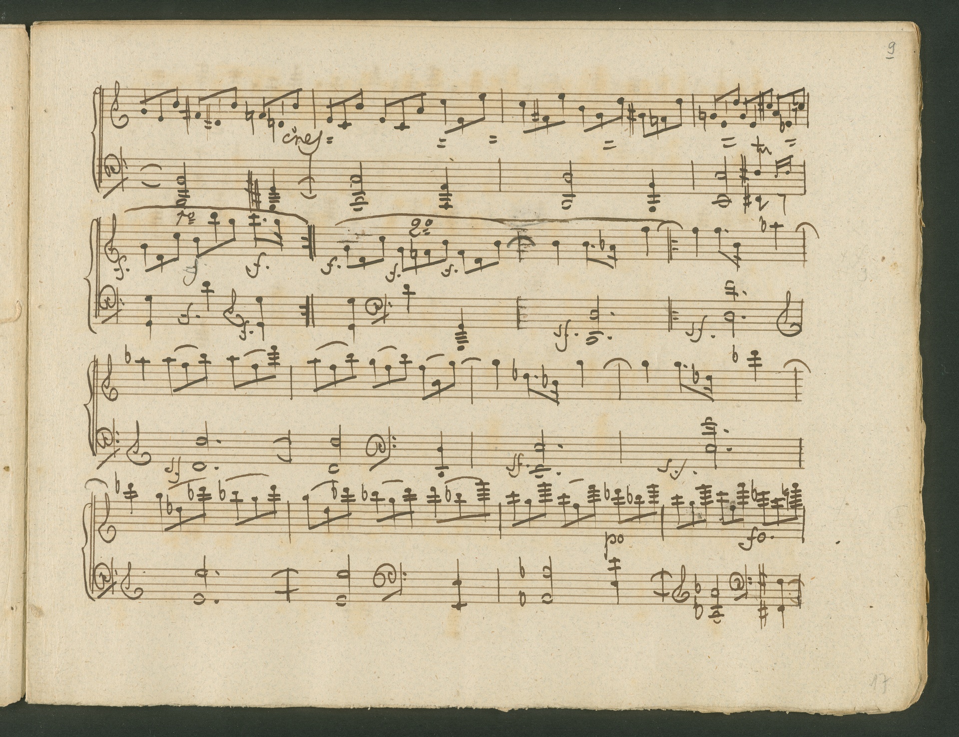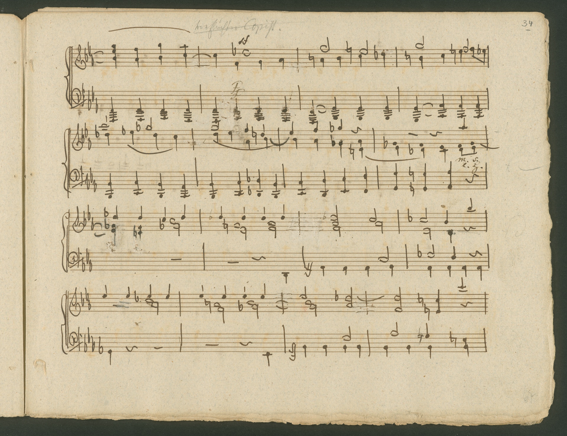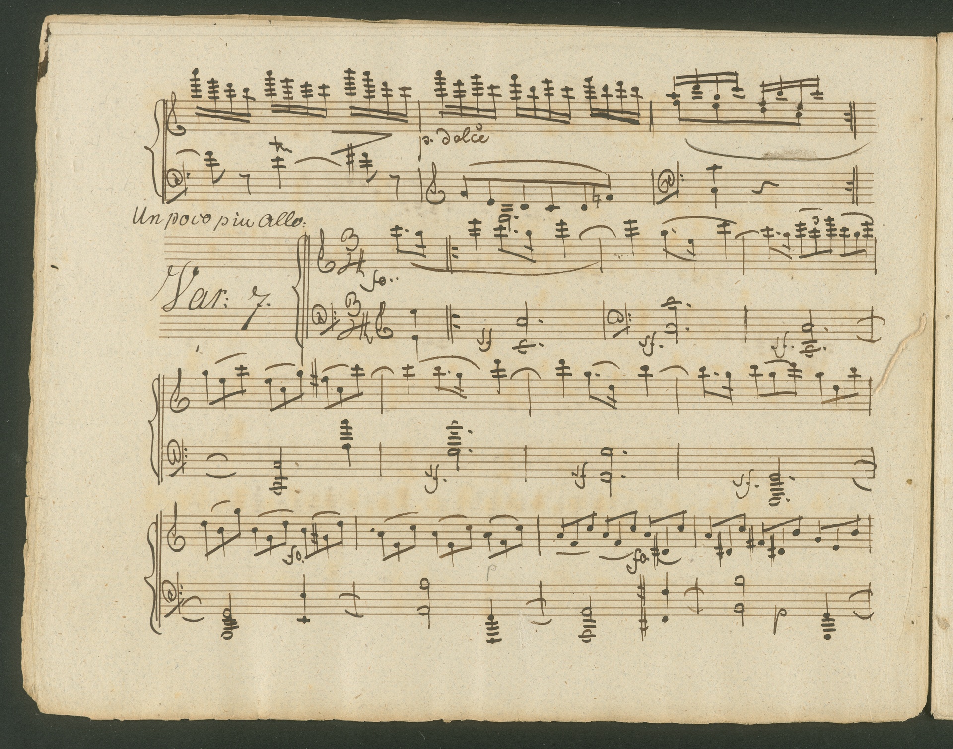 Beethoven's former pupil Ferdinand Ries lived in London from 1813 to 1824. Out of feelings of kindliness and closeness he often represented the interests of his former teacher with London publishers. Ries was also supposed to offer the Diabelli-Variations op. 120 for publication in England. As early as 25 April 1823 Beethoven informed him, "In a few weeks you will also receive a new work, 33 Variations on a theme (Waltzes op. 120), dedicated to your wife". The corrected copy is this manuscript, Beethoven wrote the dedication and date on the title page, "33 Veränderungen über einen walzer Der Gemahlin meines lieben Freundes Ries gewidmet von Ludwig van Beethoven Vien am 30ten April 1823" (33 changes on a waltz dedicated by Ludwig van Beethoven to the wife of my dear friend Ries, Vienna 30 April 1823). In the end, however, there was no English edition, as Ries writes in his memoirs on Beethoven, "For Beethoven had put off sending them for so long and forgotten his commission, that when I took the variations to Boosey [the London publisher, who wanted to publish the work], we found it had already been engraved in Vienna, and with a dedication to Madame Brentano." (J.R.)