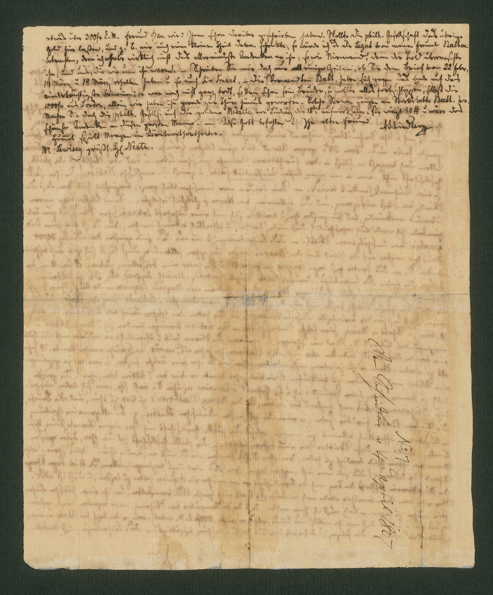 Moscheles shall persuade the Philharmonic Society not to demand the return of the money Beethoven received, but to have it included in his bequest. The golden medal Beethoven was awarded from French king Ludwig XVIII would be a suitable piece of memory for the Society. Because Schindler has no personal souvenir from Beethoven he is asking for a share from the gift of money.
