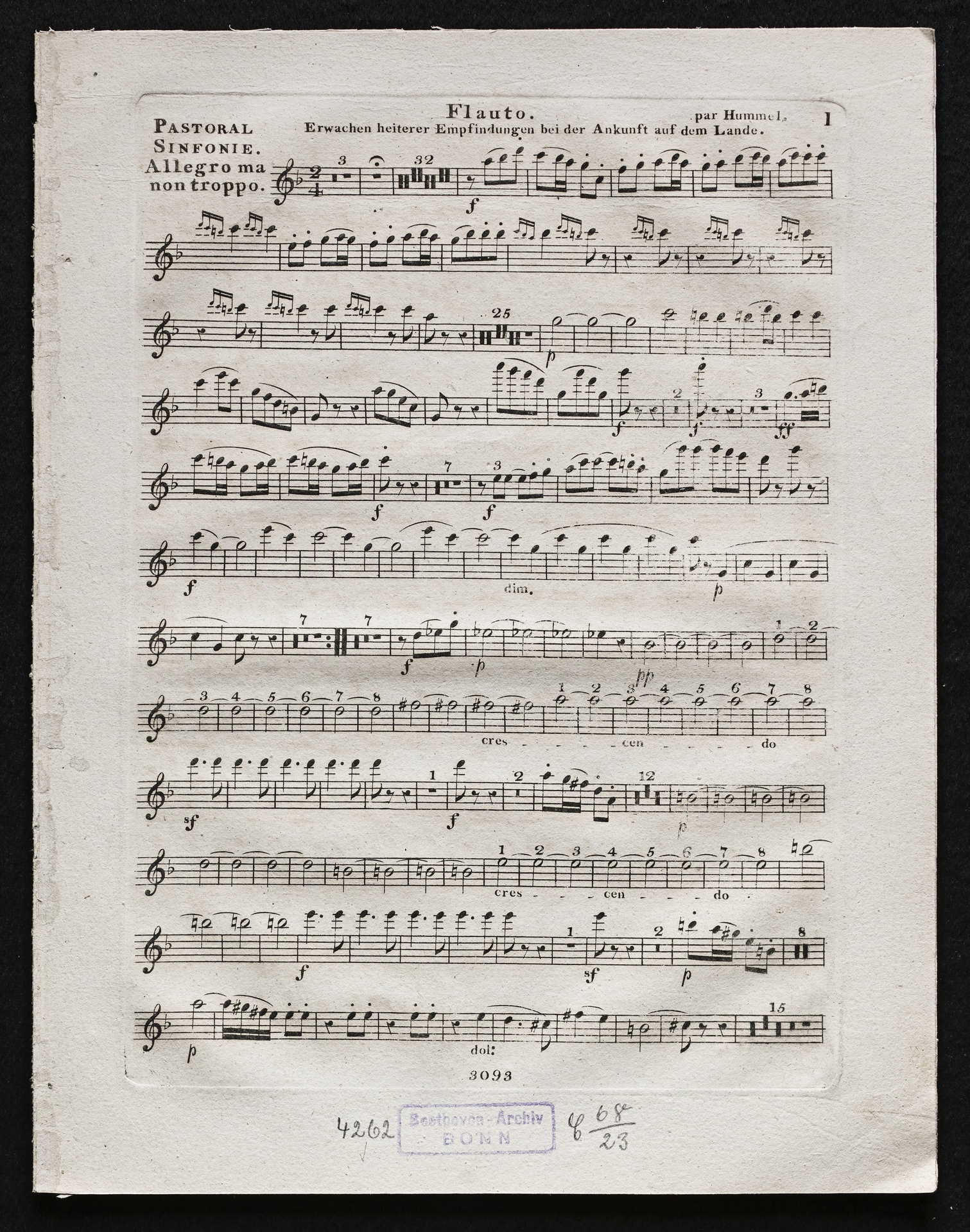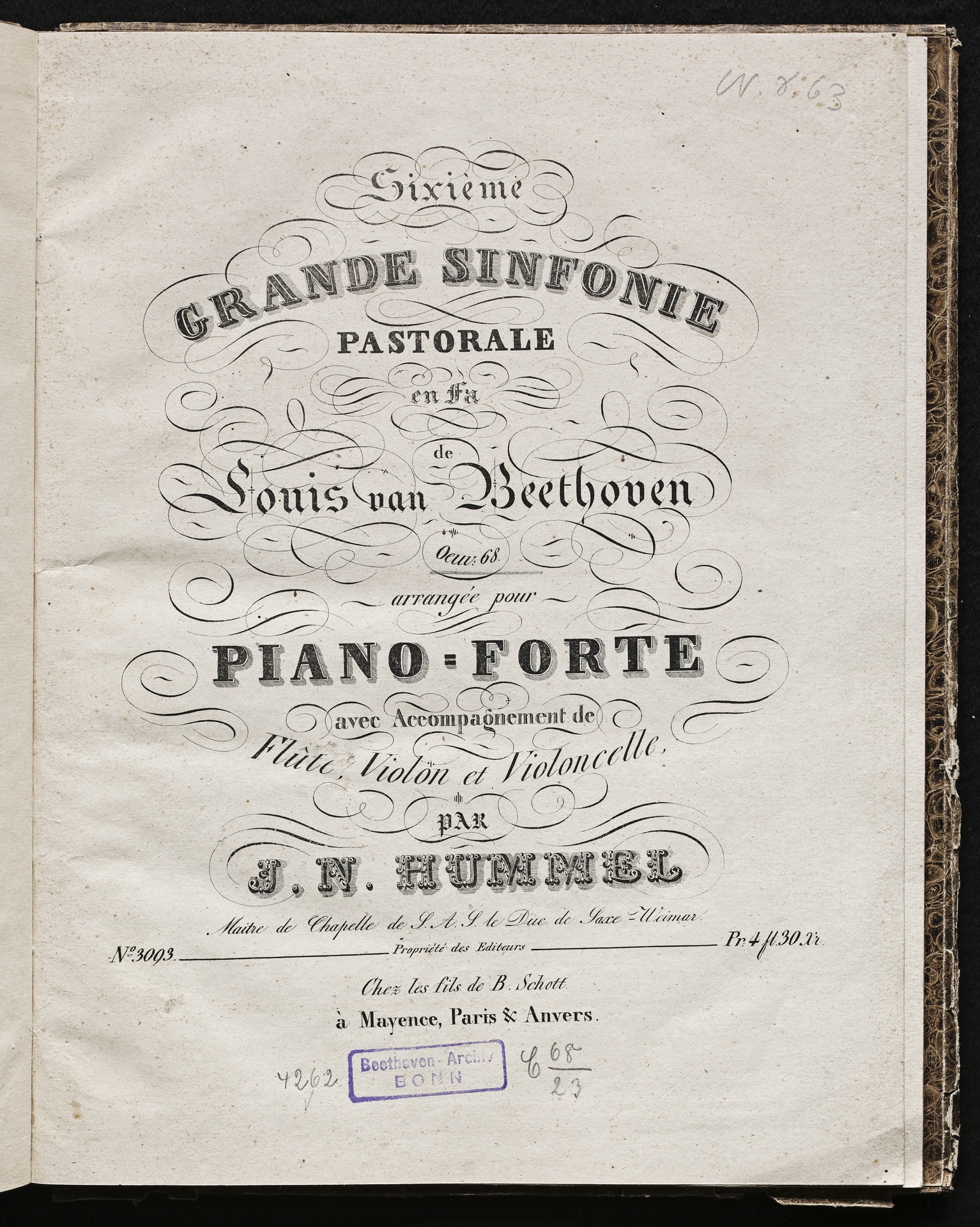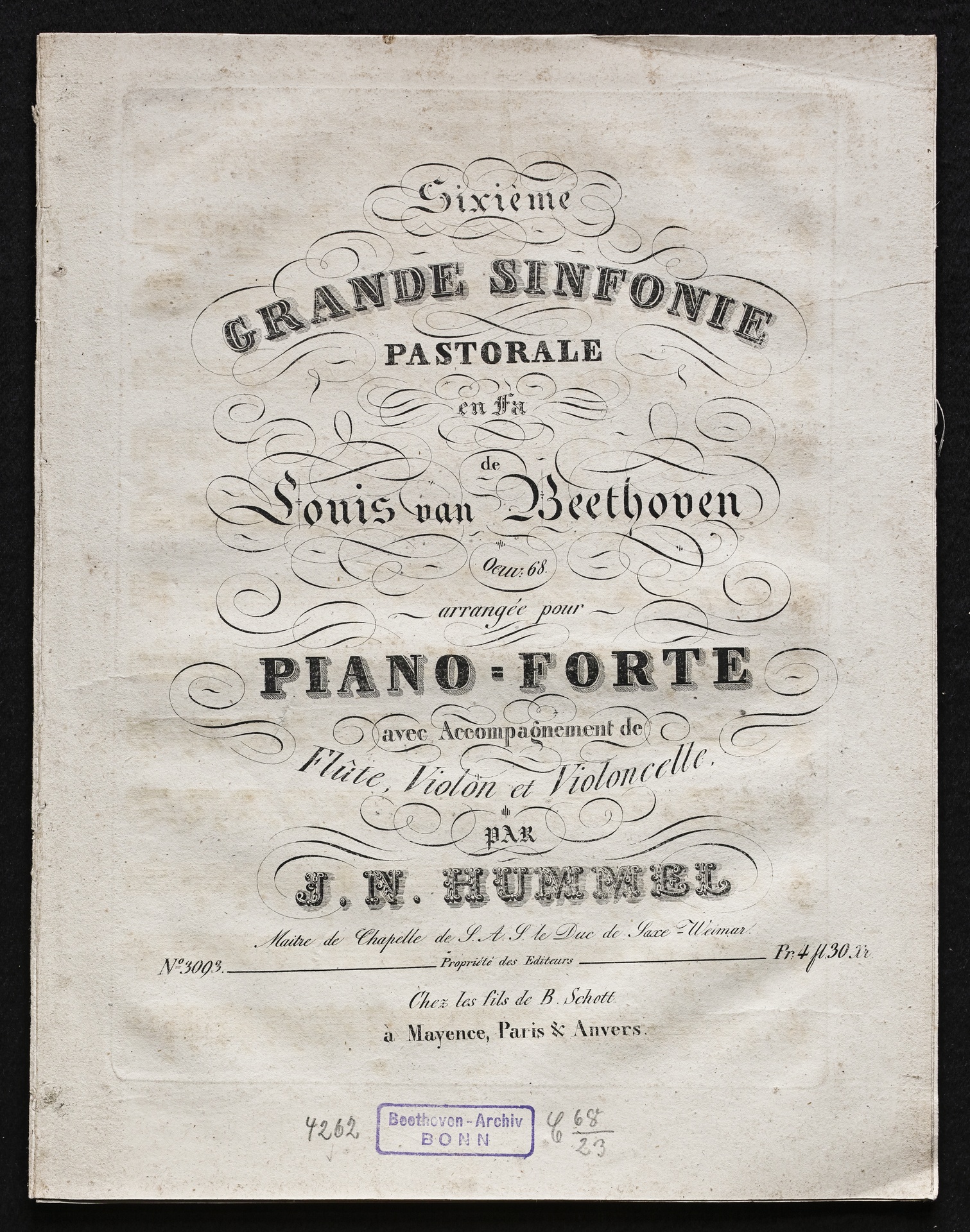 Ludwig van Beethoven, Sinfonie Nr. 6 (F-Dur) op. 68 (Pastorale), Bearbeitung für Flöte, Violine, Violoncello und Klavier von Johann Nepomuk Hummel, Stimmen, Schott, 3093