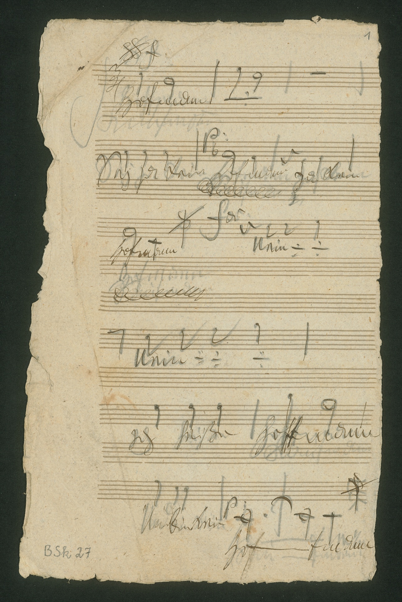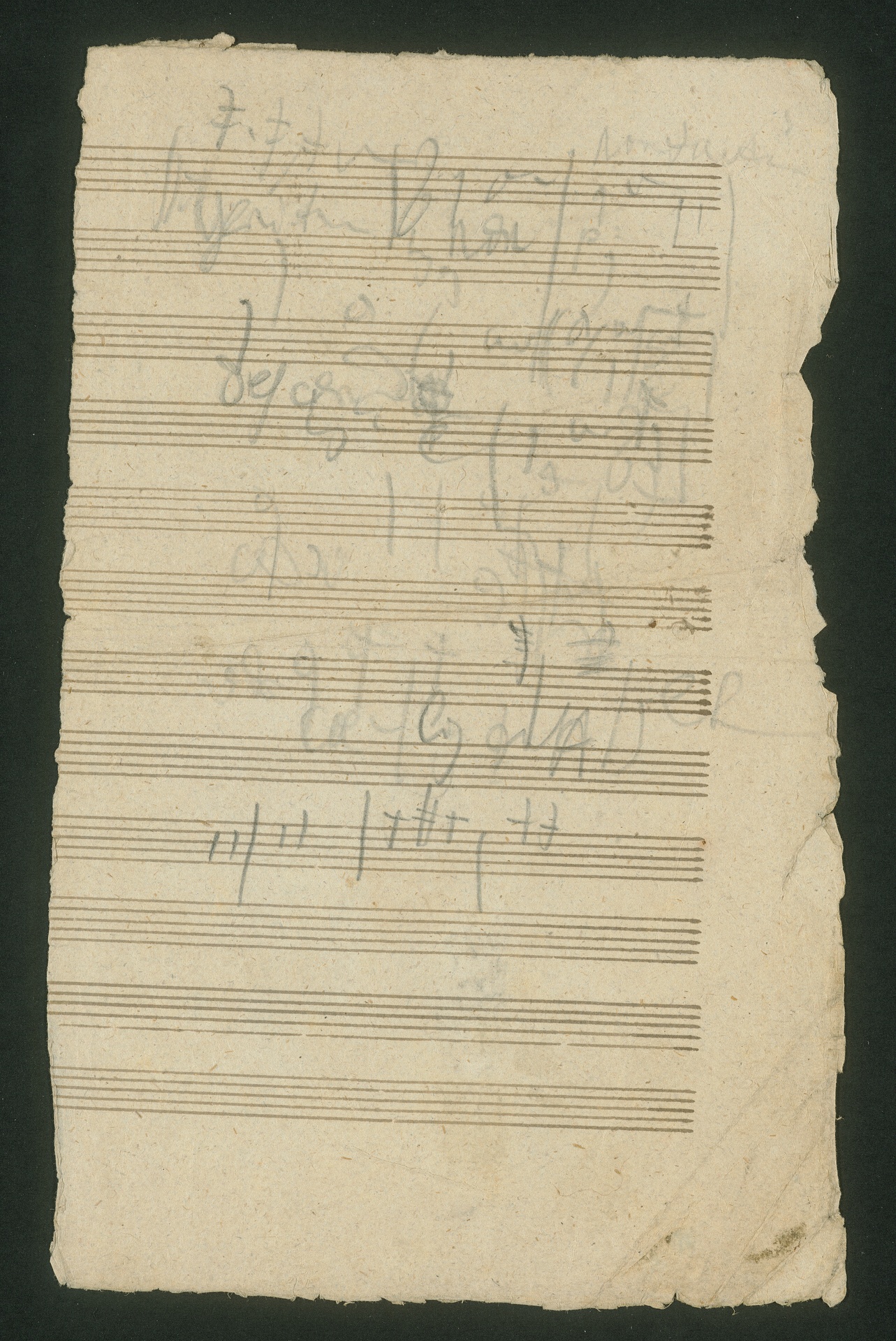 This single sketch leaf is from the pocket sketchbook "BH 107", which is also in the Beethoven-Haus collection. As in BH 107, there are sketches for the Missa solemnis (for the Credo), but only on the front (picture 2). On the reverse (picture 1) there is a canon, "Hoffman, sei ja kein Hofmann" ("Hoffmann, do not be a courtier"), which has been given the number WoO 180 in the Beethoven Catalogue of Works. The canon, first of all sketched in pencil and then partially inked over, was composed in connection with a conversation with the poet E.T.A. Hoffmann. He presumably suggested the pun to Beethoven (although the text is not aimed at the poet). As the sketch leaf did not come from Robert Mendelssohn, who gave the sketchbook BH 107 to the Beethoven-Haus in 1899, it was probably removed from the book before it came into the possession of the Mendelssohn family. It cannot be ruled out that Beethoven himself removed the leaf out of the sketchbook, even before he inked over the canon. (J.R.)