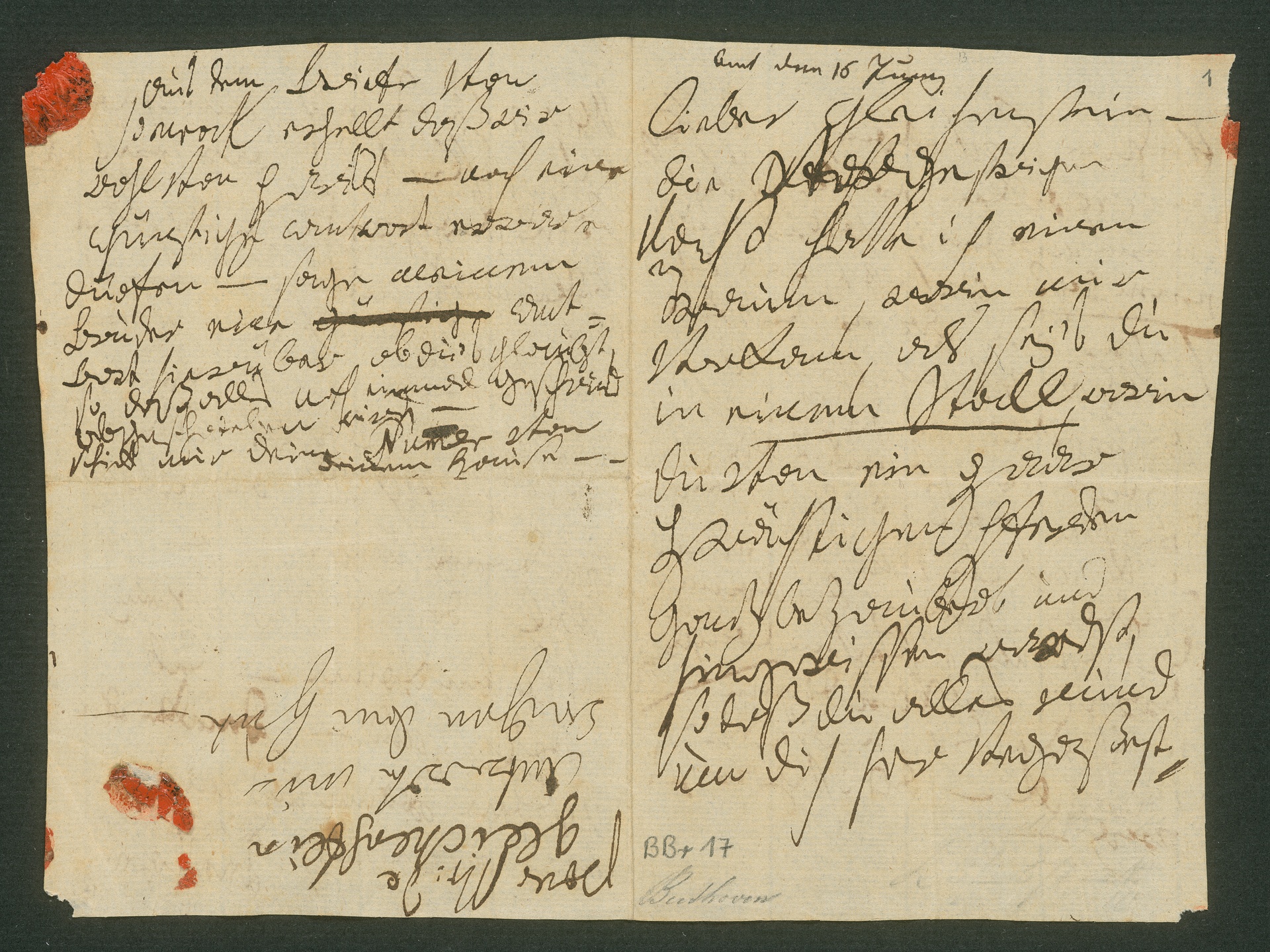 For a long time Beethoven had been in the habit of having unpleasant everyday tasks performed by friends, which allowed him to devote himself totally to his music. Gleichenstein also carried out services such as these: he had obviously found a new hat for Beethoven. The composer now asks him to take the hat back, as it already has a tear after one day. In addition Beethoven asks him for a copy of Bahrdt's translation of Tacitus. He also tells him of his headaches and complaints.