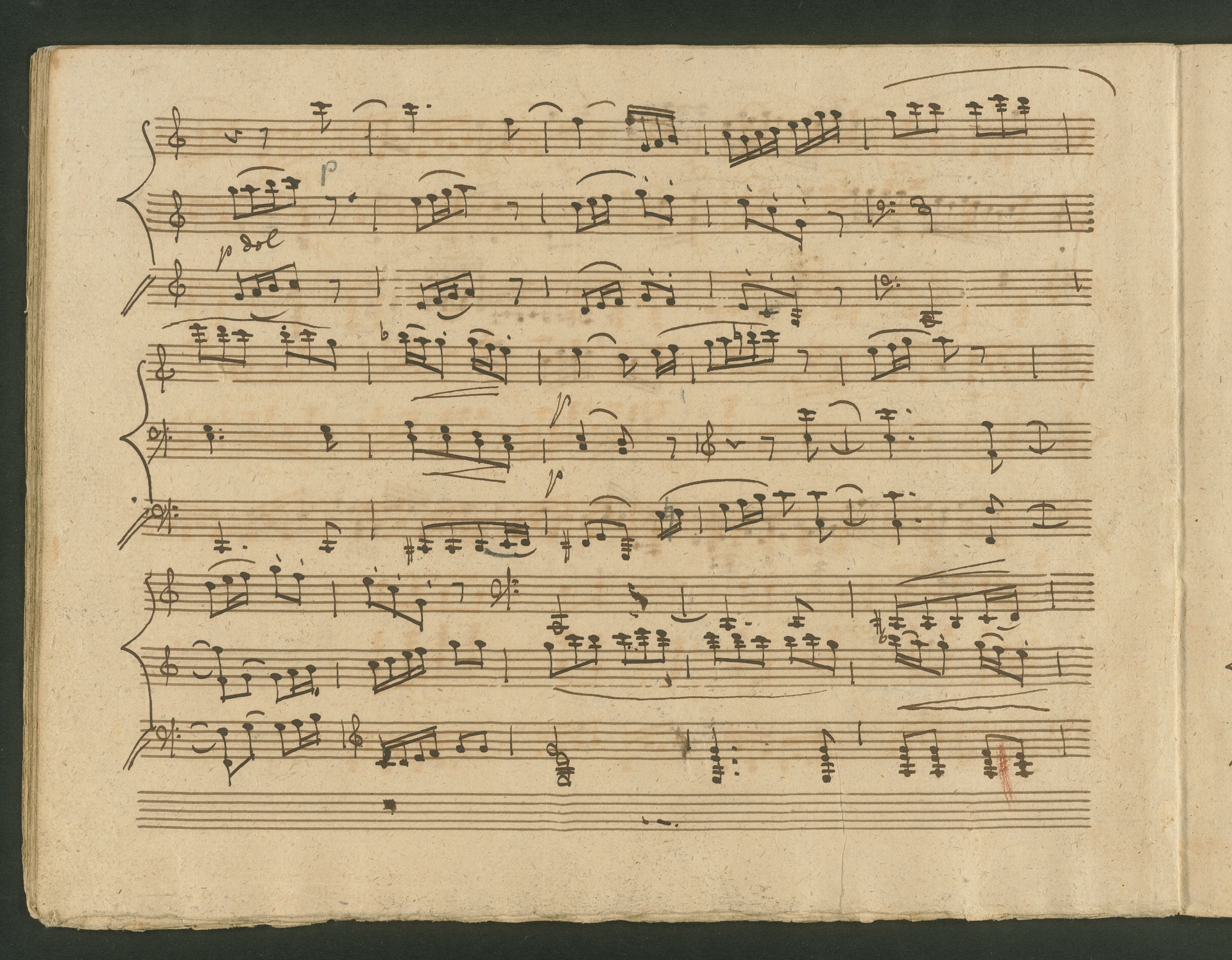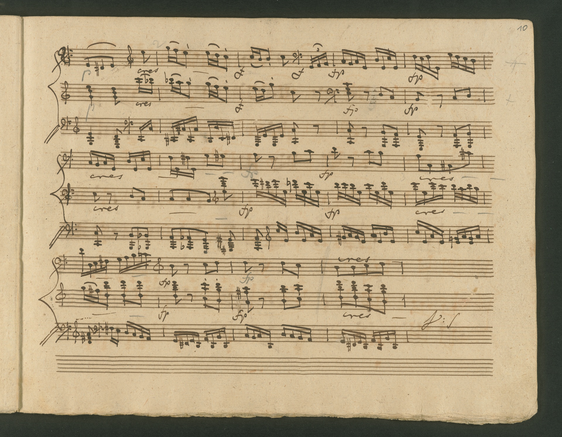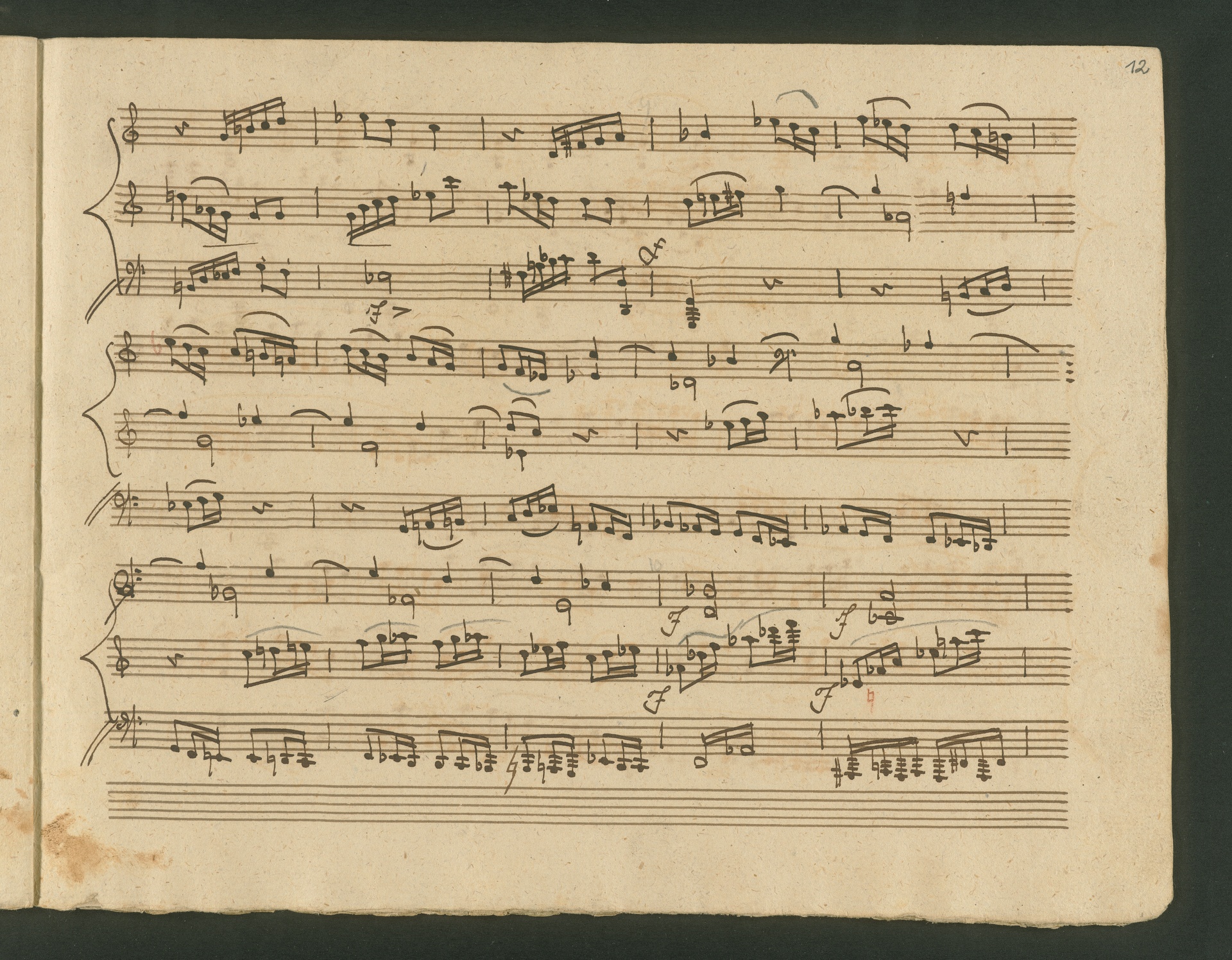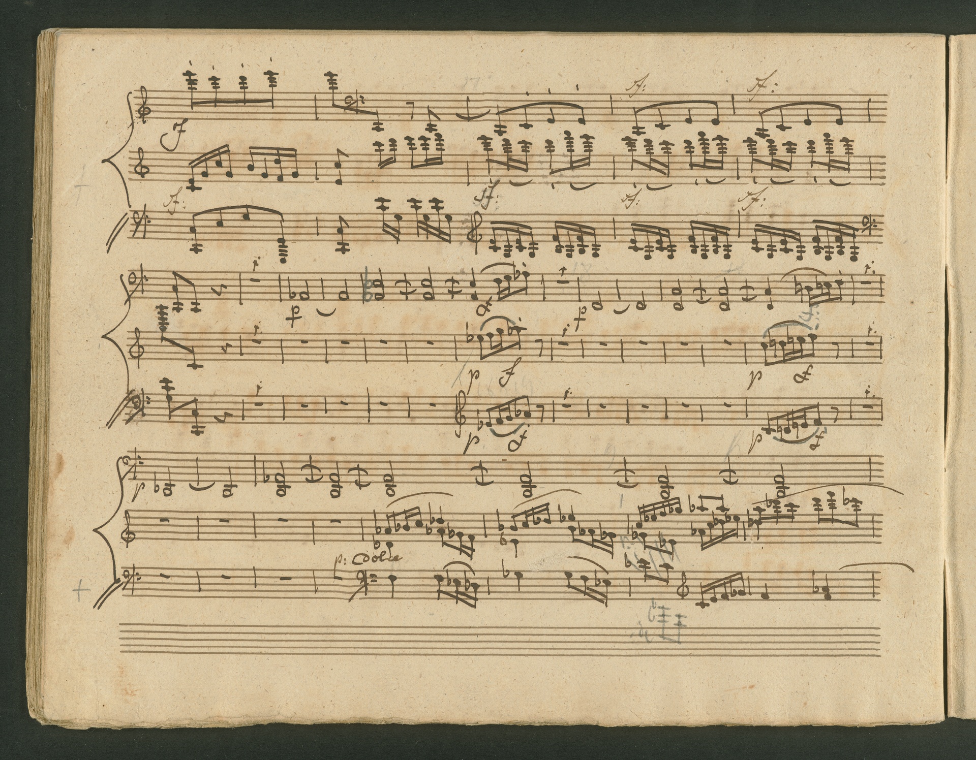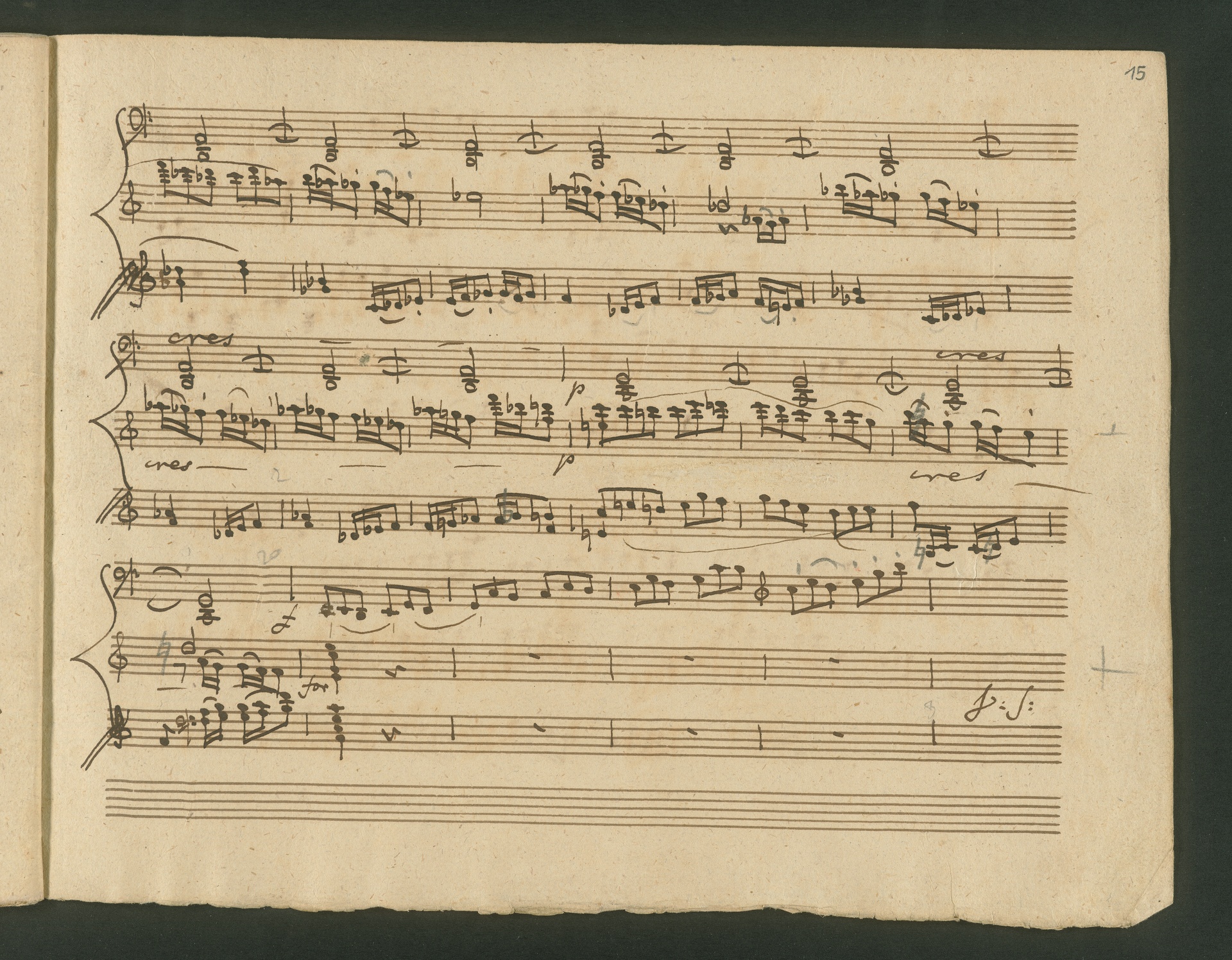 The critic in the Allgemeine musikalische Zeitung of 1818 was obviously very surprised, probably even overtaxed by the two Cello Sonatas op. 102. Too accustomed to light, pleasing and brilliant works, the critic was not able to cope with the two sonatas, as the rest of the review shows. At least at the end, he praises the "cultured publisher" for the practical edition, which "greatly relieves the understanding". The publisher was Nikolaus Simrock in Bonn, who had published quite a few of Beethoven's works. The corrected copies shown here are the two engraver's models for the original edition of op. 102. In both copies preparations for printing can clearly be seen: crosses and entries with which the engraver determines the layout of the pages for the printed edition. (J.R.)