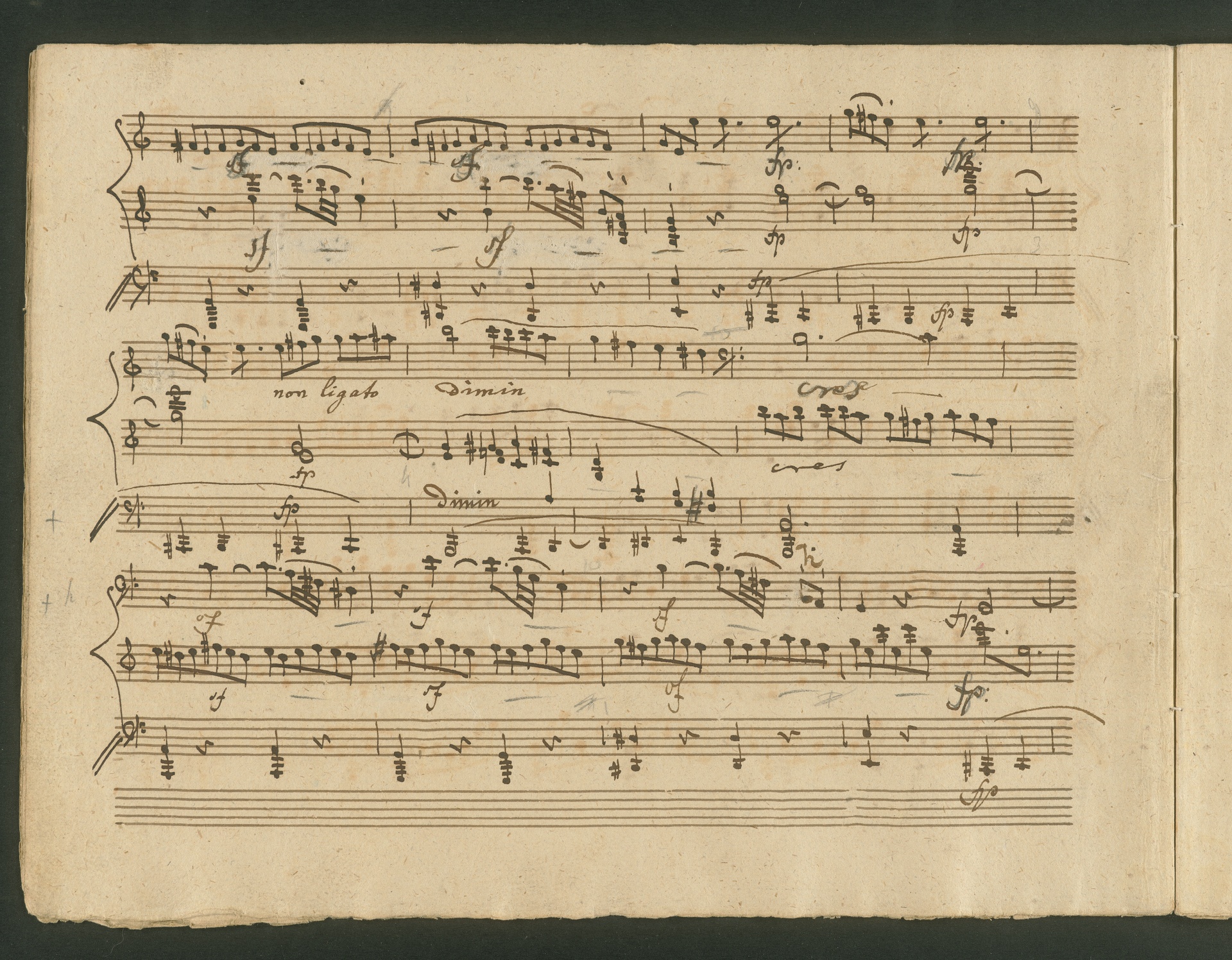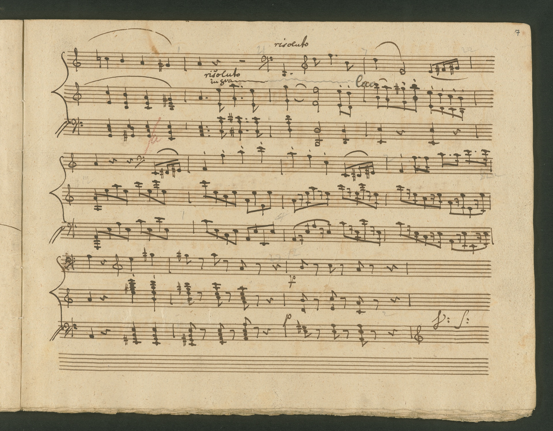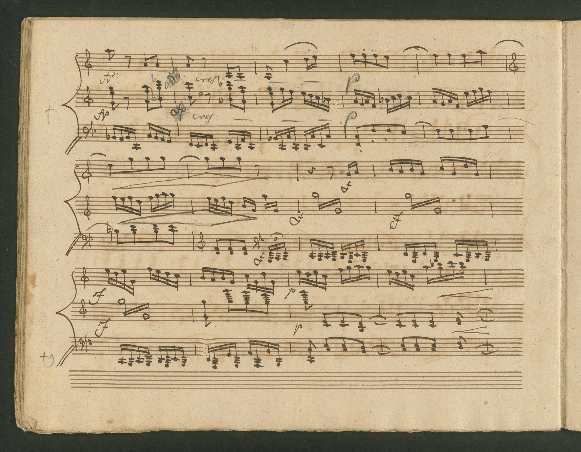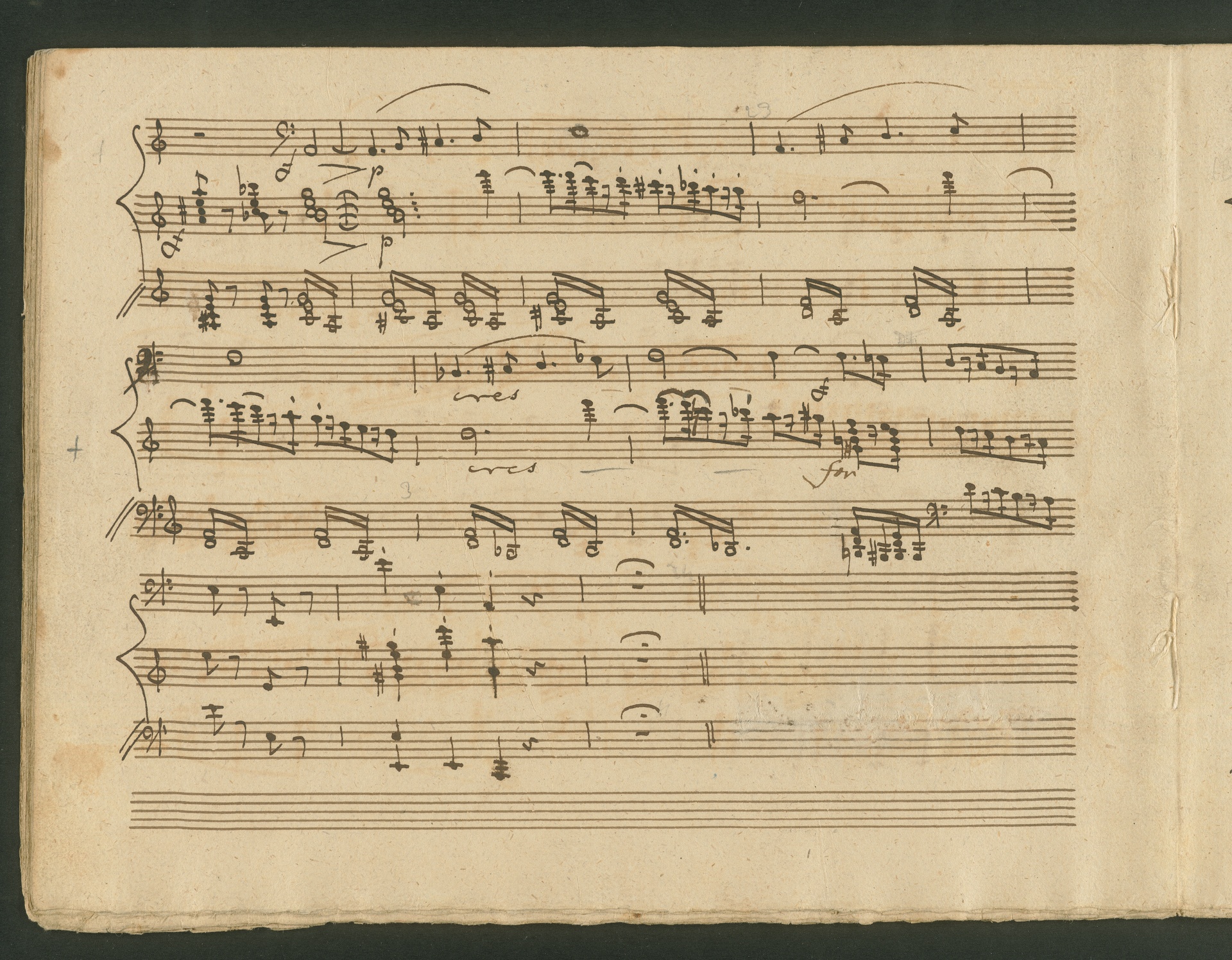 The critic in the Allgemeine musikalische Zeitung of 1818 was obviously very surprised, probably even overtaxed by the two Cello Sonatas op. 102. Too accustomed to light, pleasing and brilliant works, the critic was not able to cope with the two sonatas, as the rest of the review shows. At least at the end, he praises the "cultured publisher" for the practical edition, which "greatly relieves the understanding". The publisher was Nikolaus Simrock in Bonn, who had published quite a few of Beethoven's works. The corrected copies shown here are the two engraver's models for the original edition of op. 102. In both copies preparations for printing can clearly be seen: crosses and entries with which the engraver determines the layout of the pages for the printed edition. (J.R.)