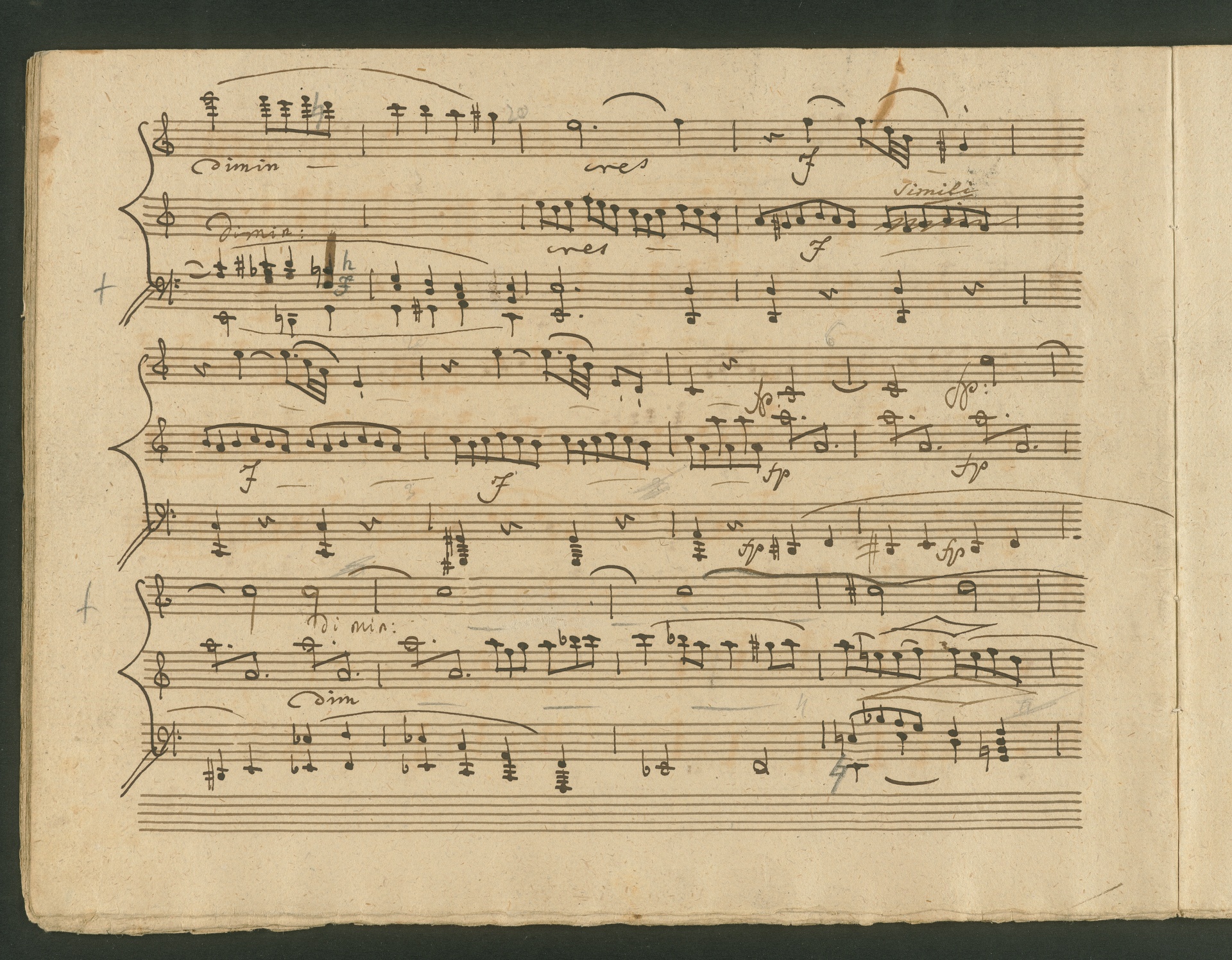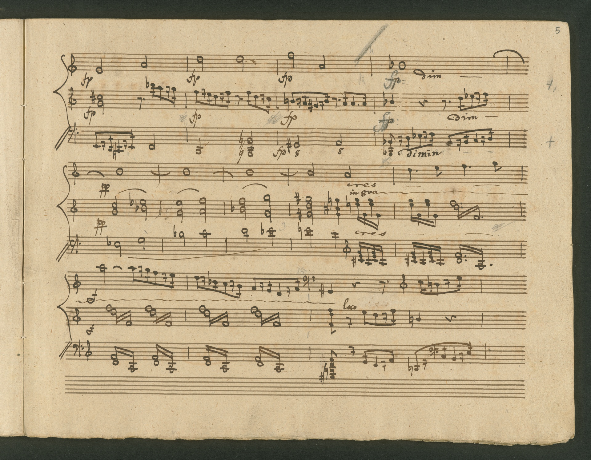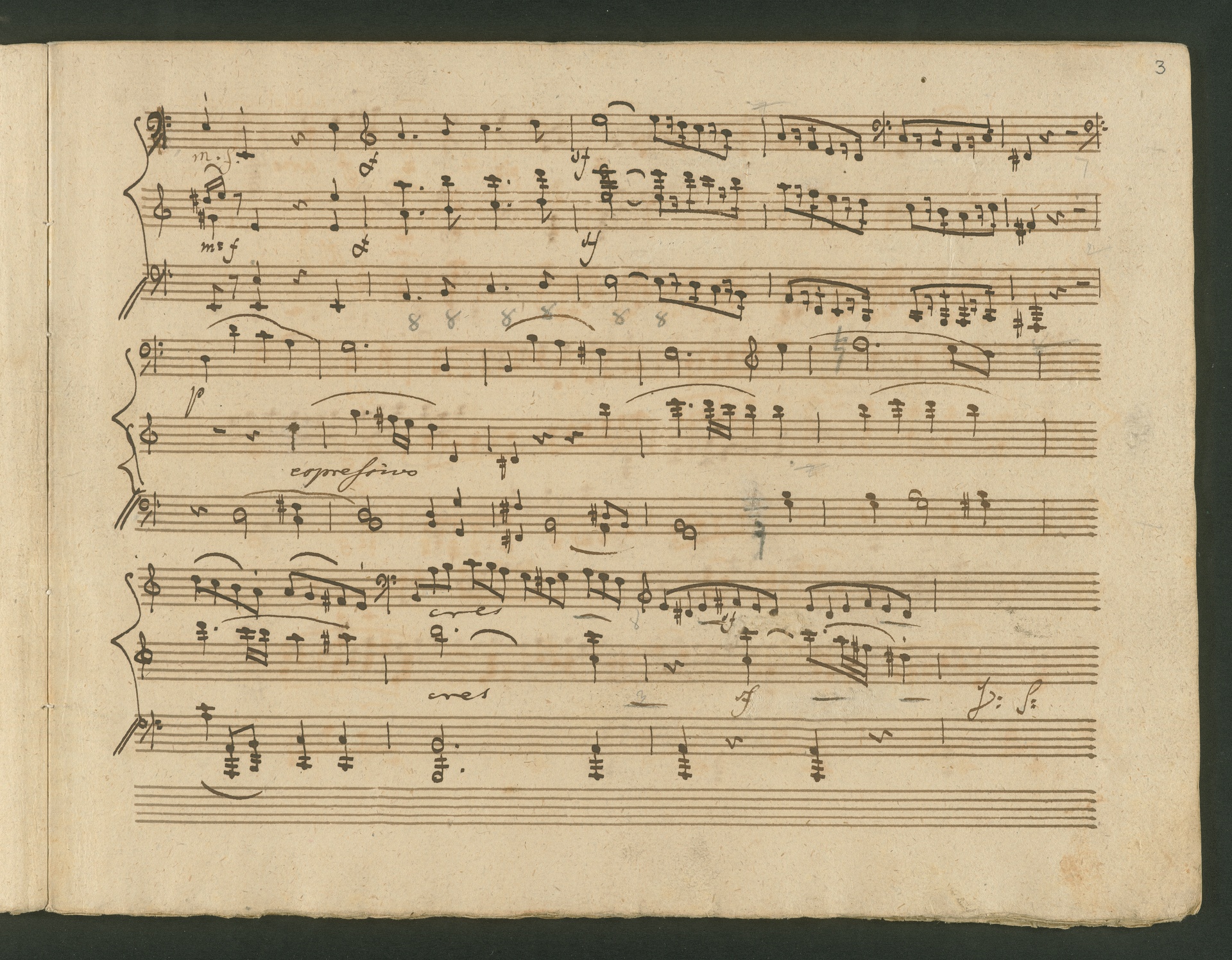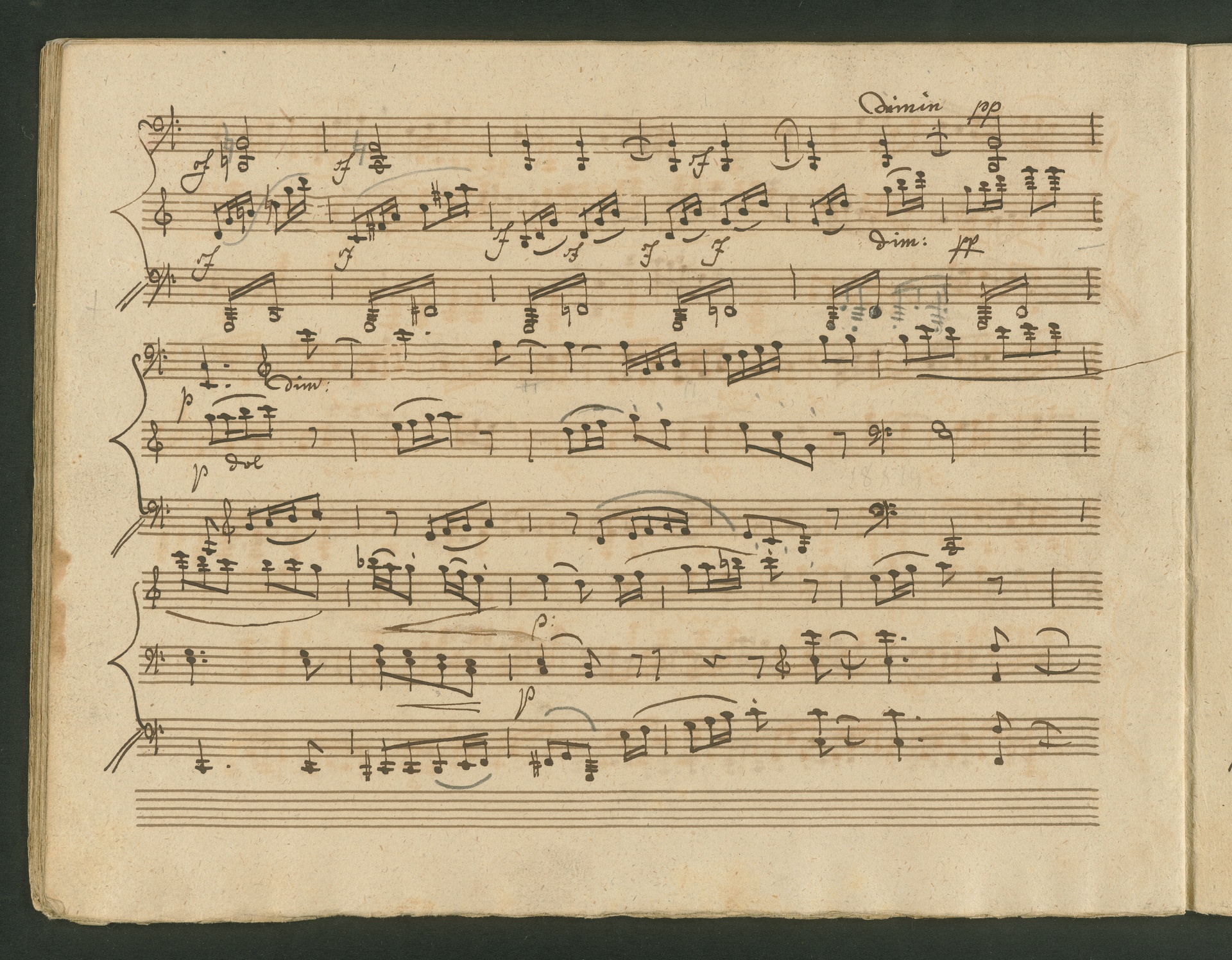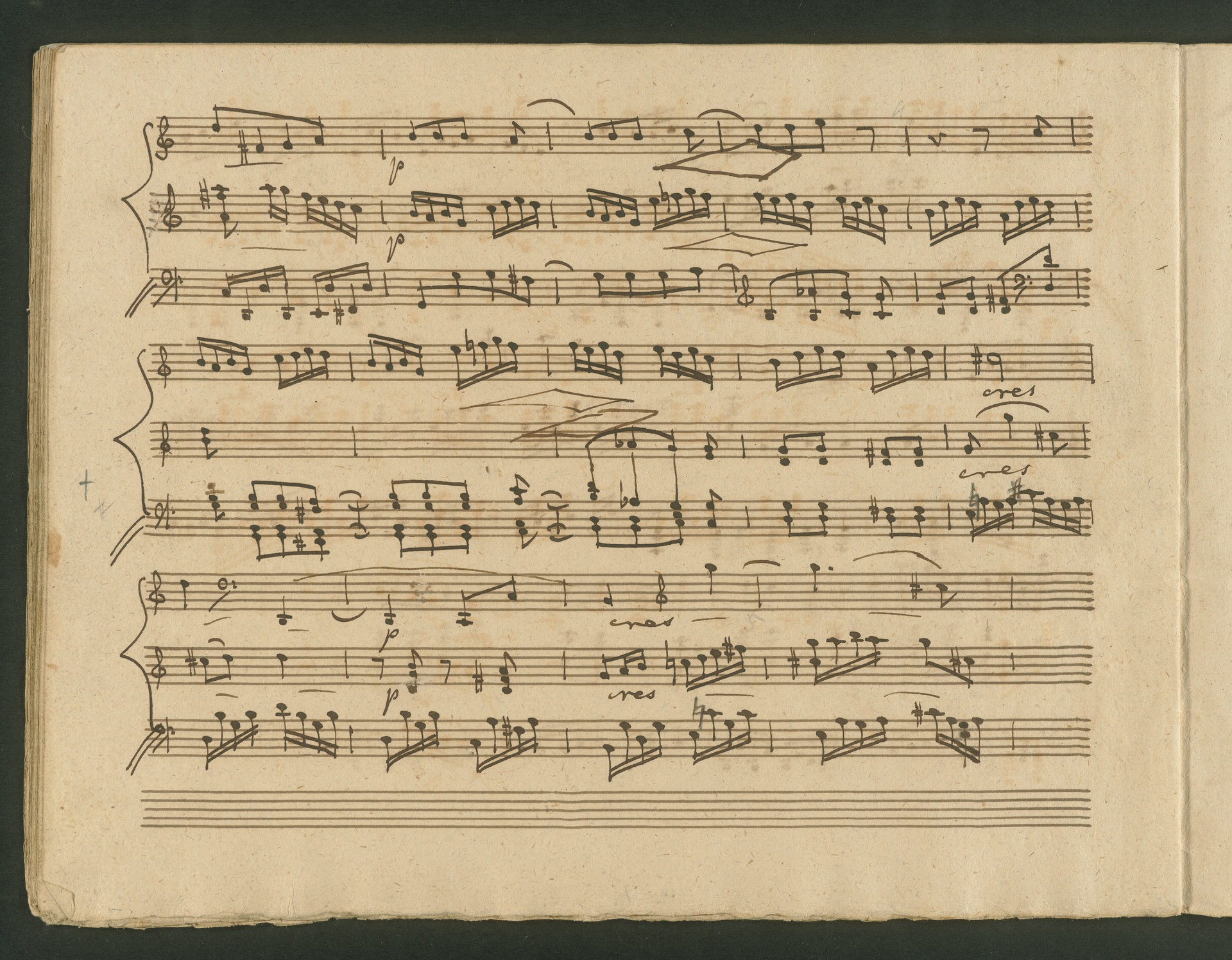 The critic in the Allgemeine musikalische Zeitung of 1818 was obviously very surprised, probably even overtaxed by the two Cello Sonatas op. 102. Too accustomed to light, pleasing and brilliant works, the critic was not able to cope with the two sonatas, as the rest of the review shows. At least at the end, he praises the "cultured publisher" for the practical edition, which "greatly relieves the understanding". The publisher was Nikolaus Simrock in Bonn, who had published quite a few of Beethoven's works. The corrected copies shown here are the two engraver's models for the original edition of op. 102. In both copies preparations for printing can clearly be seen: crosses and entries with which the engraver determines the layout of the pages for the printed edition. (J.R.)