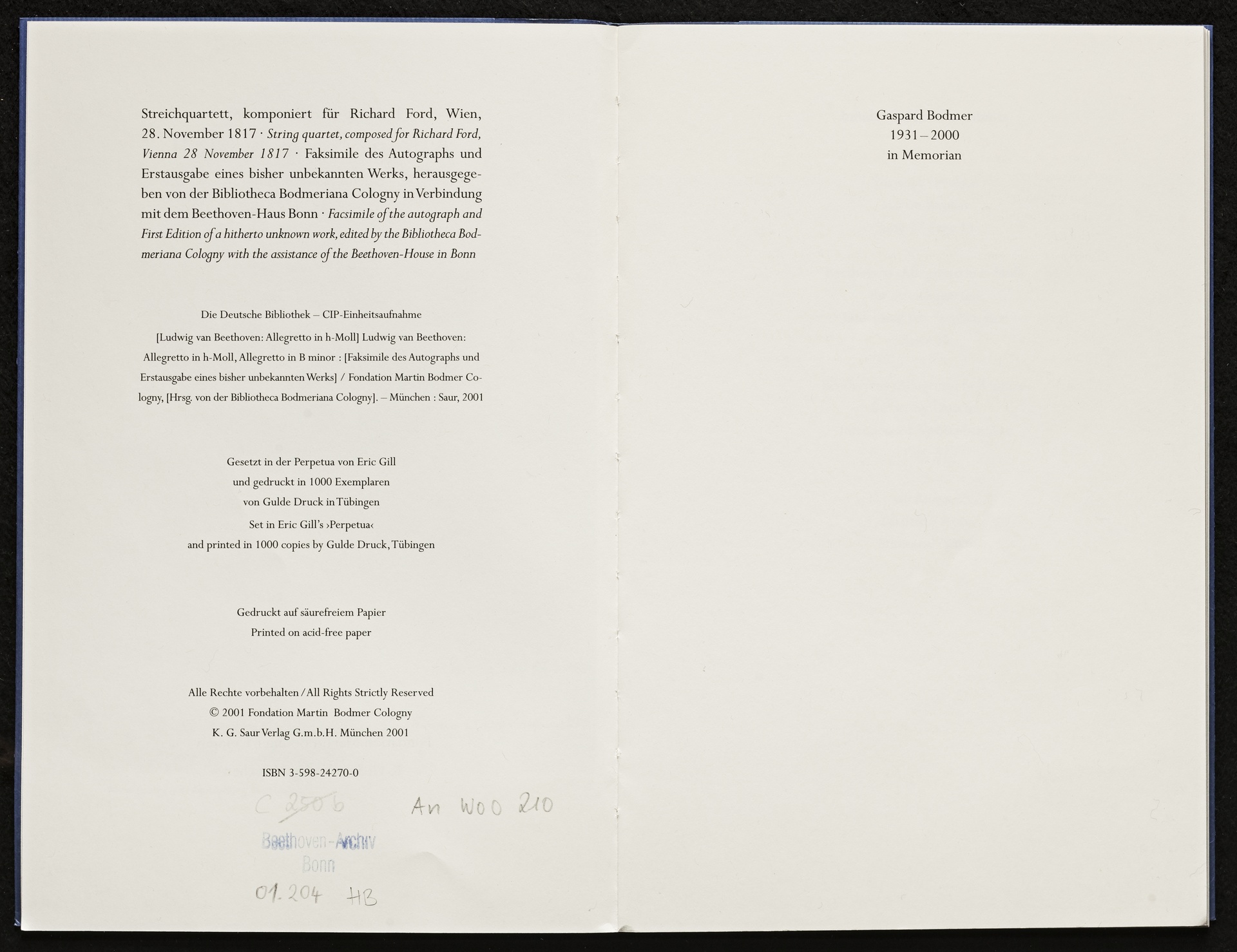 Ludwig van Beethoven, Allegretto für zwei Violinen, Viola und Violoncello (h-Moll) WoO 210, Partitur und Stimmen, Bodmer