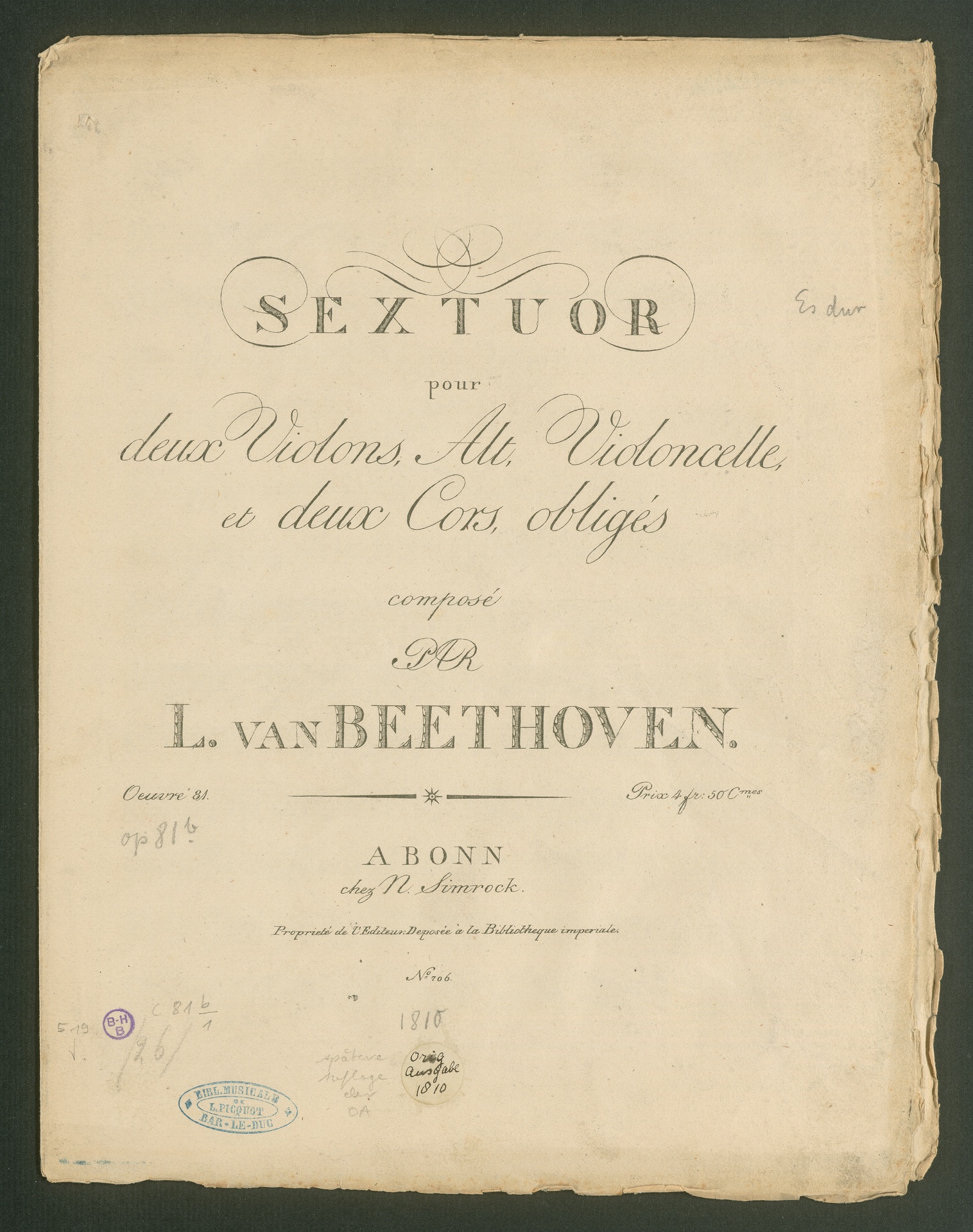 Ludwig van Beethoven, Sextett für 2 Violinen, Viola, Violoncello und 2 Hörner (Es-Dur) op. 81b, Stimmen, Simrock, 706