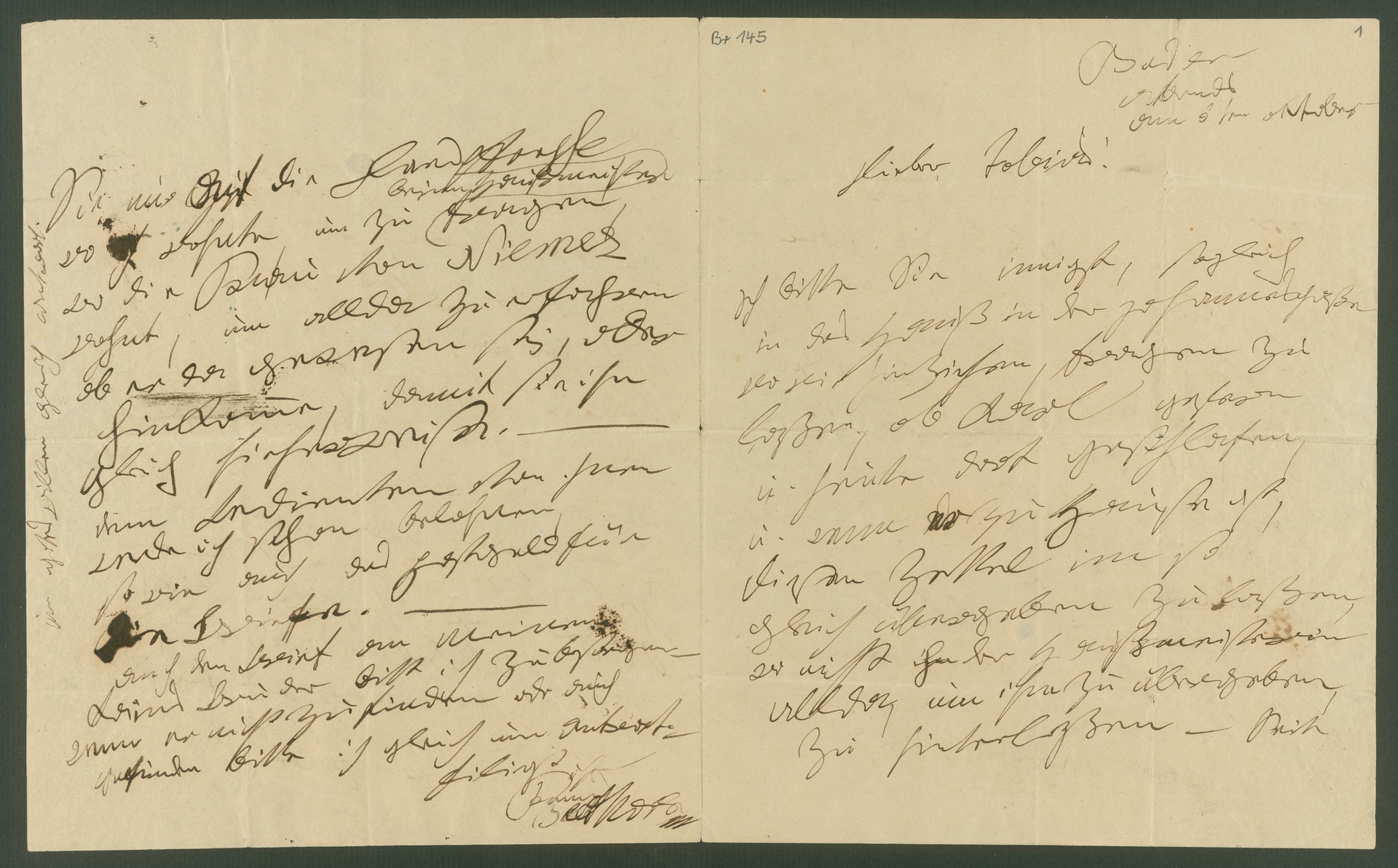Beethoven is worried about his nephew Karl. Karl, now 18 years old, had not gone to Baden with him in summer 1824 but had stayed in Vienna. The distance and the fact that he could not keep an eye on him was a real worry for Beethoven. After Karl had visited him in Baden, he can now longer be found. Beethoven is very concerned about this, as he not only fears that Karl might be led astray but also that he might also contact his mother again. Beethoven asks his publisher and friend Haslinger to see whether Karl is already in the apartment which has just been rented. He encloses a letter for Karl, which is either to be given to him personally or to the landlord.