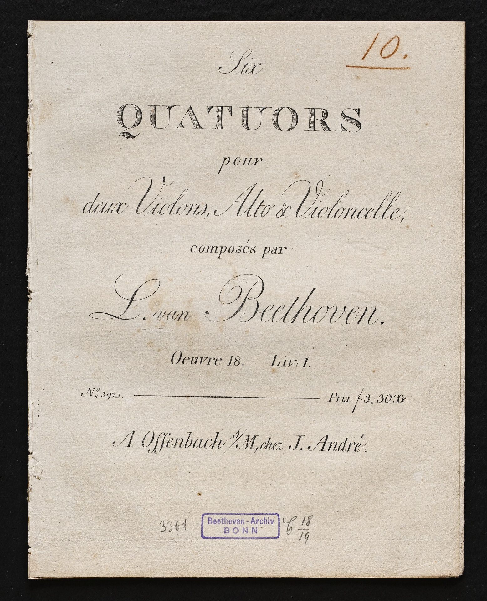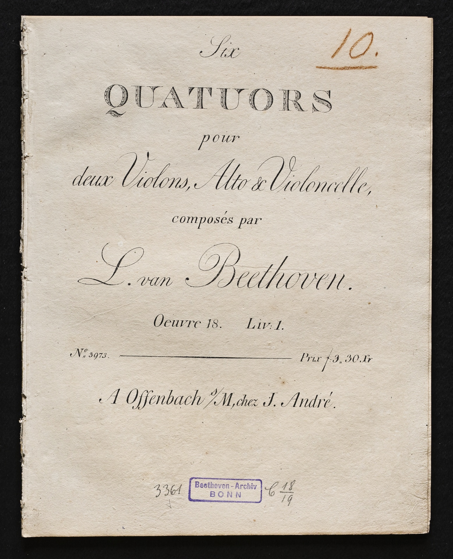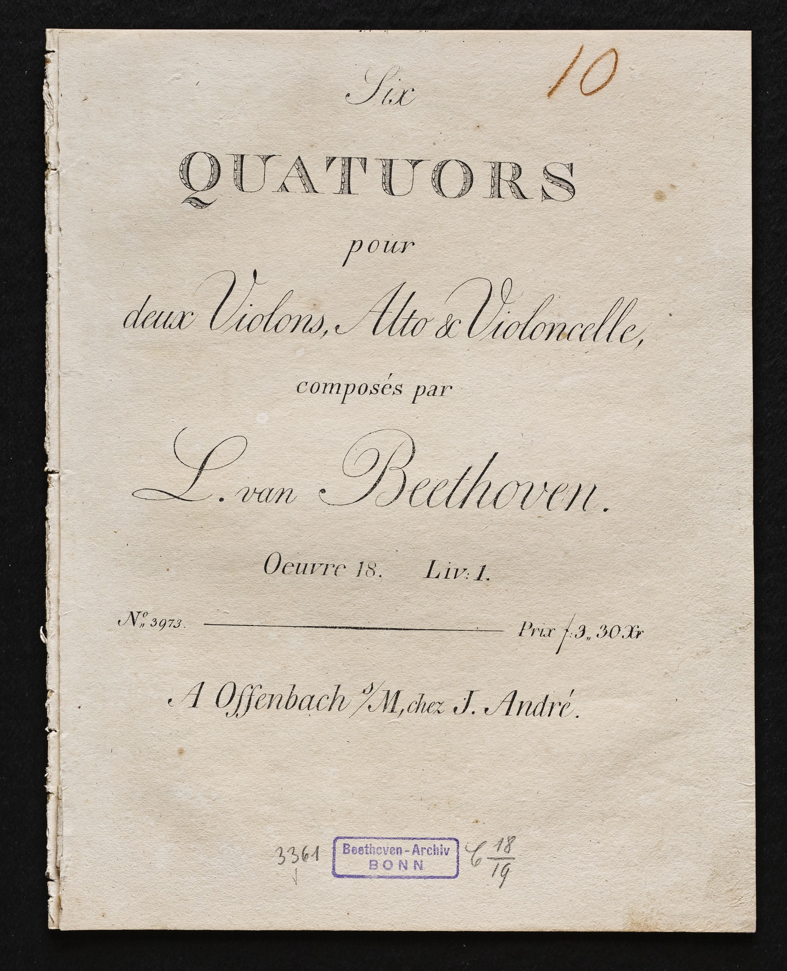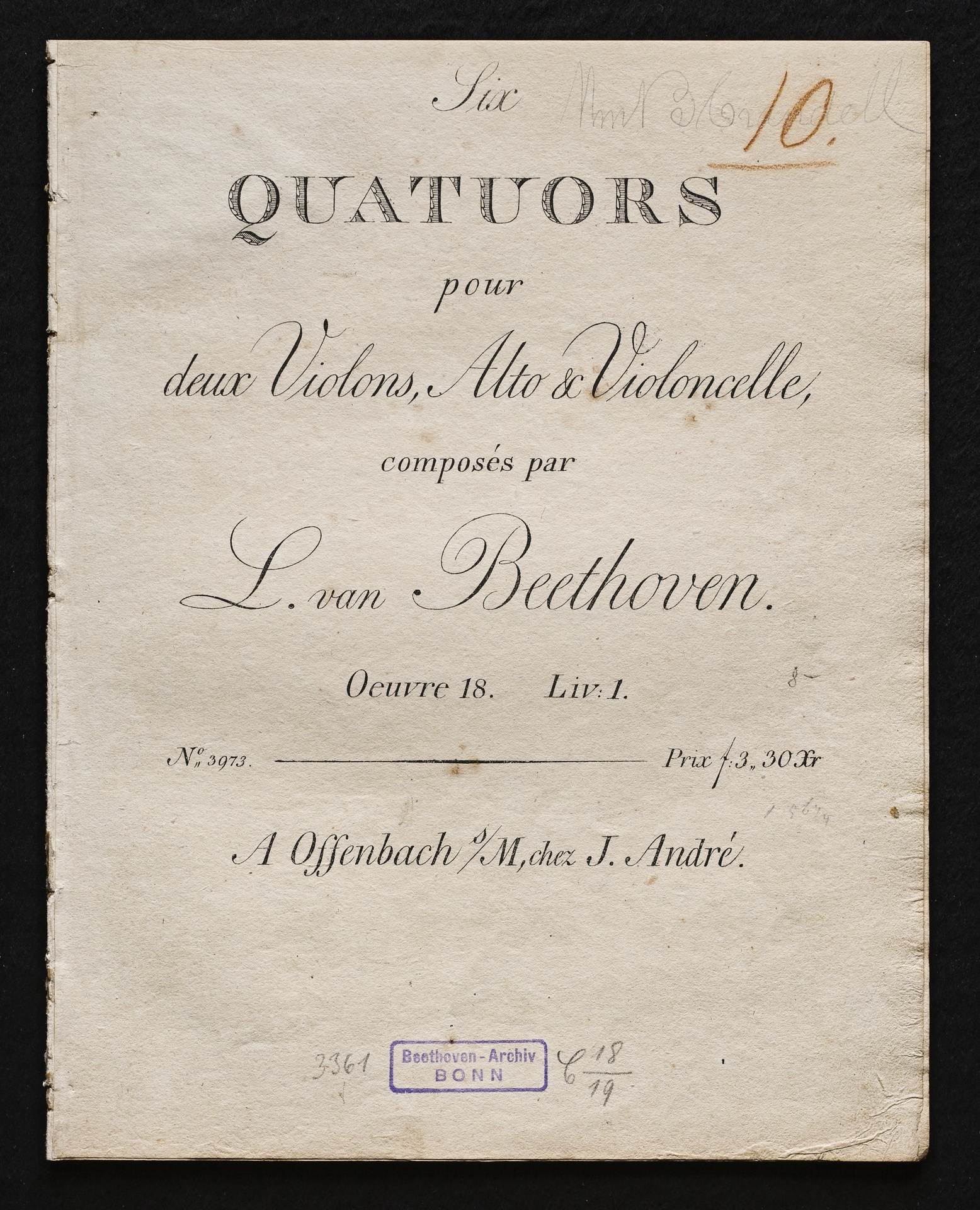 Ludwig van Beethoven, Quartette für 2 Violinen, Viola, Violoncello (F-Dur, G-Dur, D-Dur) op. 18, 1-3, Stimmen, André, 3973