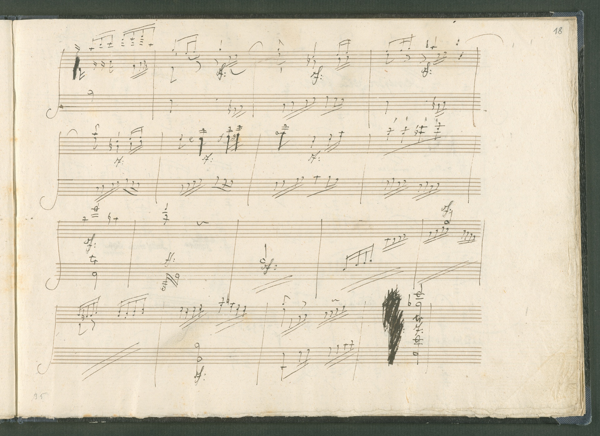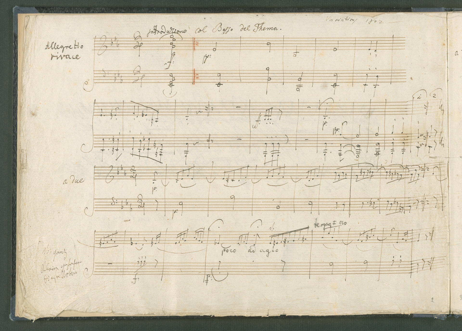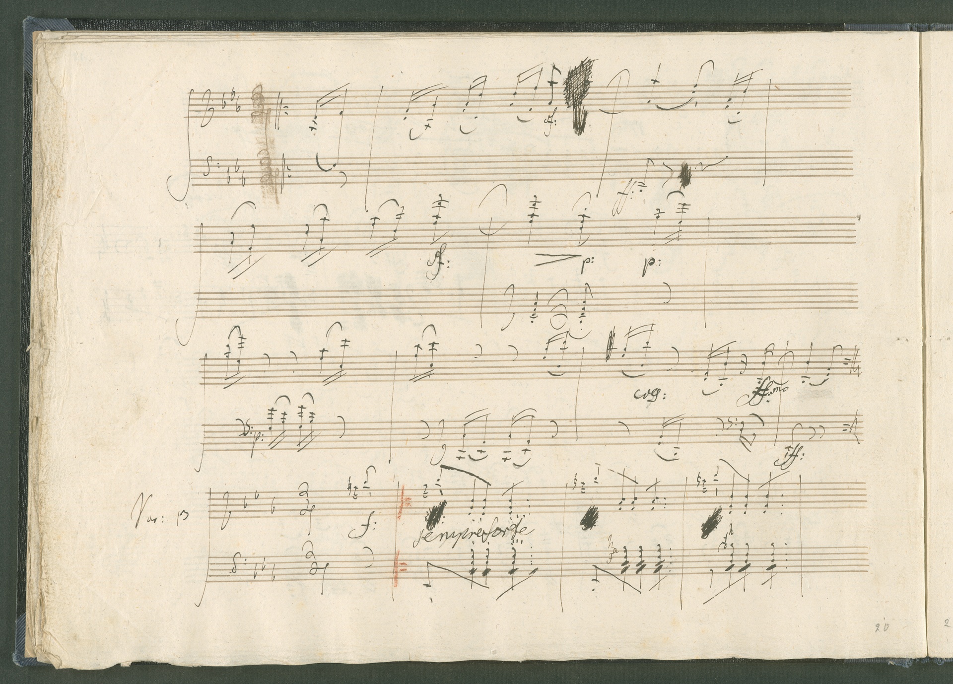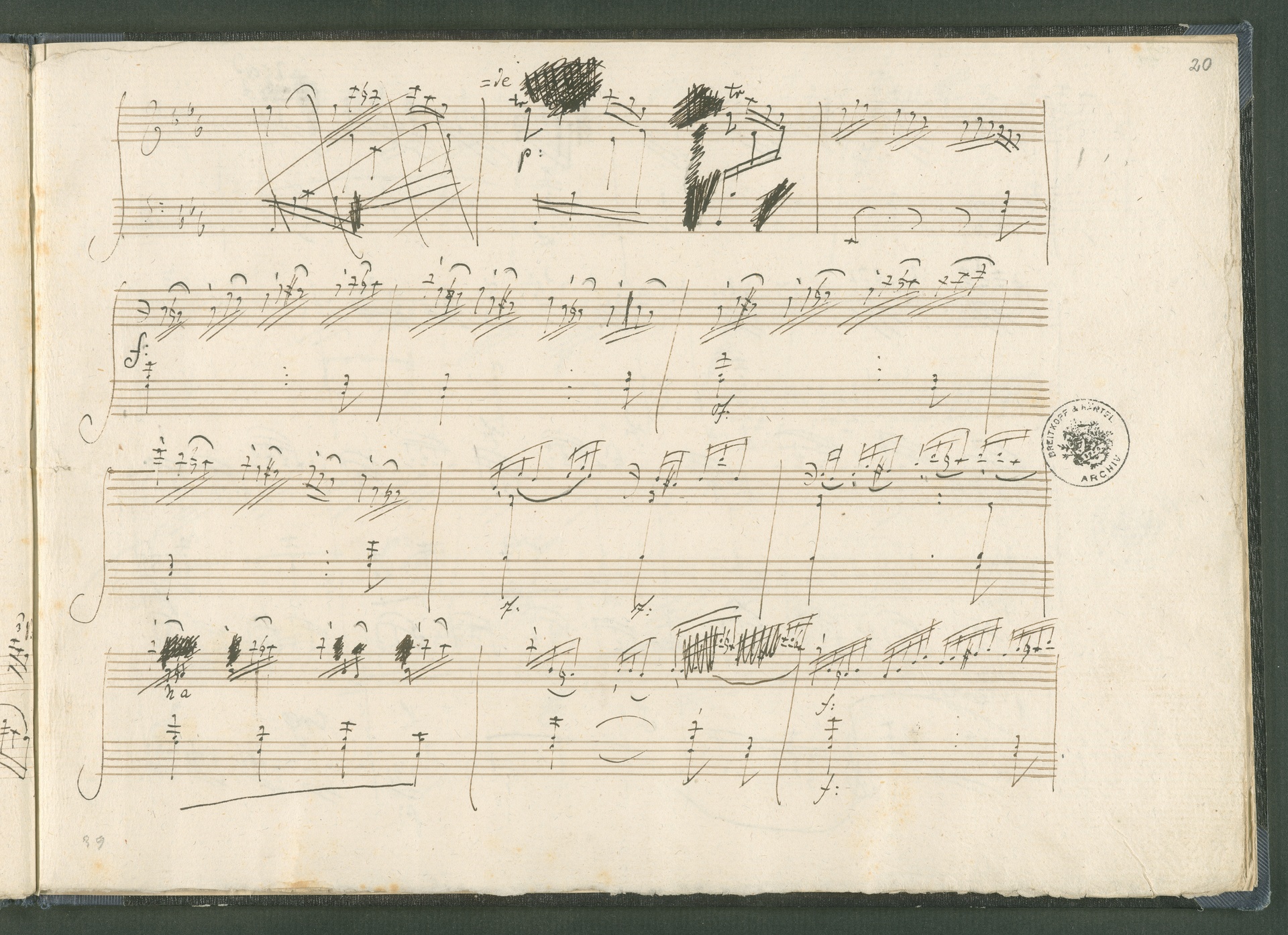 The title page of the autograph score of the "Prometheus" Variations op. 35 certainly immediately catches one's eye. Beethoven crossed out the central inscription several times, rendering it almost illegible. Behind the crossings out there are two versions of an explanatory note, "As I have diverged from the up to now usual method with these v[ariations], I did not want them to continue as my earlier ones, and instead of indicating them like my previous ones by means of a number I have included them in the proper numerical series of my greater musical works, the more so as the themes have been composed by me."