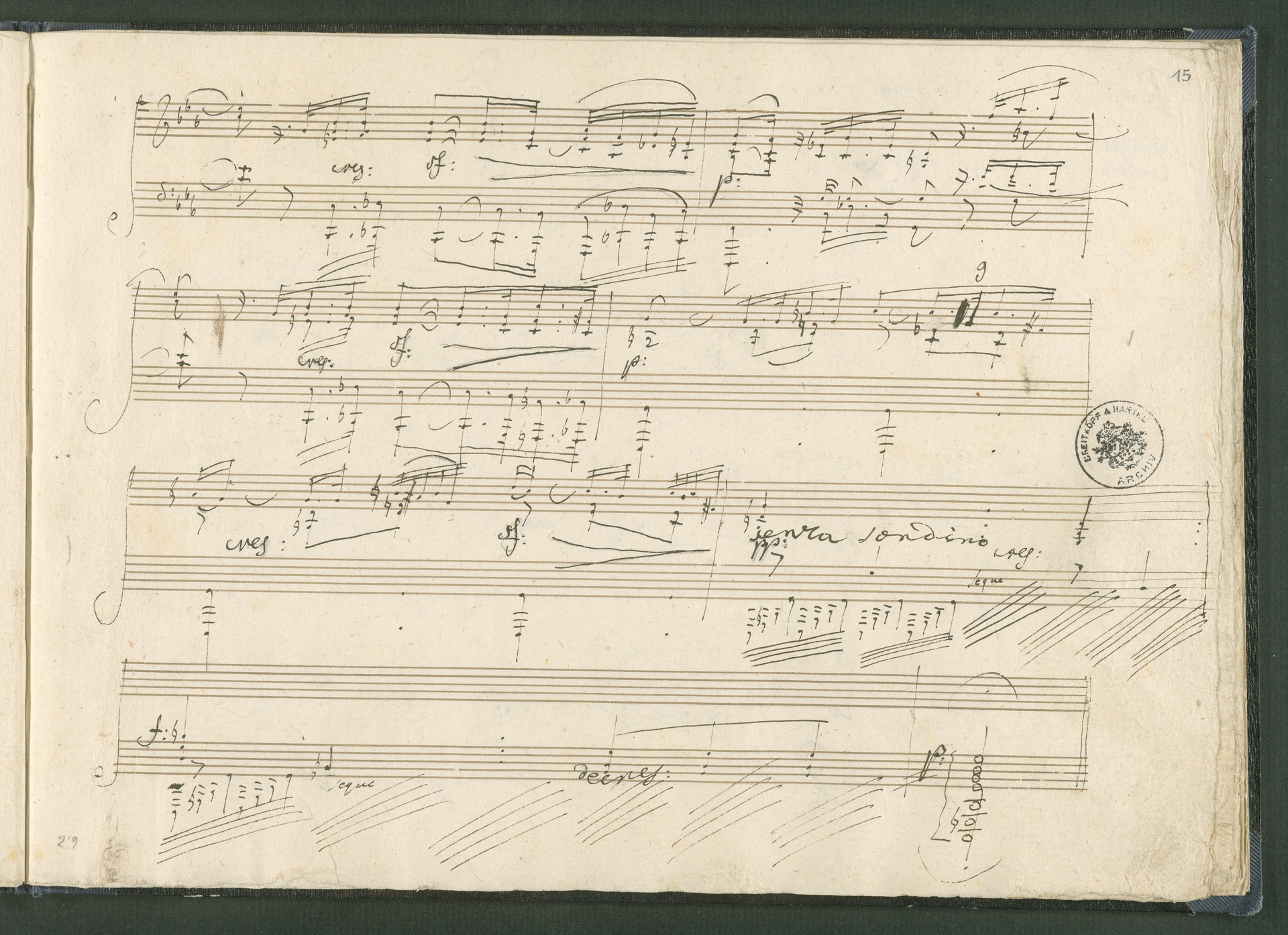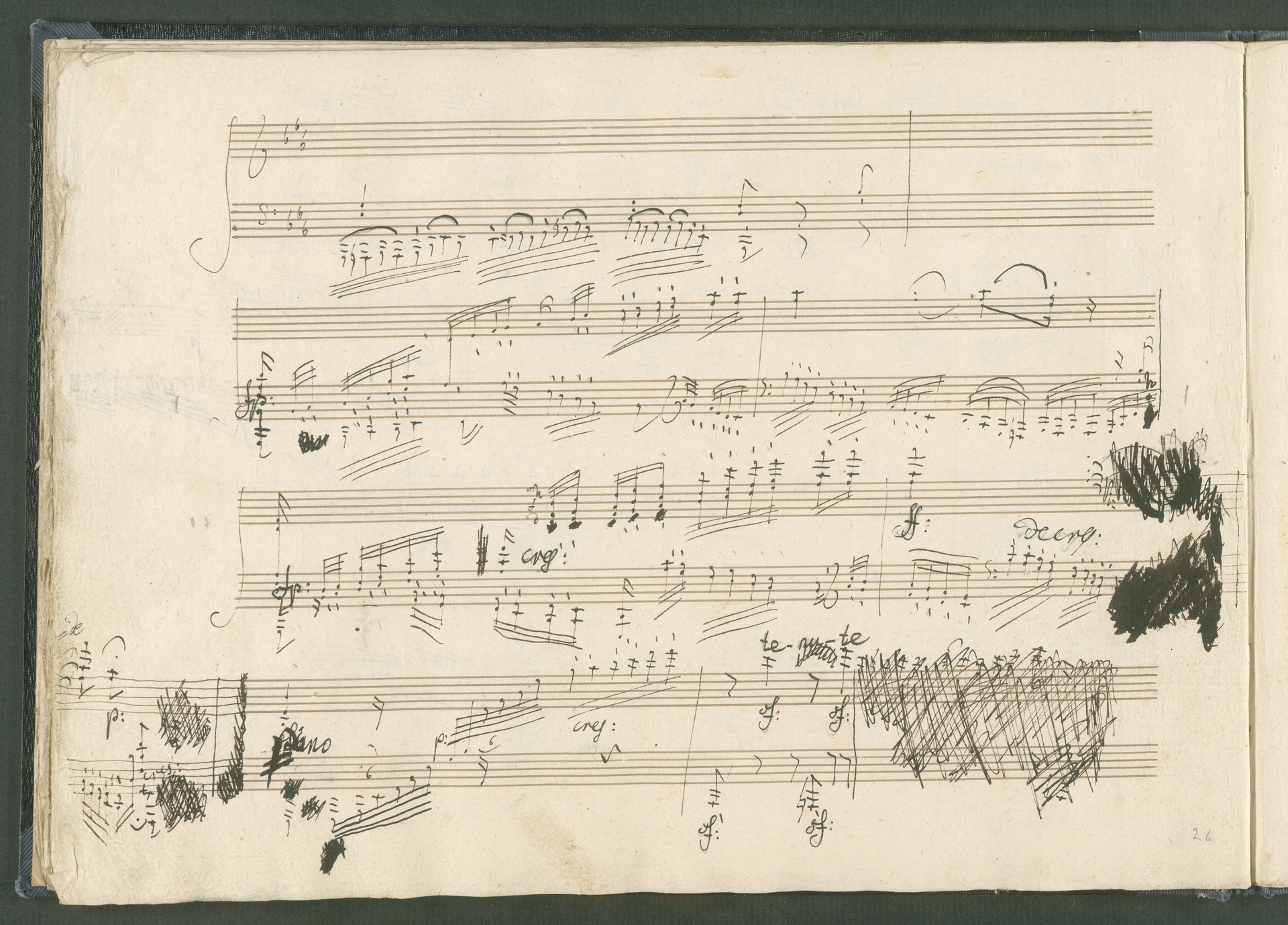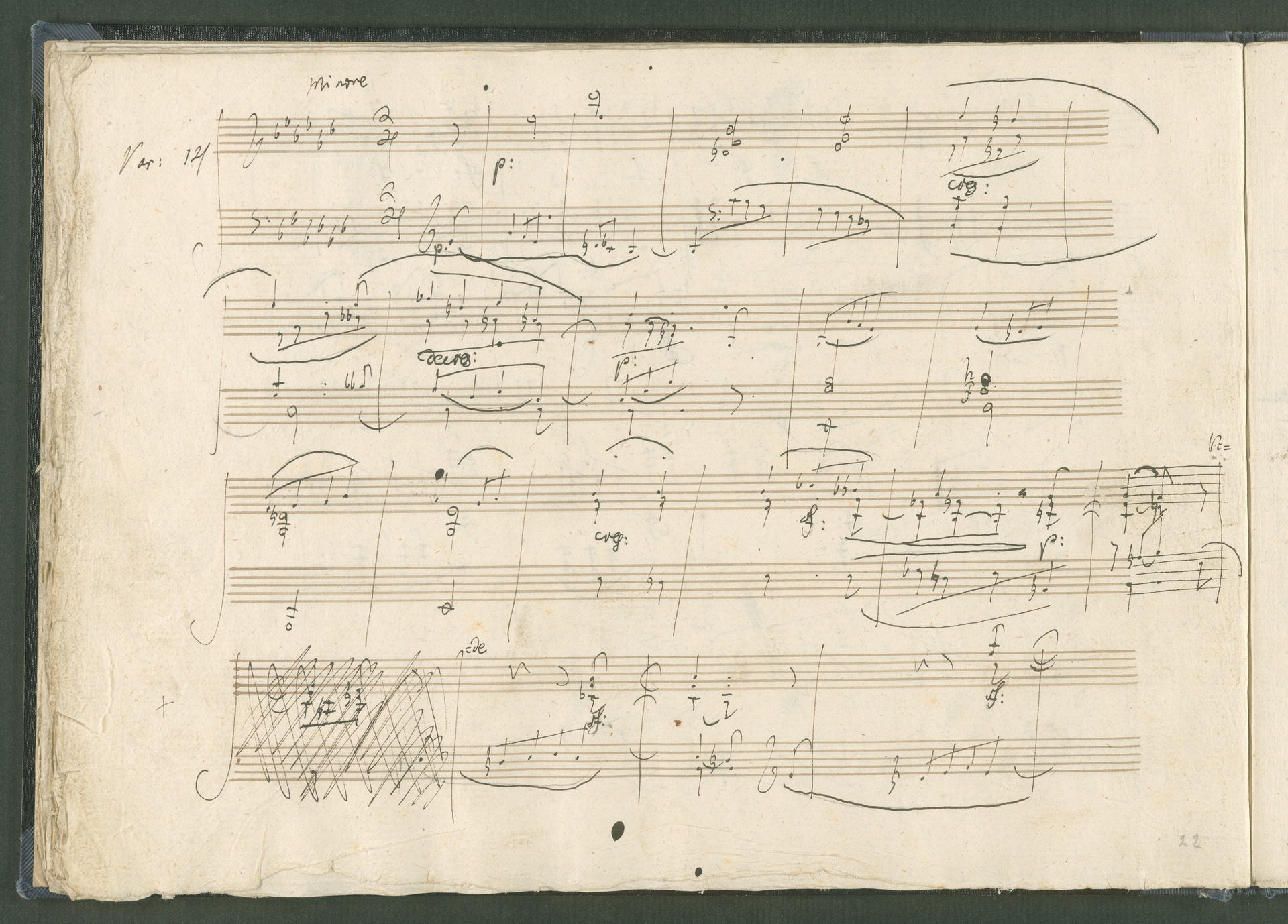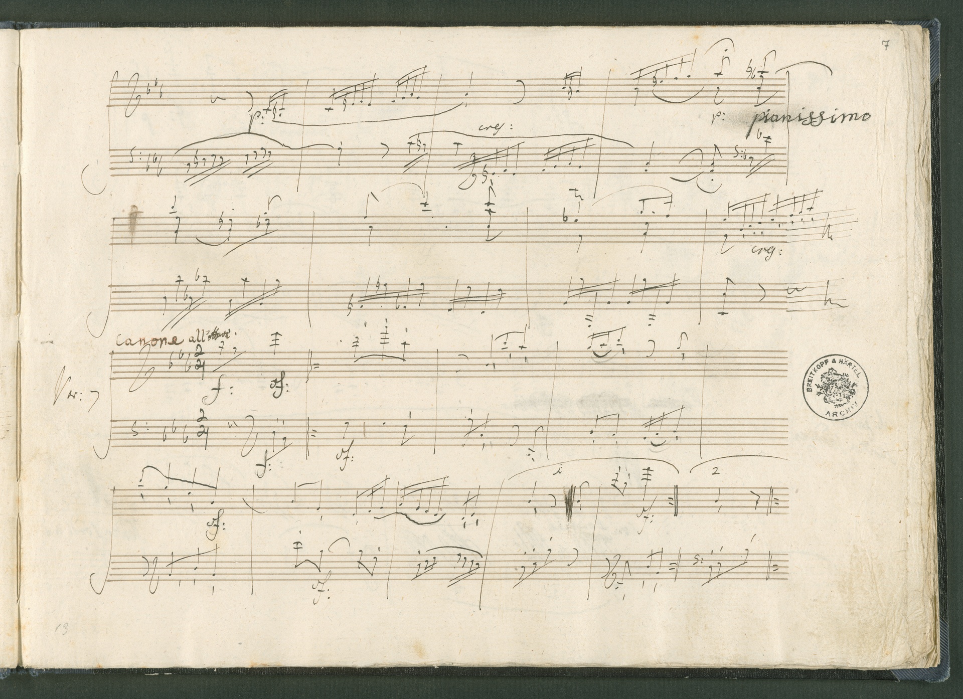 Both times he stresses the new manner of the composition. In a letter to his Leipzig publisher Härtel on 18 October 1802, Beethoven also pointed out the "quite a new manner" in which he had written the Variations. In so doing he refers to the fugues of his fellow composer Anton Reicha, who had added the following to the title "Composés d'après un nouveau système" (composed after a new model). Beethoven condemned this new method in the harshest terms, as can be seen in a further letter to Breitkopf & Härtel in Leipzig on 18 December 1802, in which he consciously distances his variations from them, "Instead of making a great clamour about a new method of writing v[ariations], like our worthy neighbours the Gallo-Franks would make, such as, for instance, when a certain [crossed out: Reicha and replaced with:] French composer presented me with fugues après une nouvelle methode, the method amounting to this, that the fugue is no longer a fugue, and son on - I have wished to draw the attention of those who are not connoisseurs to the fact that at any rate these v[ariations] are different from all others." (From the translation by Emily Anderson, 1961). For this reason, Beethoven asked the publishers in the same letter to put his introductory note on the title of the printed edition, as an explanation. However, this was in vain as the Leipzig publishers could not be persuaded to do so. If the composer was so concerned about having this explanatory note on the title page, why did he cross it out so adamantly? The autograph score was the engraver's model for the Breitkopf & Härtel edition. Perhaps Beethoven had not decided on the final formulation when he sent the manuscript to Leipzig. It is more likely that he was only concerned with the content of the explanatory note, not the actual words themselves, and that he wanted to allow the publishers the freedom to formulate it as they saw fit. Or as Beethoven himself added as a postscript to the same letter of 18 December 1802, "Should you consider it necessary to alter or correct anything, you have my full permission to do so." (from the translation by Emily Anderson, 1961). (J.R.)