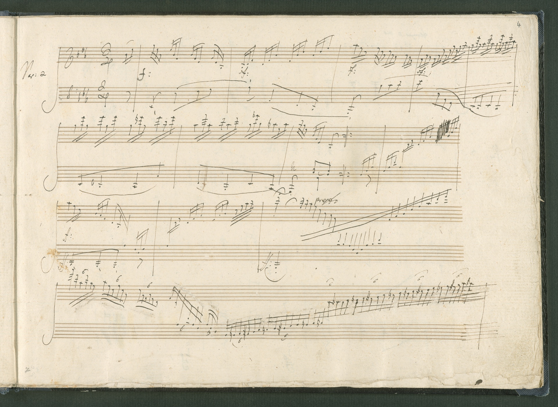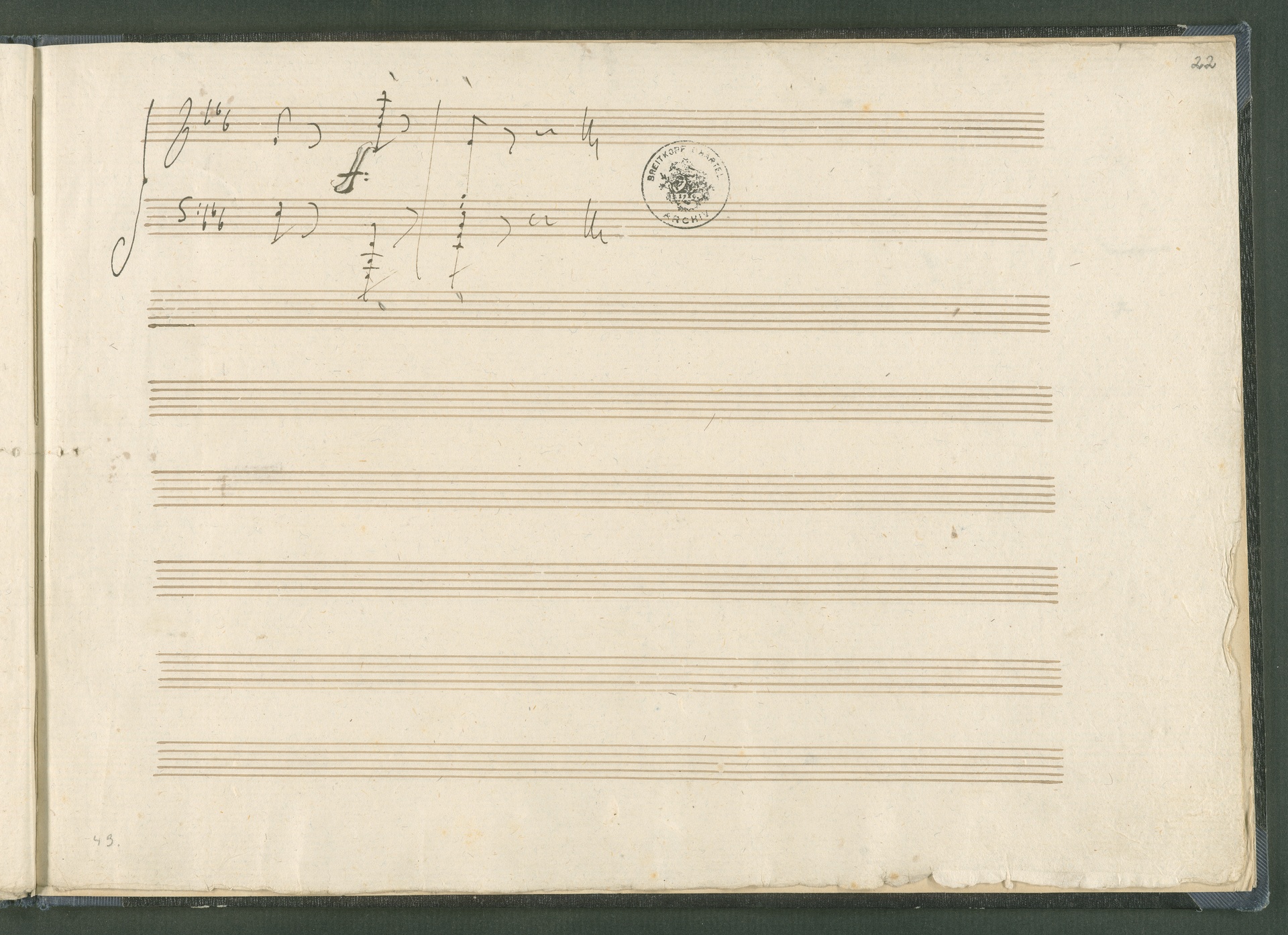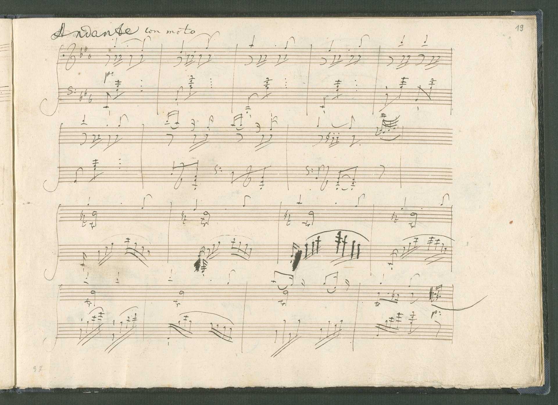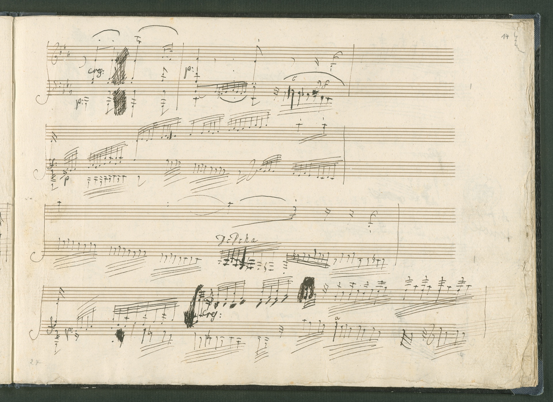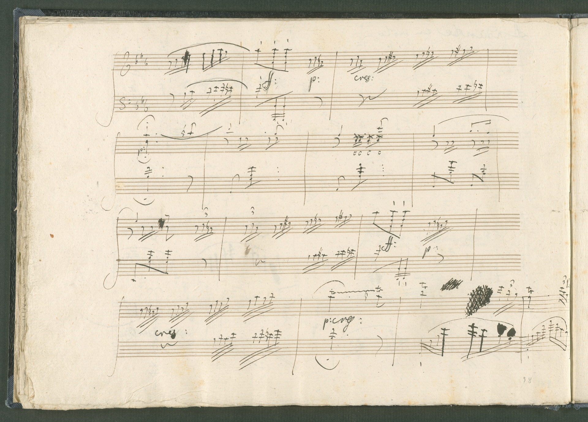 Both times he stresses the new manner of the composition. In a letter to his Leipzig publisher Härtel on 18 October 1802, Beethoven also pointed out the "quite a new manner" in which he had written the Variations. In so doing he refers to the fugues of his fellow composer Anton Reicha, who had added the following to the title "Composés d'après un nouveau système" (composed after a new model). Beethoven condemned this new method in the harshest terms, as can be seen in a further letter to Breitkopf & Härtel in Leipzig on 18 December 1802, in which he consciously distances his variations from them, "Instead of making a great clamour about a new method of writing v[ariations], like our worthy neighbours the Gallo-Franks would make, such as, for instance, when a certain [crossed out: Reicha and replaced with:] French composer presented me with fugues après une nouvelle methode, the method amounting to this, that the fugue is no longer a fugue, and son on - I have wished to draw the attention of those who are not connoisseurs to the fact that at any rate these v[ariations] are different from all others." (From the translation by Emily Anderson, 1961). For this reason, Beethoven asked the publishers in the same letter to put his introductory note on the title of the printed edition, as an explanation. However, this was in vain as the Leipzig publishers could not be persuaded to do so. If the composer was so concerned about having this explanatory note on the title page, why did he cross it out so adamantly? The autograph score was the engraver's model for the Breitkopf & Härtel edition. Perhaps Beethoven had not decided on the final formulation when he sent the manuscript to Leipzig. It is more likely that he was only concerned with the content of the explanatory note, not the actual words themselves, and that he wanted to allow the publishers the freedom to formulate it as they saw fit. Or as Beethoven himself added as a postscript to the same letter of 18 December 1802, "Should you consider it necessary to alter or correct anything, you have my full permission to do so." (from the translation by Emily Anderson, 1961). (J.R.)