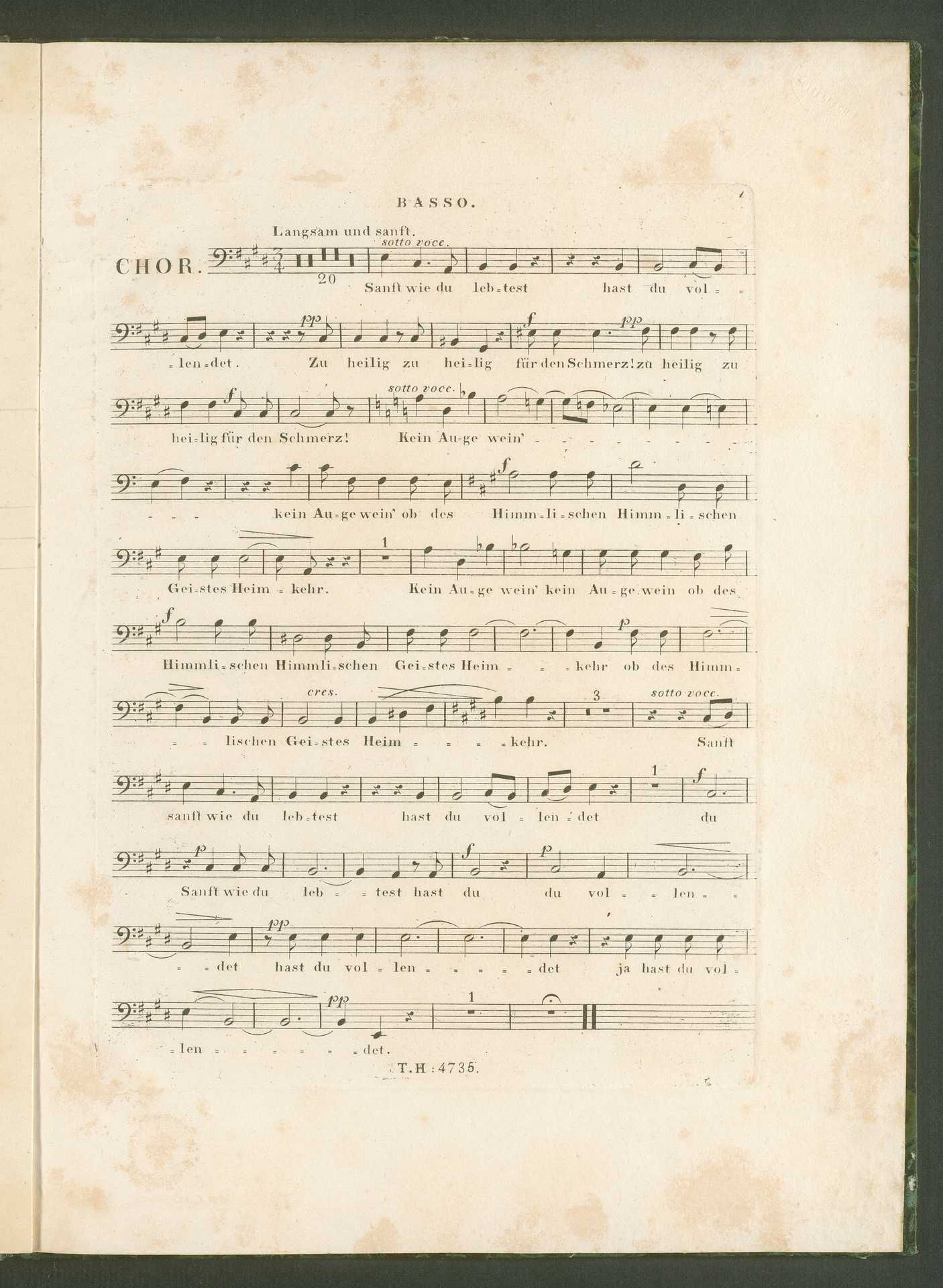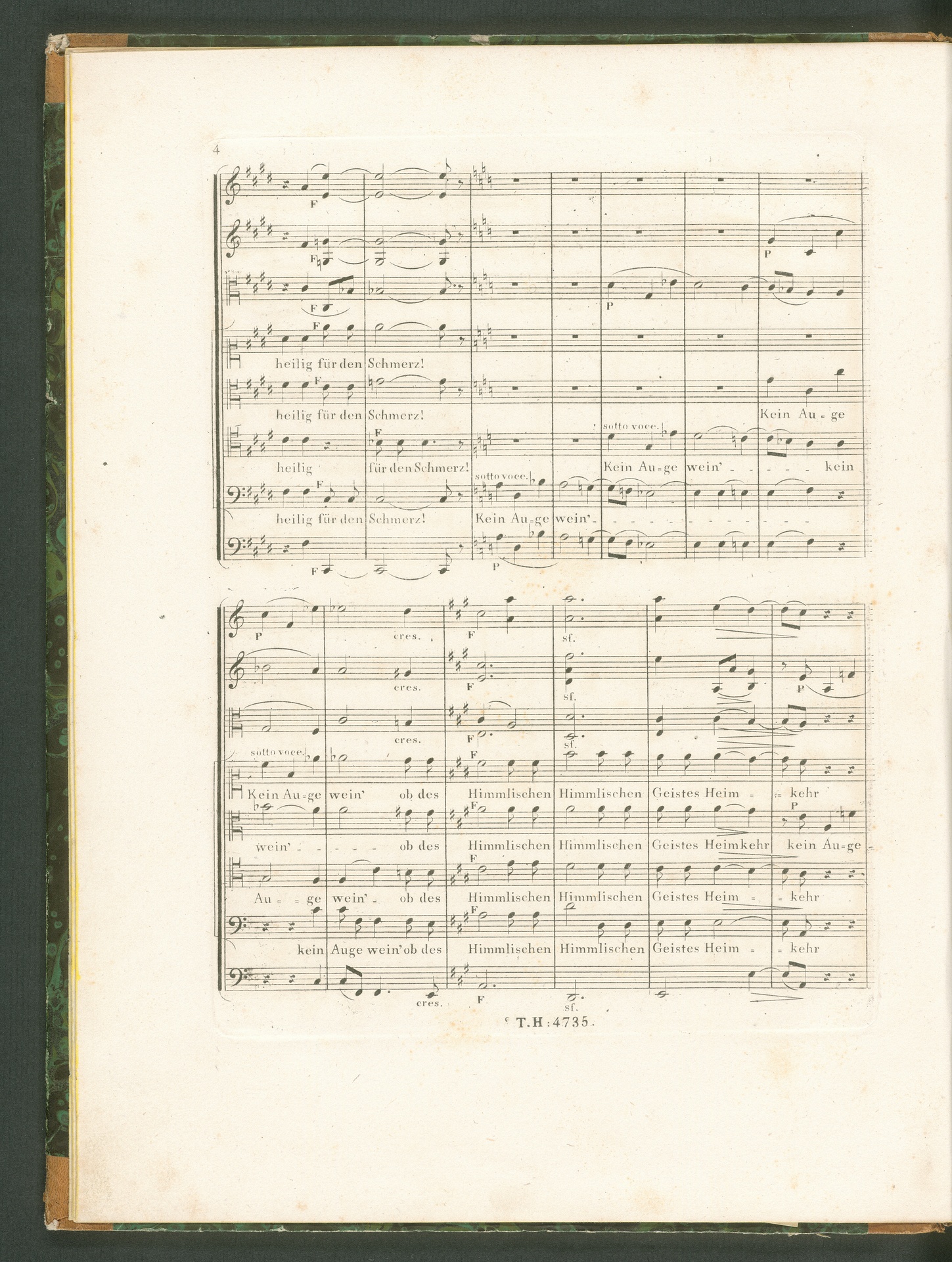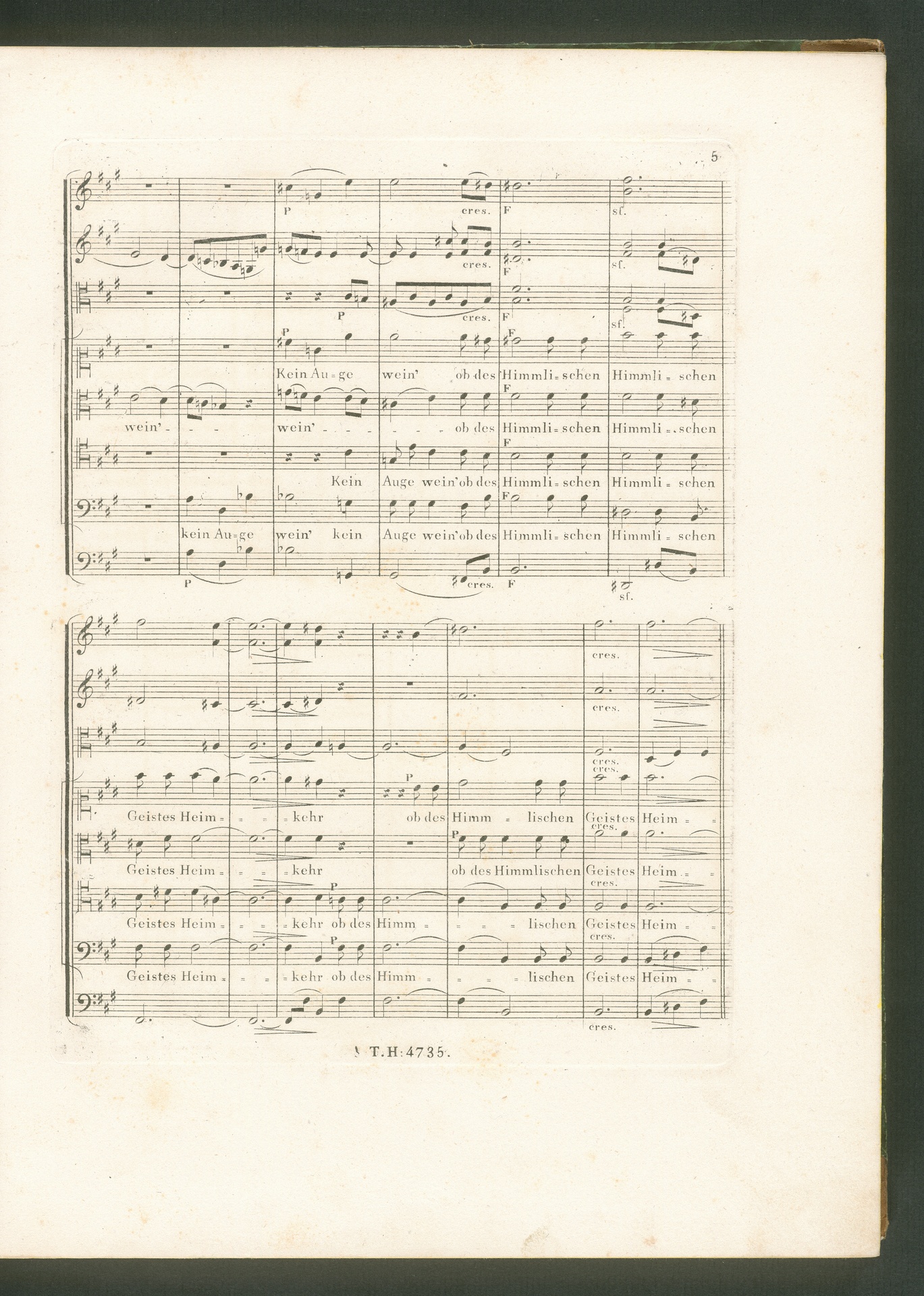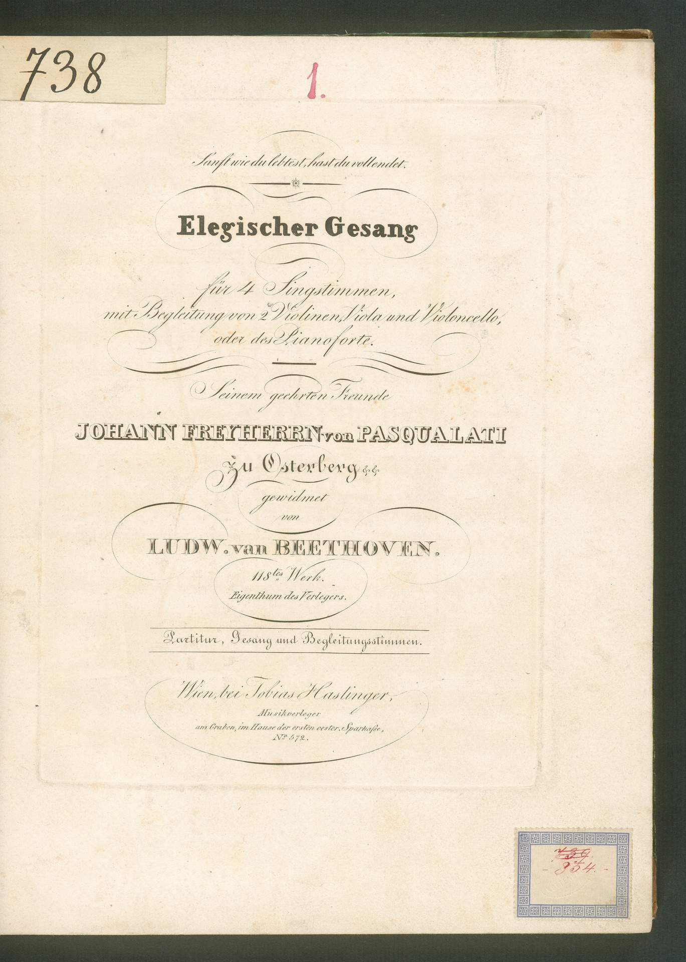 Ludwig van Beethoven, "Elegischer Gesang", Lied für 4 Singstimmen, 2 Violinen, Viola und Violoncello op. 118, Partitur, Klavierauszug und Stimmen, Haslinger, 4735