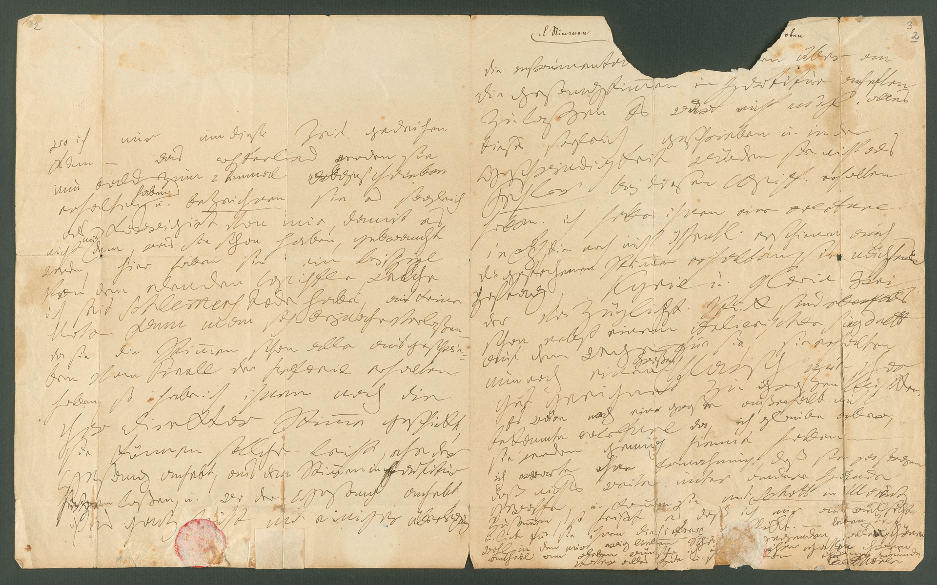 Ferdinand Ries had received orchestral material from Beethoven for the Aachen Music Festival in 1825. In this letter Beethoven tells him of a small correction for the Symphony op. 125. He announces another copy of the Opferlied op. 121 because the first one contained too many mistakes. In addition another choral score of the finale of the Ninth Symphony as well as scores or orchestral material for the Overture op. 115, Kyrie and Gloria of the Mass op. 123, the Terzetto op. 116 and op. 114 are all in the post.