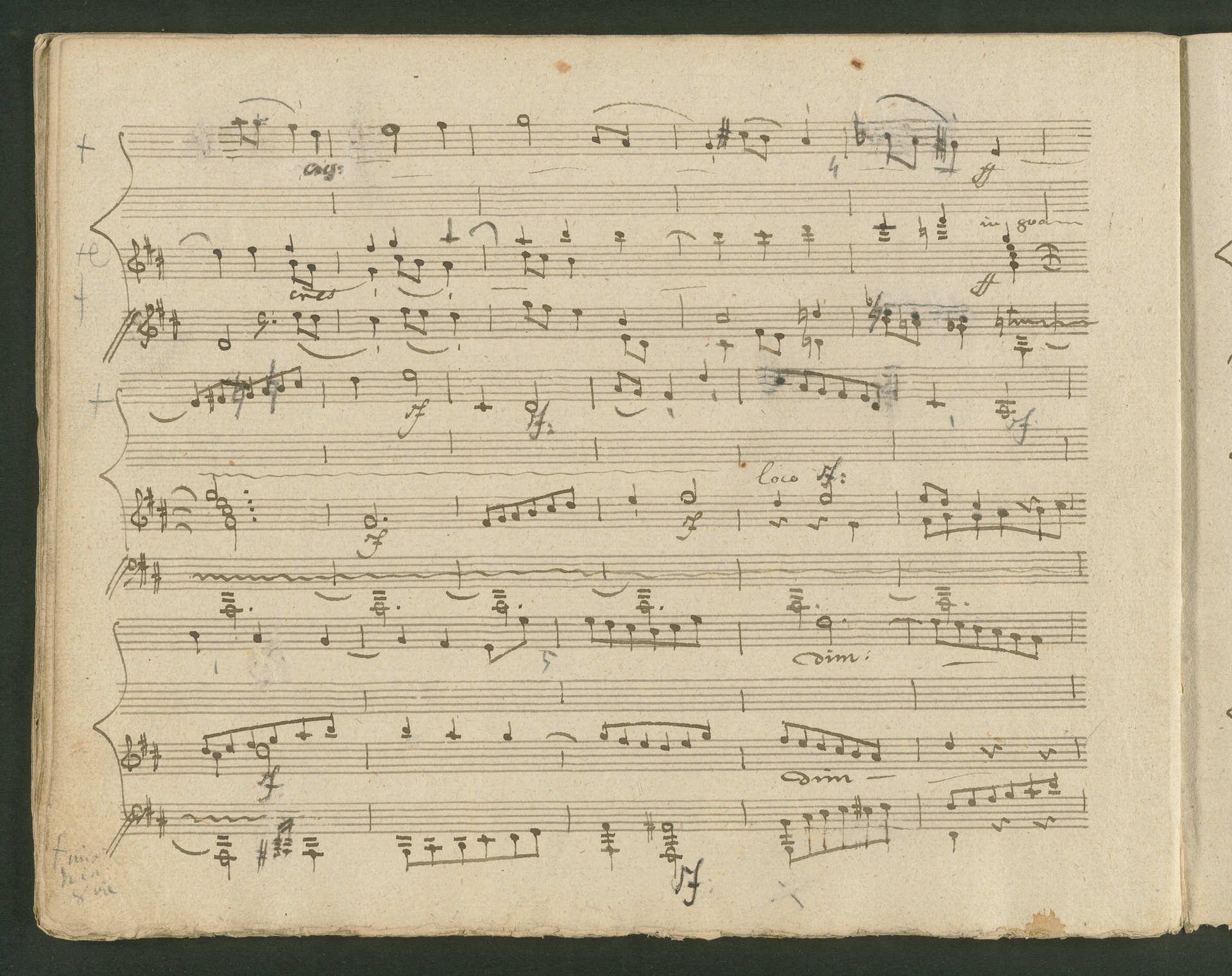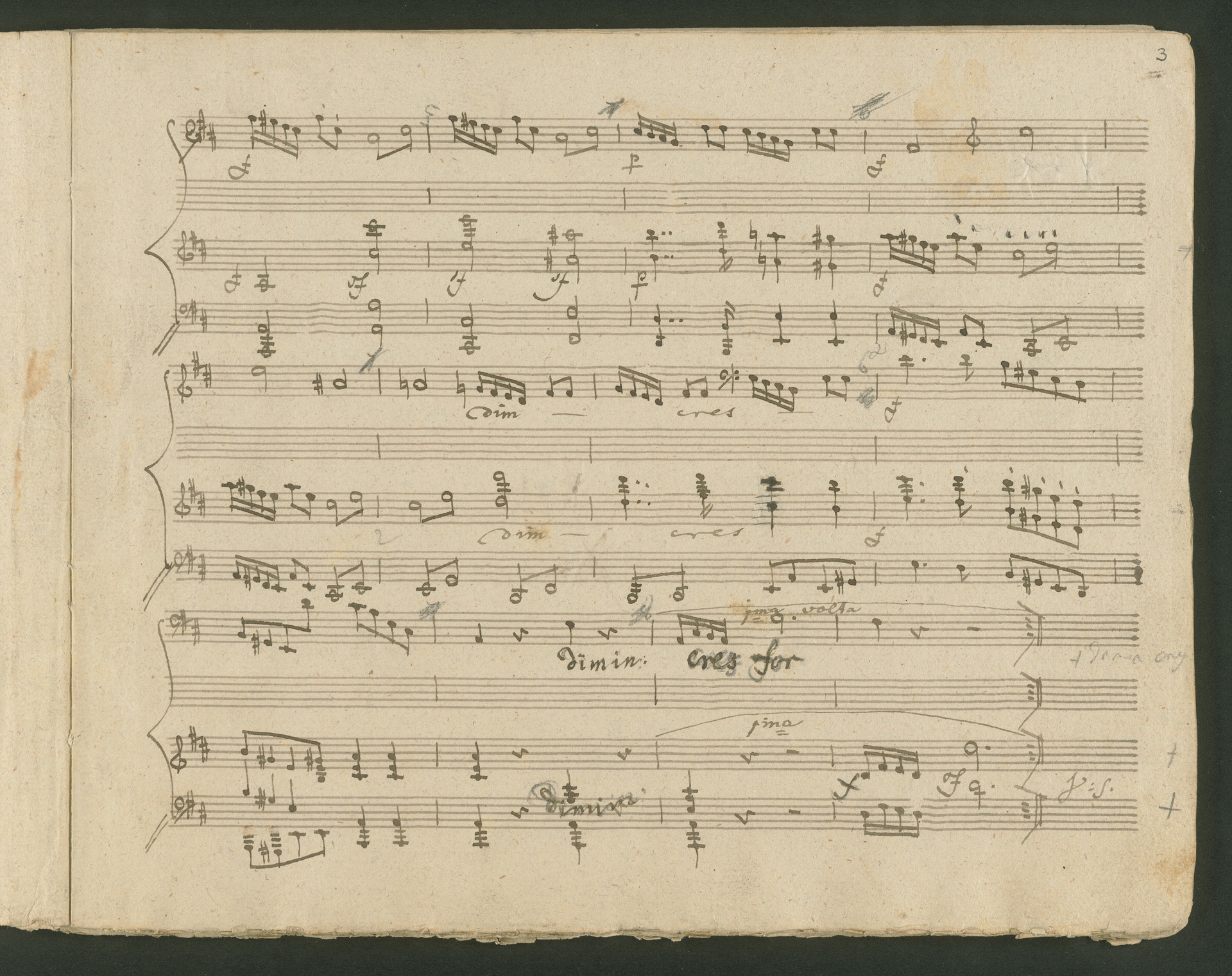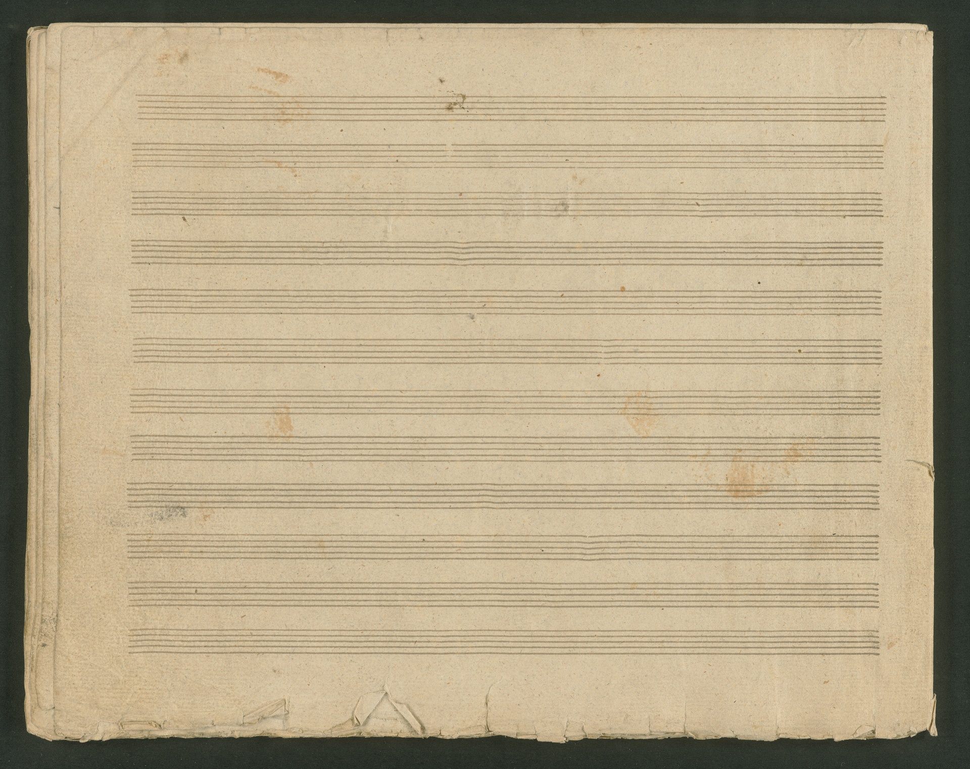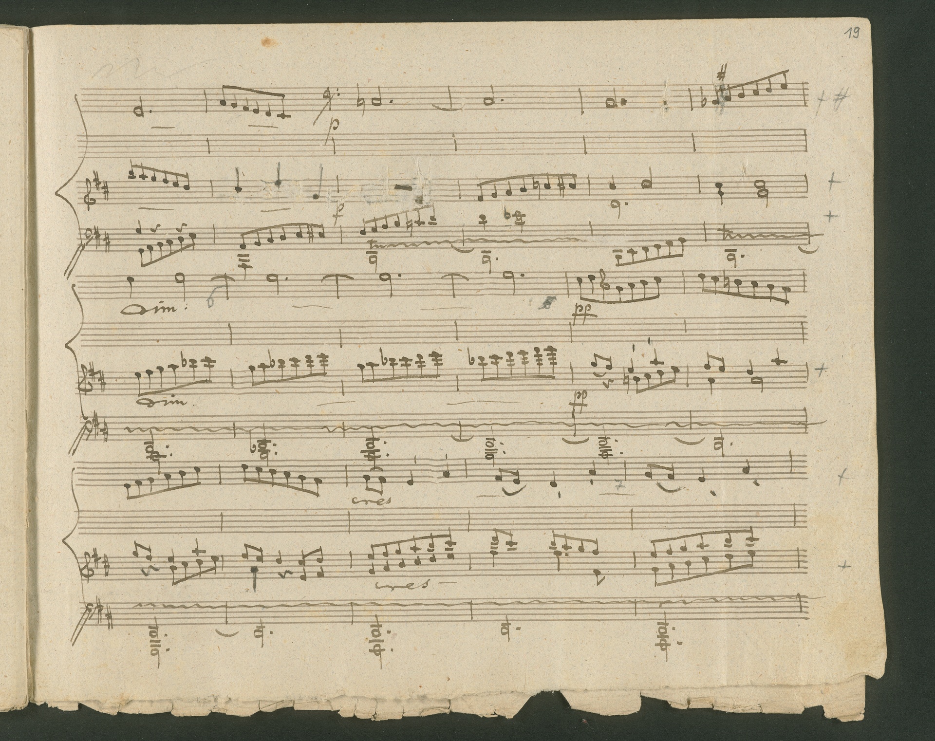 The critic in the Allgemeine musikalische Zeitung of 1818 was obviously very surprised, probably even overtaxed by the two Cello Sonatas op. 102. Too accustomed to light, pleasing and brilliant works, the critic was not able to cope with the two sonatas, as the rest of the review shows. At least at the end, he praises the "cultured publisher" for the practical edition, which "greatly relieves the understanding". The publisher was Nikolaus Simrock in Bonn, who had published quite a few of Beethoven's works. The corrected copies shown here are the two engraver's models for the original edition of op. 102. In both copies preparations for printing can clearly be seen: crosses and entries with which the engraver determines the layout of the pages for the printed edition. (J.R.)