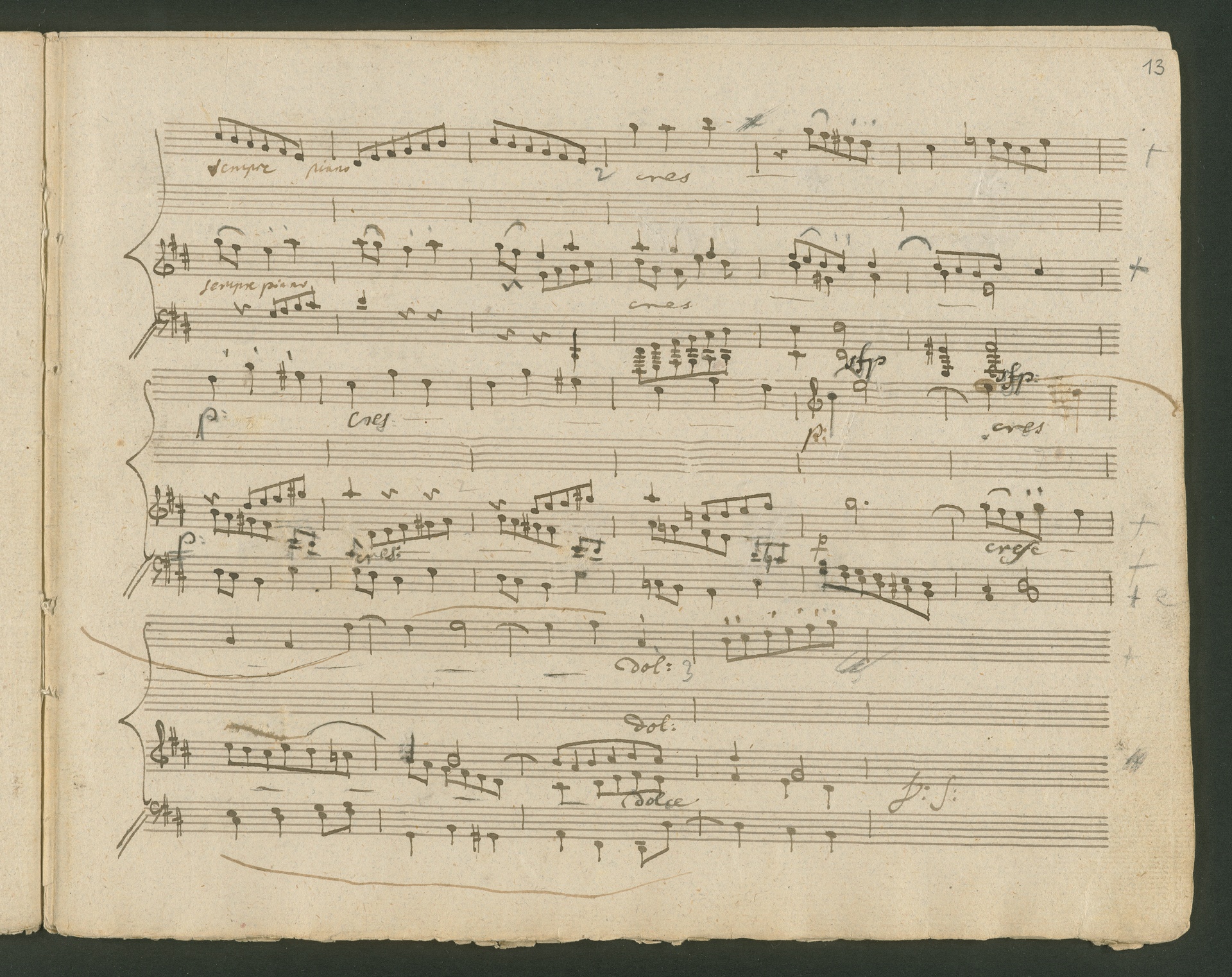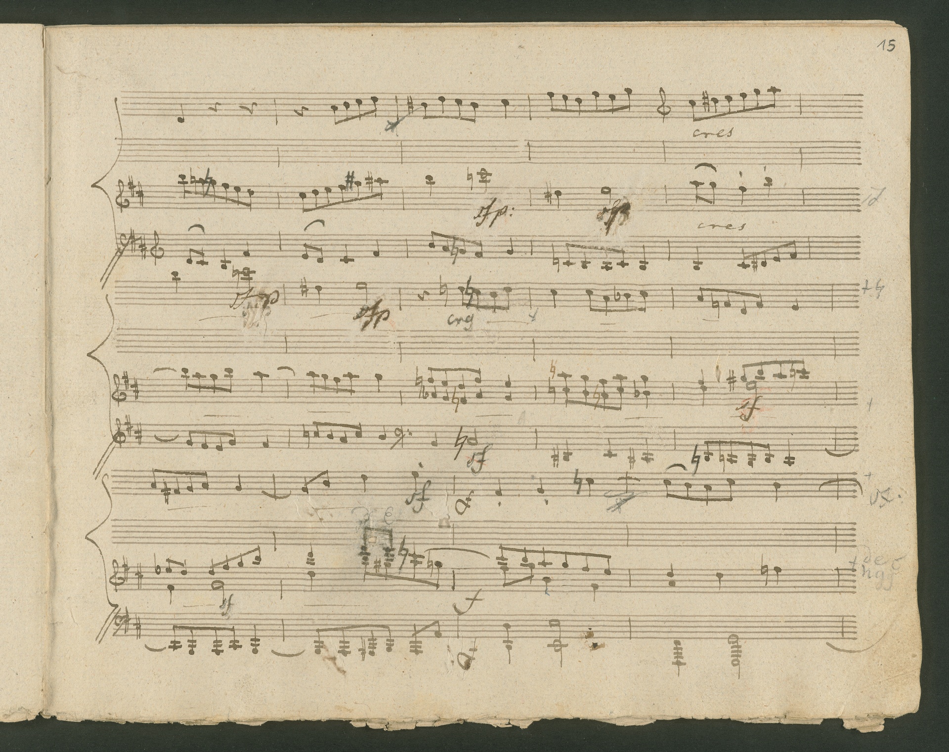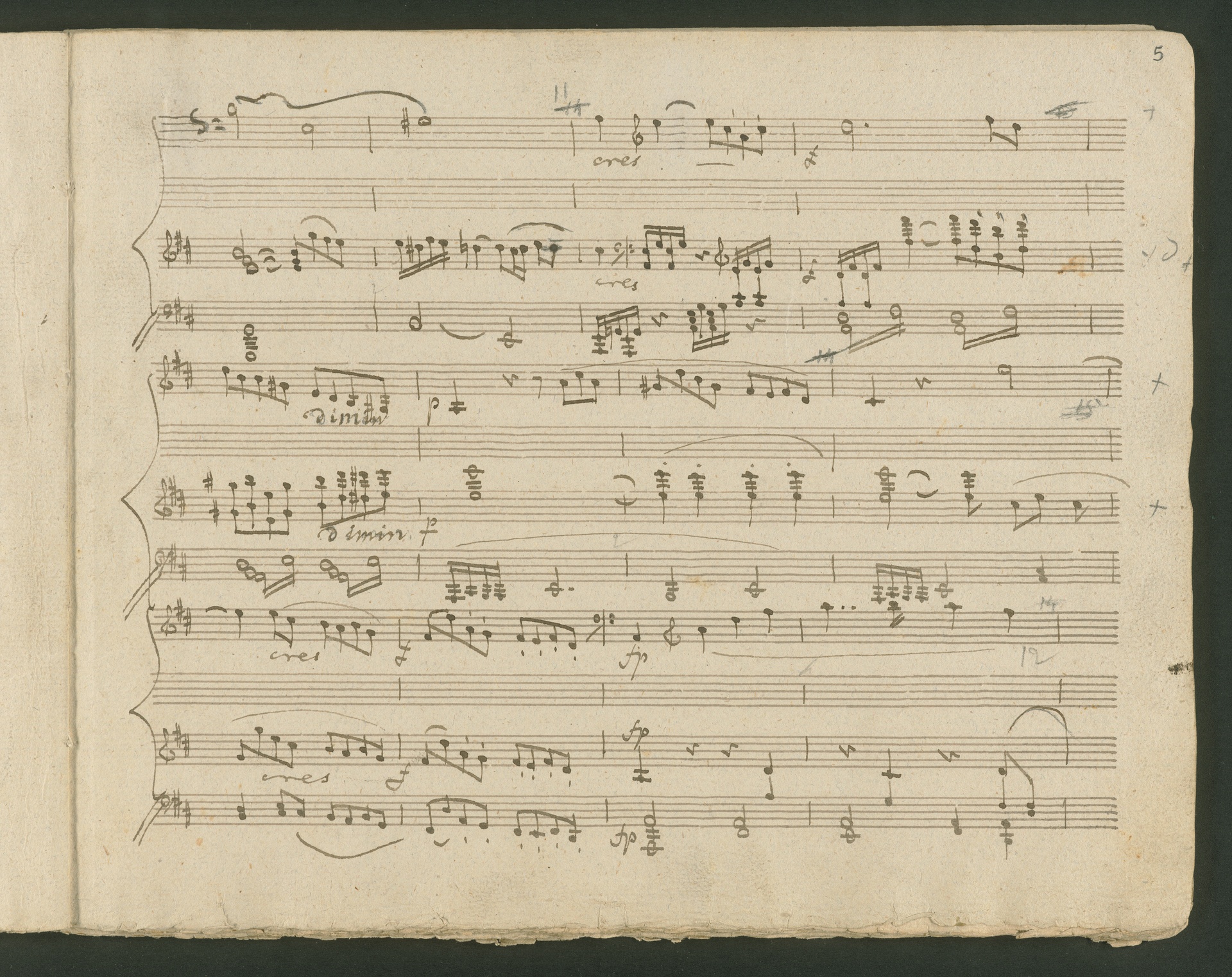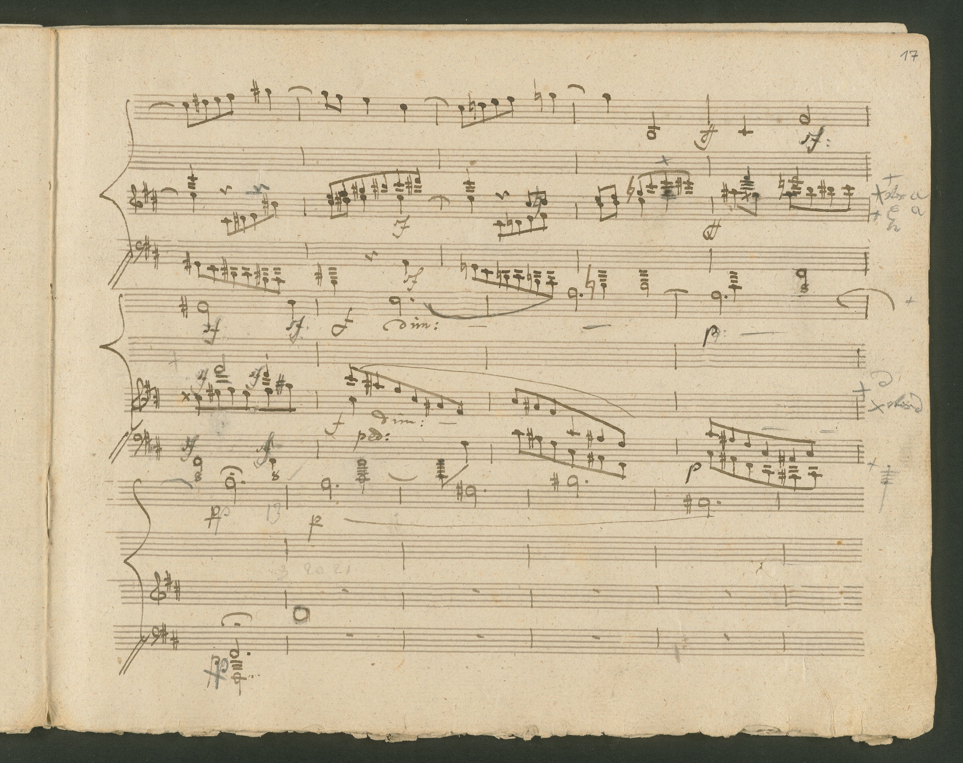 The critic in the Allgemeine musikalische Zeitung of 1818 was obviously very surprised, probably even overtaxed by the two Cello Sonatas op. 102. Too accustomed to light, pleasing and brilliant works, the critic was not able to cope with the two sonatas, as the rest of the review shows. At least at the end, he praises the "cultured publisher" for the practical edition, which "greatly relieves the understanding". The publisher was Nikolaus Simrock in Bonn, who had published quite a few of Beethoven's works. The corrected copies shown here are the two engraver's models for the original edition of op. 102. In both copies preparations for printing can clearly be seen: crosses and entries with which the engraver determines the layout of the pages for the printed edition. (J.R.)