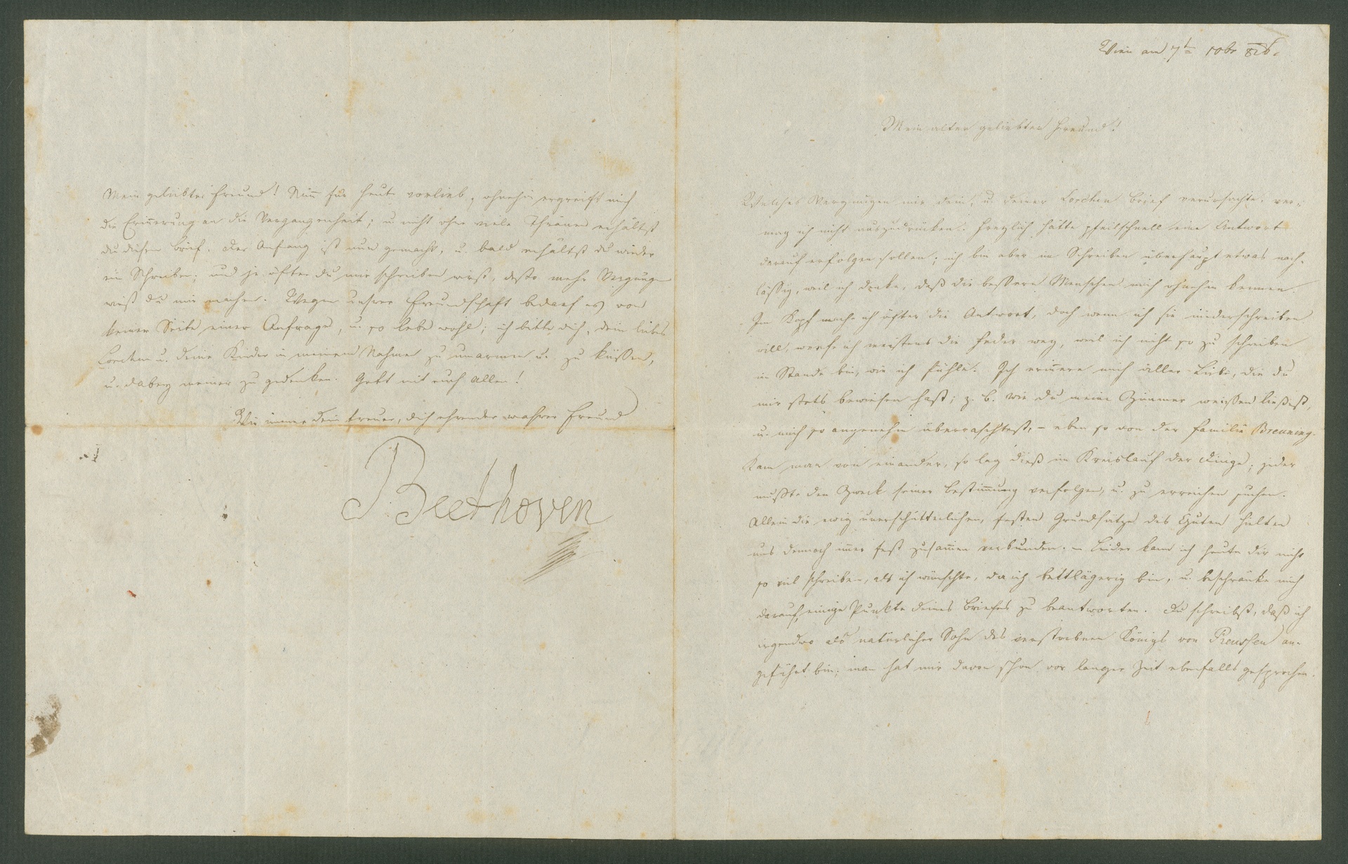 Beethoven thanks his friend Wegeler and his wife Eleonore (née von Breuning) for their letters (Beethoven-Haus, NE 55, BGA 2100 and NE 56, BGA 2101). He apologizes for his late reply (the letters had been written at the end of 1825). Unfortunately he is often not able to put his feelings into words. He had already written a reply in his head, but had not been able to formulate it. As he is ill, this letter will also only concentrate on what is necessary. (At the time of writing the letter, which he dictated to his nephew, Beethoven was already on his sick-bed and never left it again.)