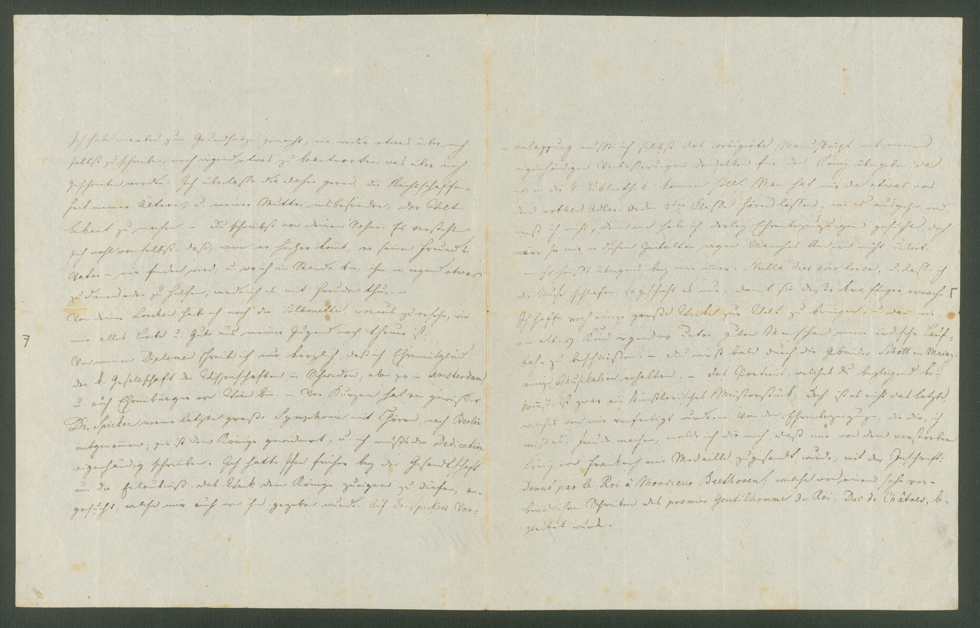 If Wegeler's son (Julius Stephan) really does come to Vienna, Beethoven promises to take him in as his own. Beethoven then lists decorations he has received to date and proudly draws his attention to the medal which the King of France had sent him on the occasion of his subscription to the Missa solemnis (op. 123). He also mentions the dedication of the Ninth Symphony to the King of Prussia, expressing his hope that he will receive a decoration from the King for this.