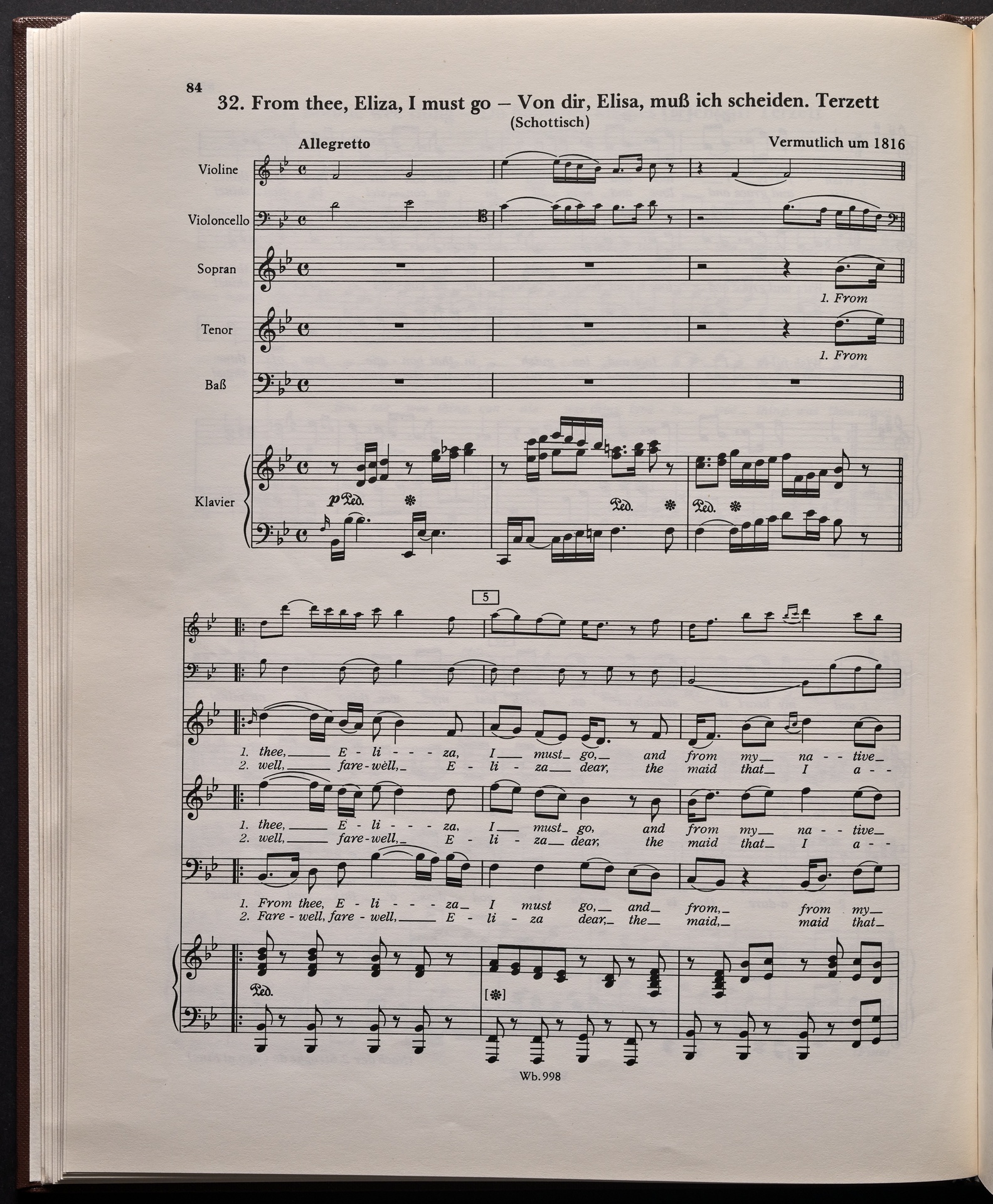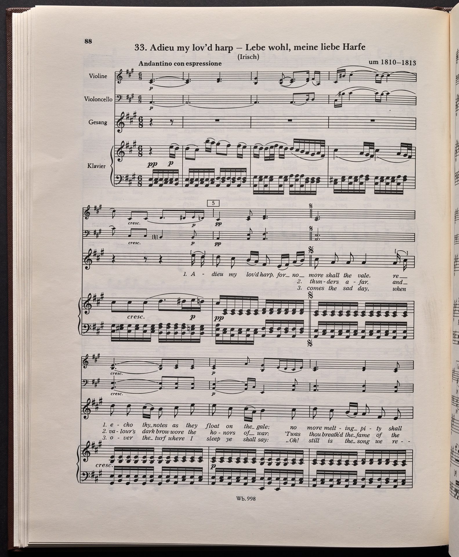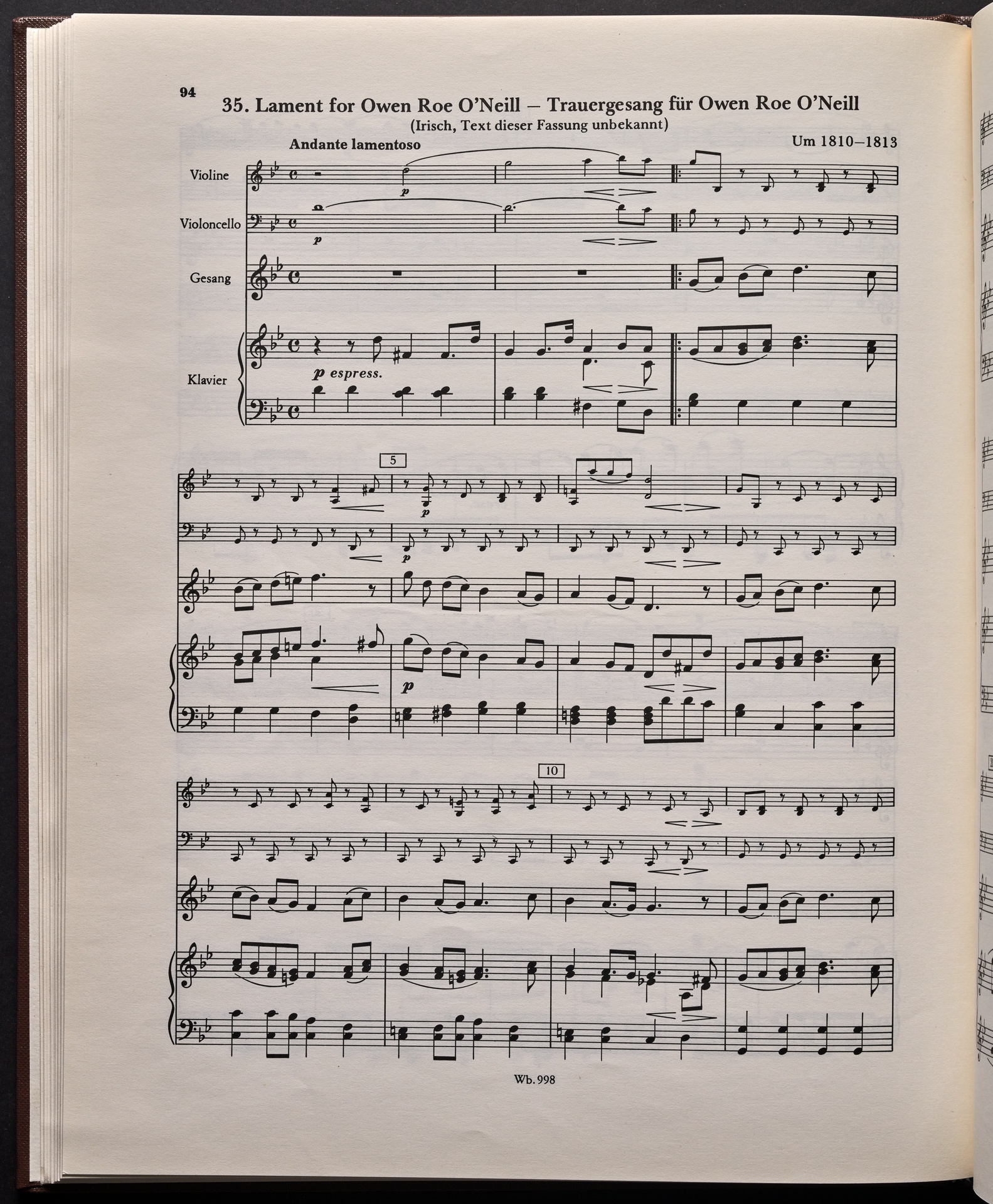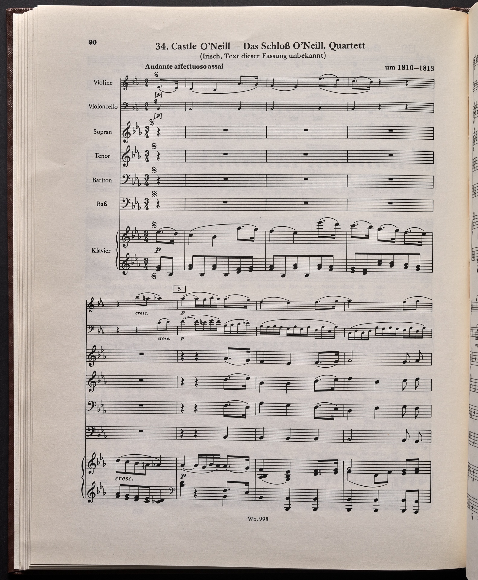 Ludwig van Beethoven, "Castle O'Neill", Lied für 4 Singstimmen, Violine, Violoncello und Klavier WoO 154, 62, Breitkopf und Härtel, 998
