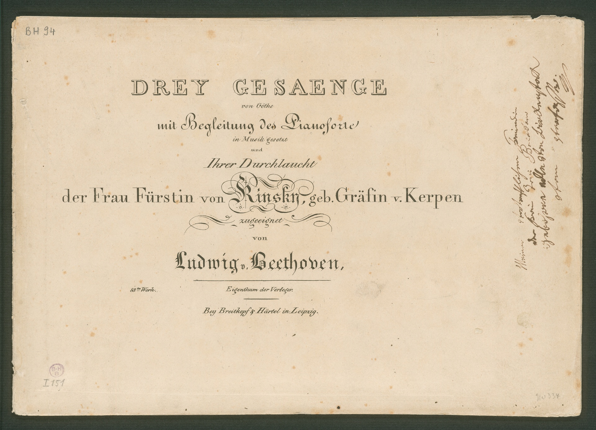 Ludwig van BeethovenJohann Wolfgang von Goethe, Gesänge für Singstimme und Klavier nach Gedichten von Johann Wolfgang von Goethe op. 83, 1-3, Breitkopf und Härtel, 1596, mit handschriftlichen Eintragungen Beethovens