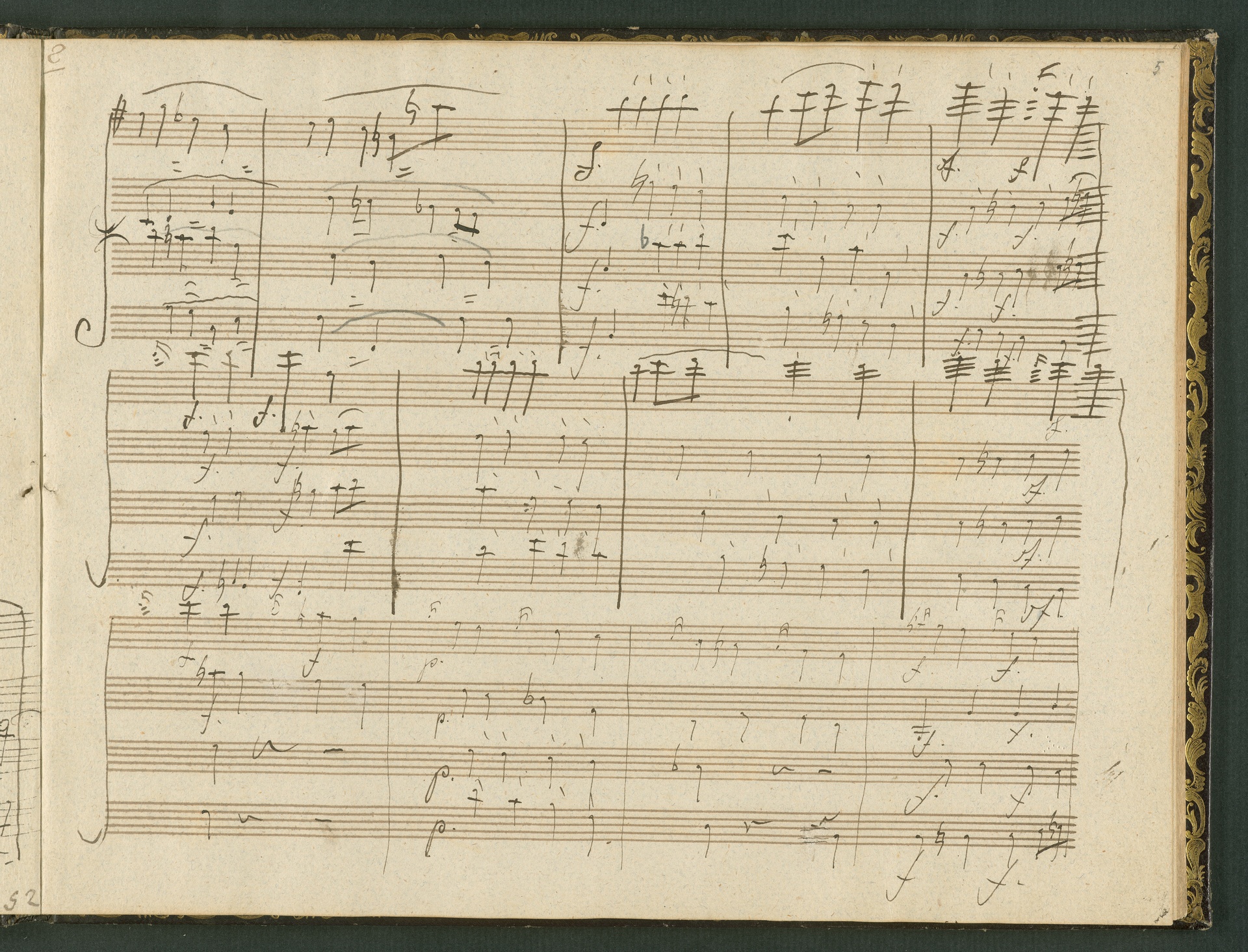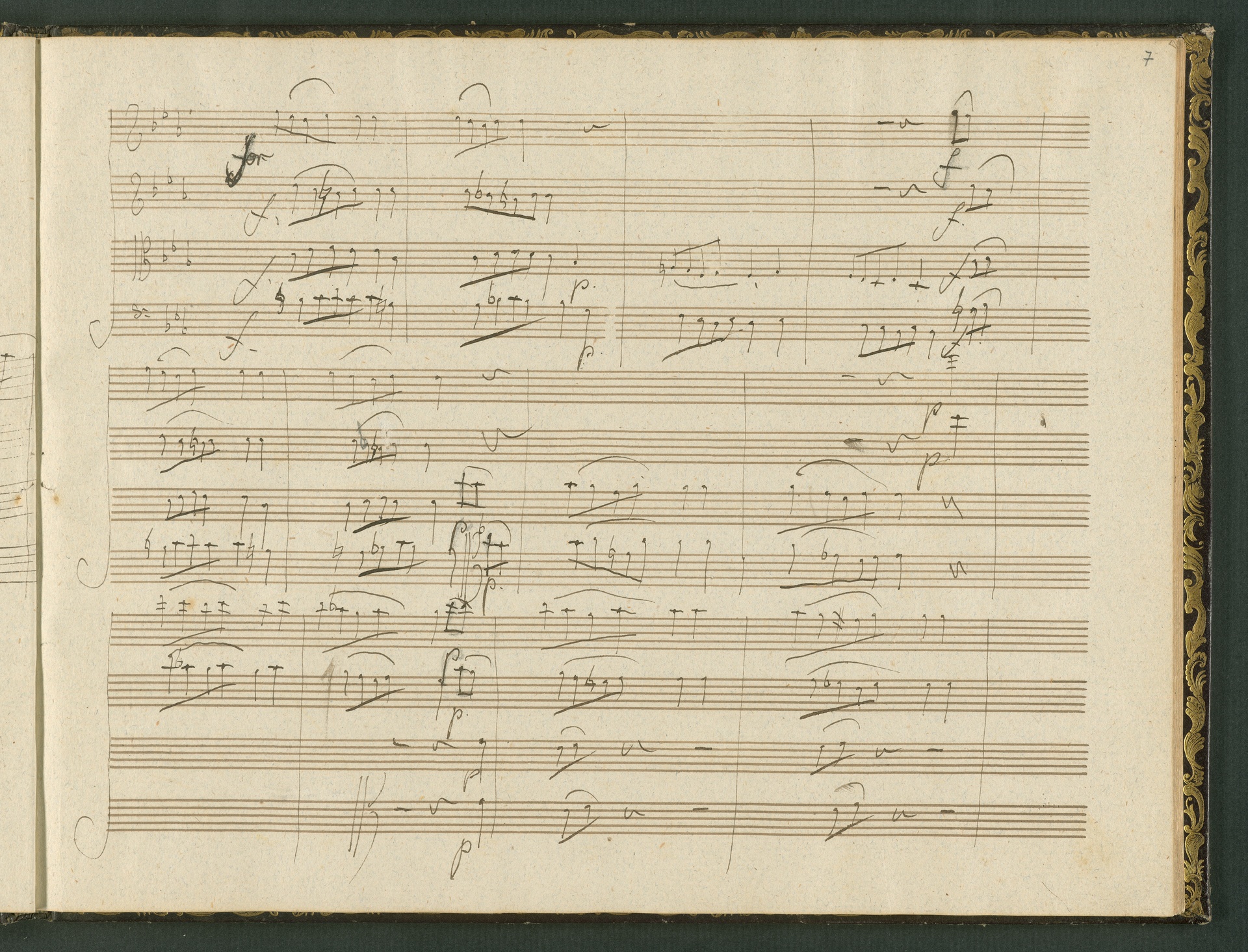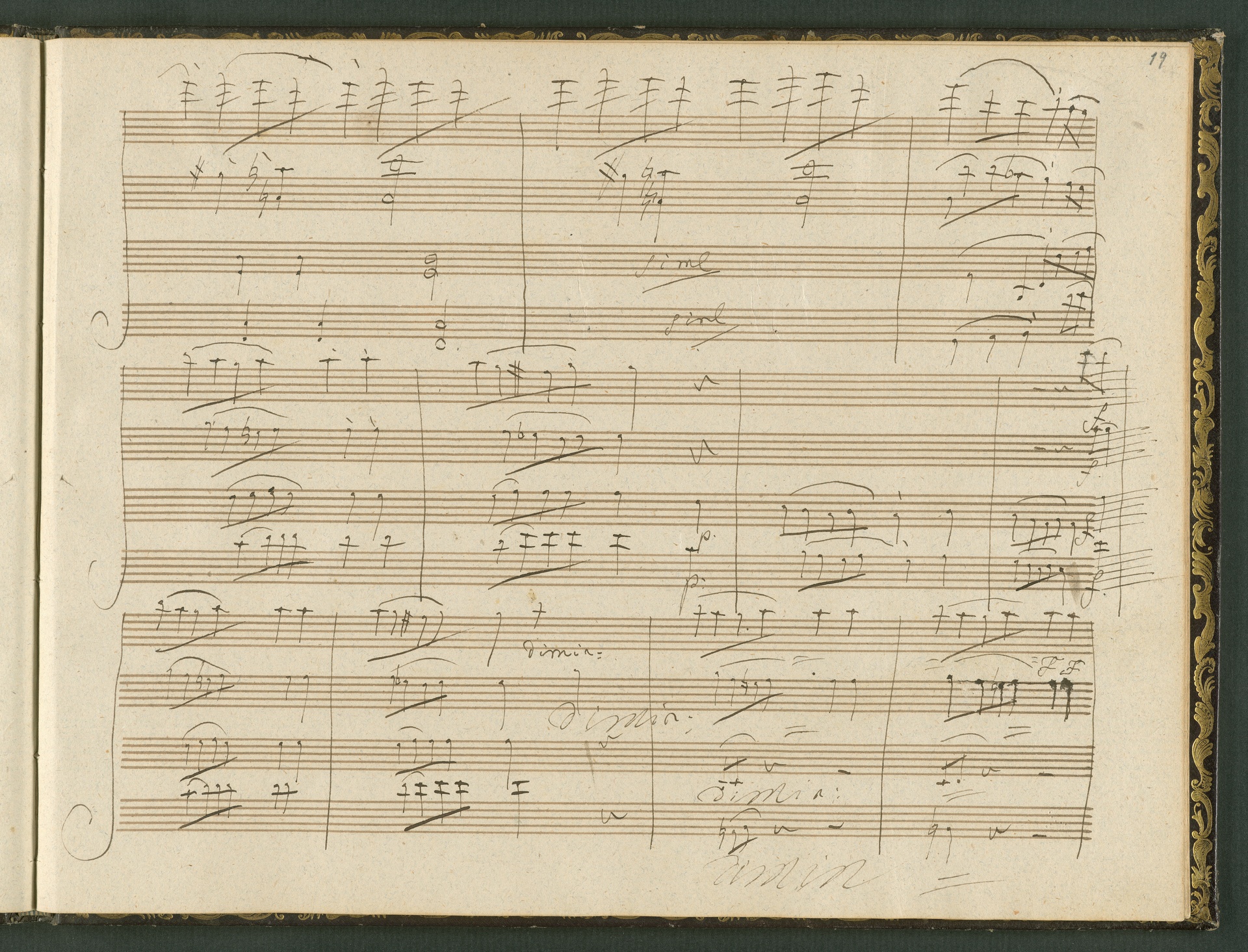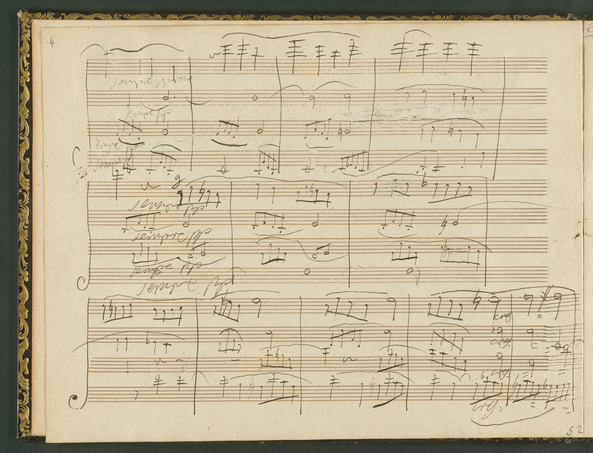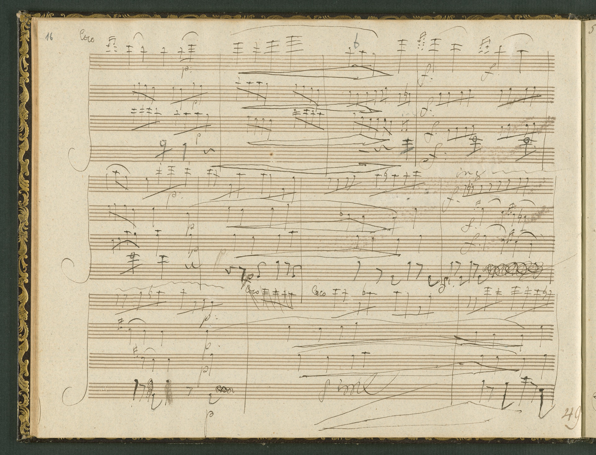 The autograph score of the String Quartet op. 127 (the last movement of which can be seen here) was probably acquired by Domenico Artaria, a Viennese publisher and music dealer, at the auction of Beethoven's estate following the composer's death. At this time the manuscript was still complete. Artaria, who bought a great deal of music at the auction, probably hoped to make some money by printing unknown works by the composer. The autograph scores could also be sold to collectors, which is what happened to the String Quartet op. 127. In the years that followed he sold it piece by piece to different interested parties. This is why the individual movements are now preserved in collections held at different libraries. The manuscript is a clean copy: it is very clear, contains almost no corrections, is legible and relatively consistent. (J.R.)
