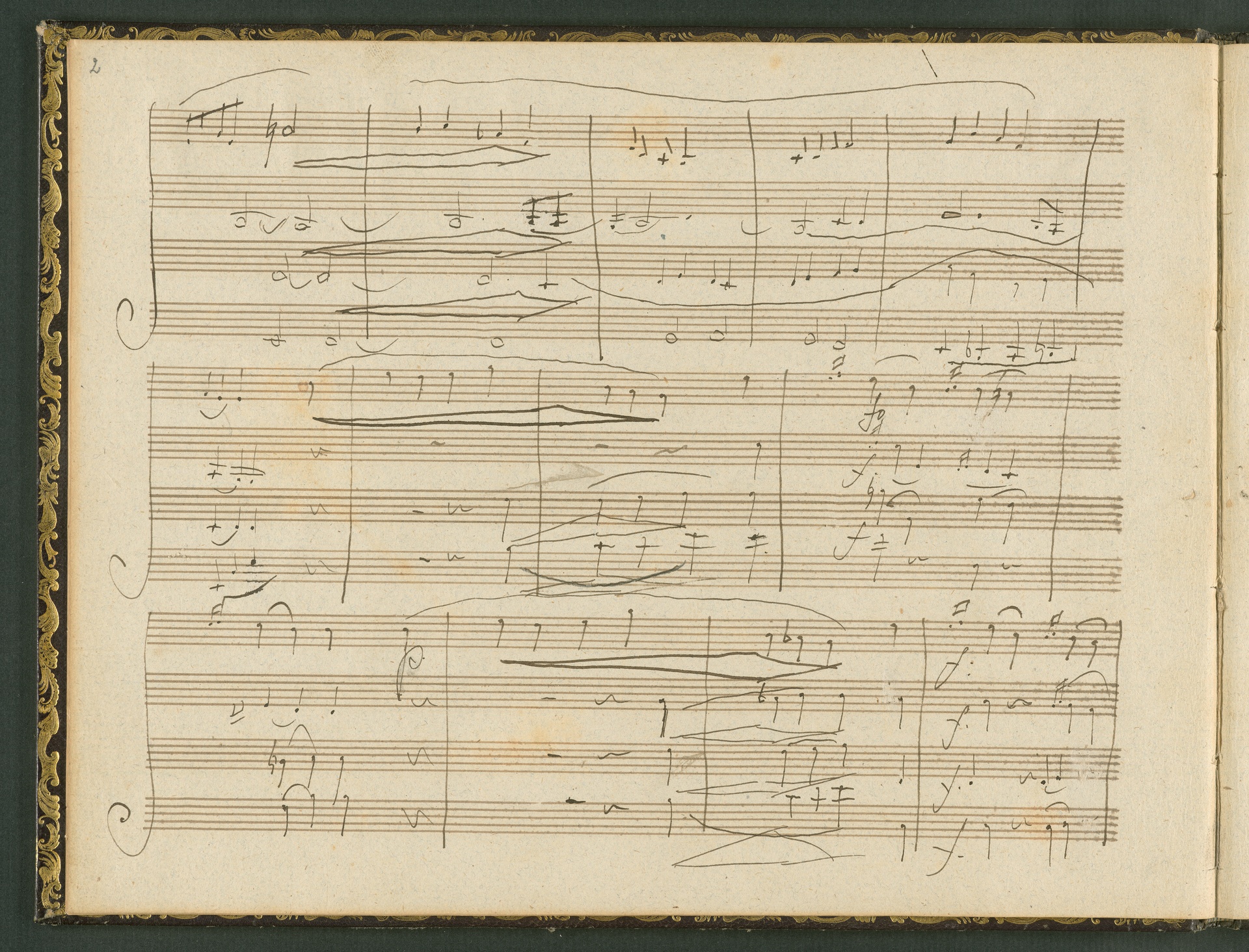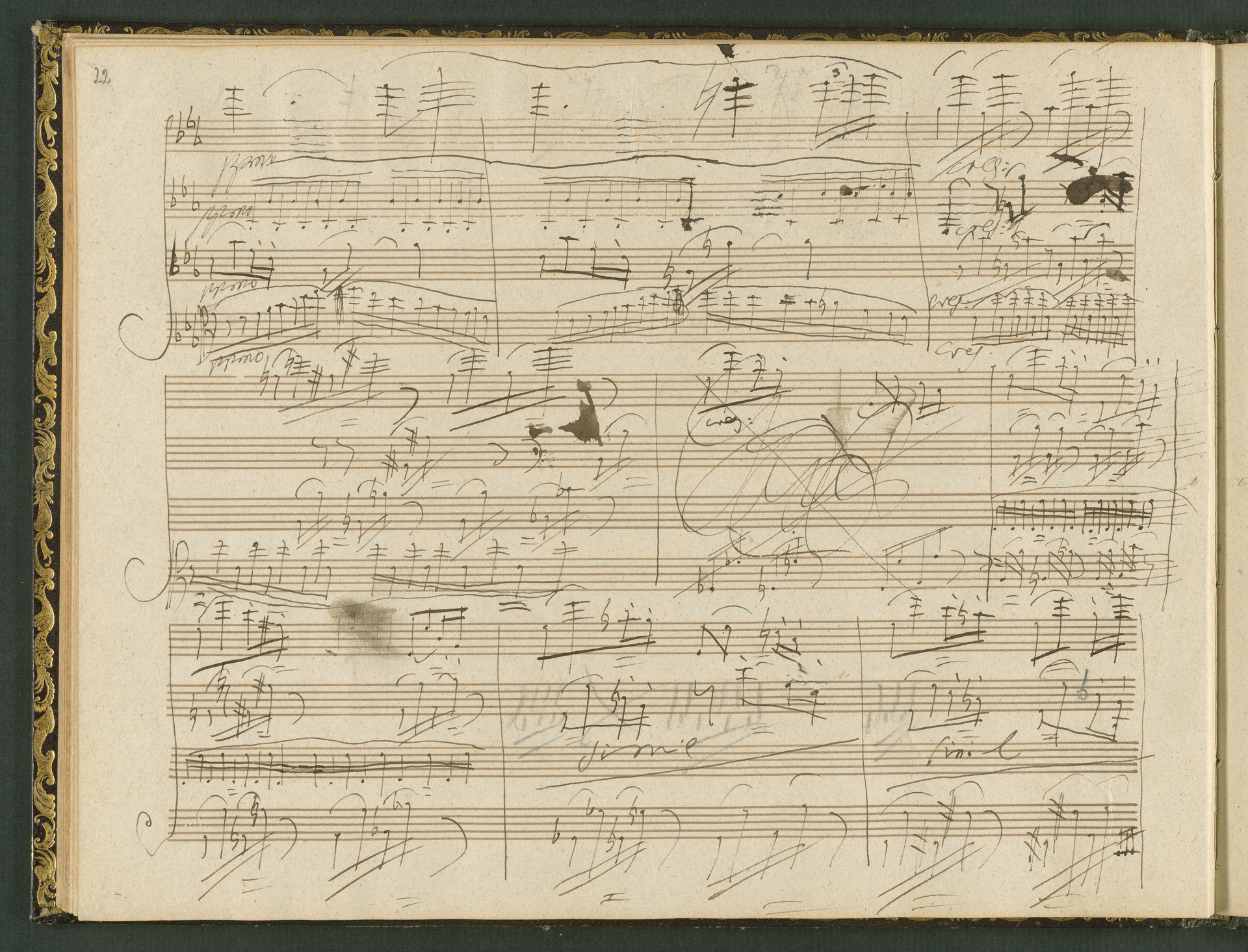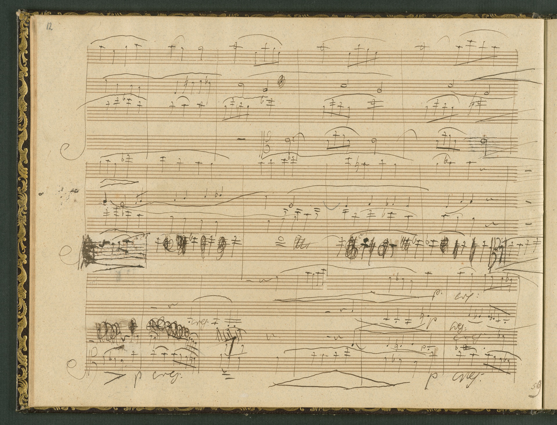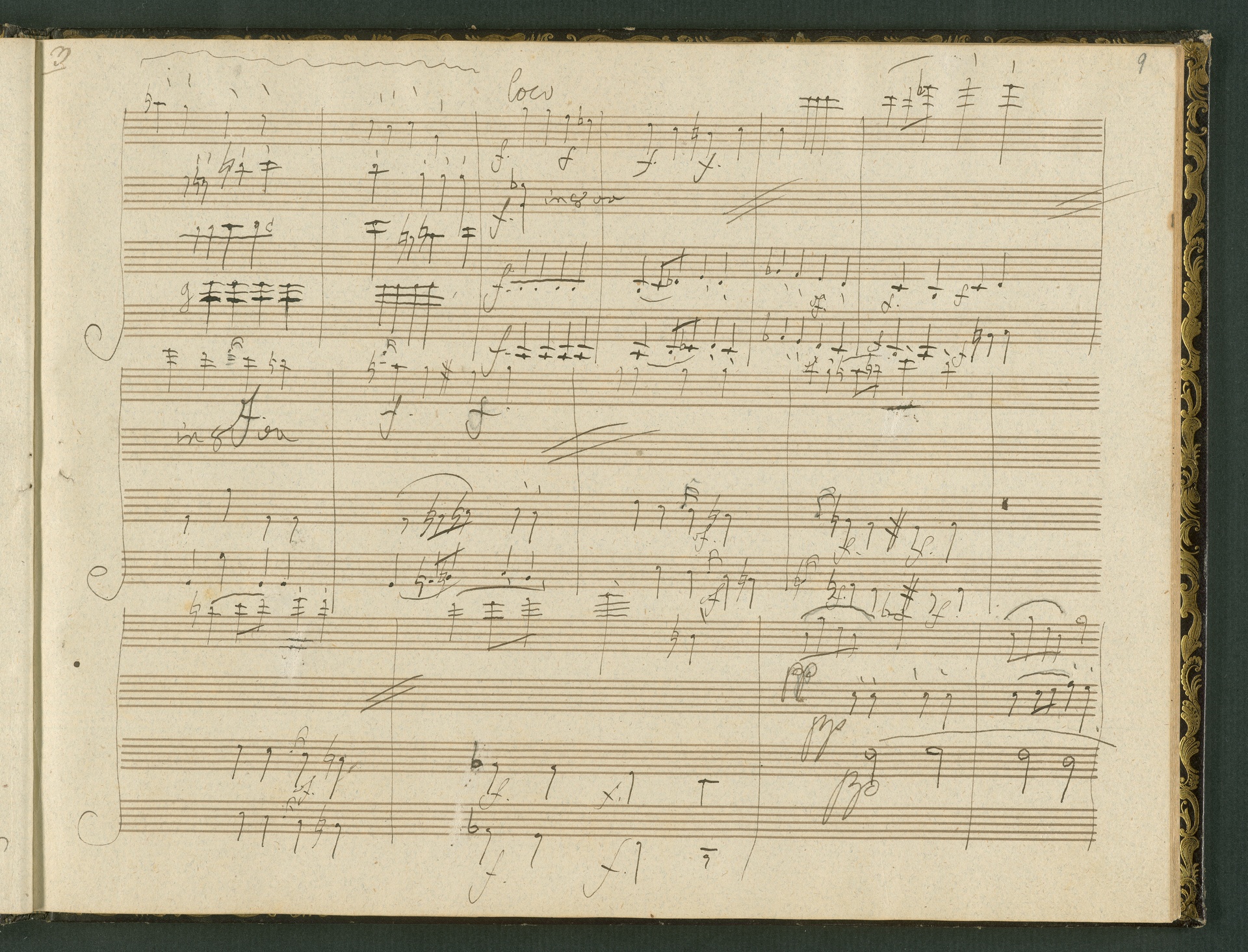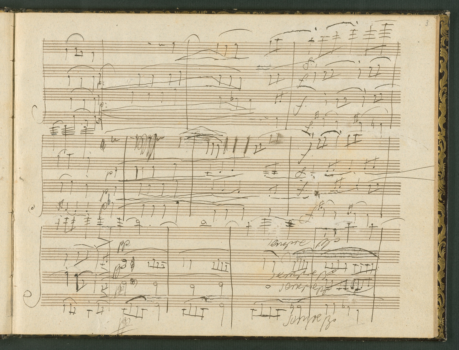 The autograph score of the String Quartet op. 127 (the last movement of which can be seen here) was probably acquired by Domenico Artaria, a Viennese publisher and music dealer, at the auction of Beethoven's estate following the composer's death. At this time the manuscript was still complete. Artaria, who bought a great deal of music at the auction, probably hoped to make some money by printing unknown works by the composer. The autograph scores could also be sold to collectors, which is what happened to the String Quartet op. 127. In the years that followed he sold it piece by piece to different interested parties. This is why the individual movements are now preserved in collections held at different libraries. The manuscript is a clean copy: it is very clear, contains almost no corrections, is legible and relatively consistent. (J.R.)