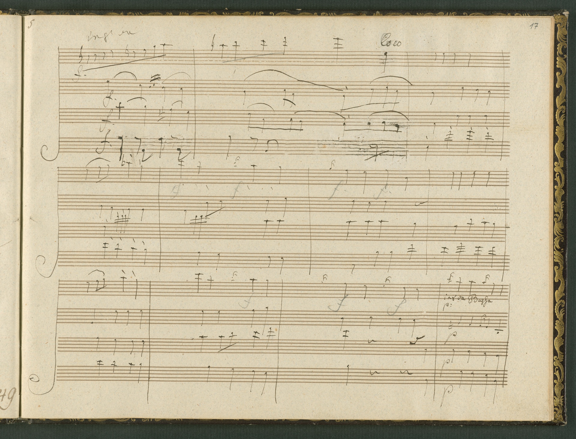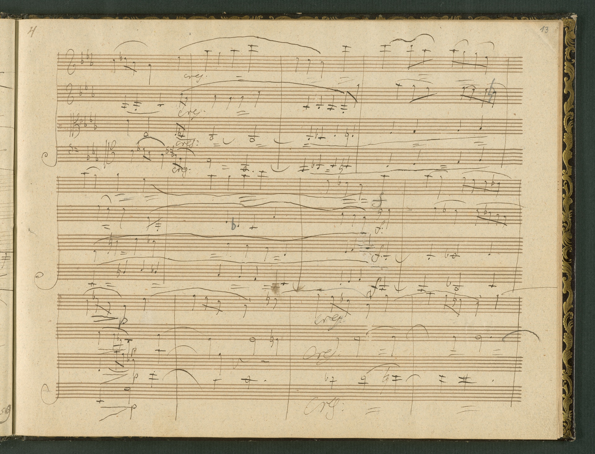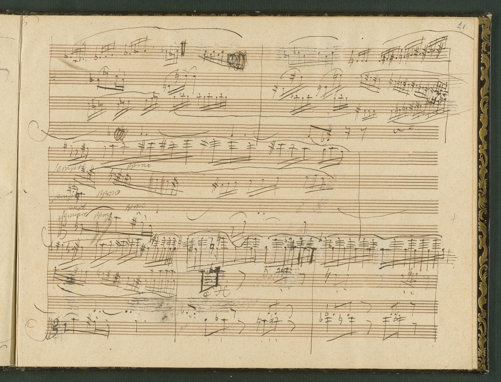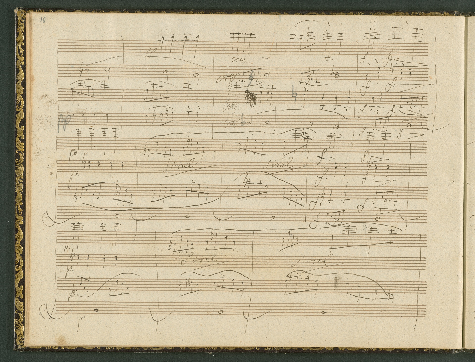 The autograph score of the String Quartet op. 127 (the last movement of which can be seen here) was probably acquired by Domenico Artaria, a Viennese publisher and music dealer, at the auction of Beethoven's estate following the composer's death. At this time the manuscript was still complete. Artaria, who bought a great deal of music at the auction, probably hoped to make some money by printing unknown works by the composer. The autograph scores could also be sold to collectors, which is what happened to the String Quartet op. 127. In the years that followed he sold it piece by piece to different interested parties. This is why the individual movements are now preserved in collections held at different libraries. The manuscript is a clean copy: it is very clear, contains almost no corrections, is legible and relatively consistent. (J.R.)