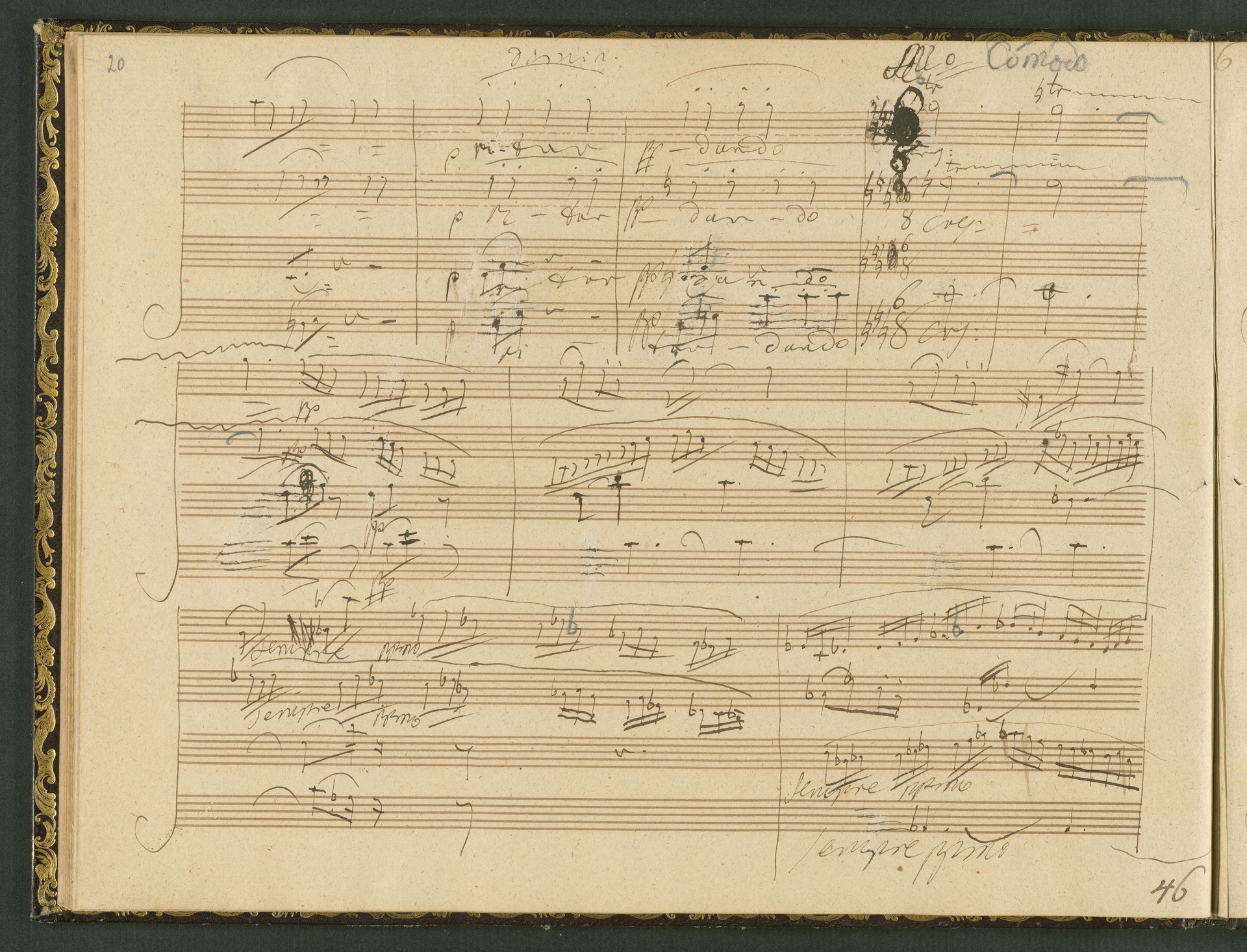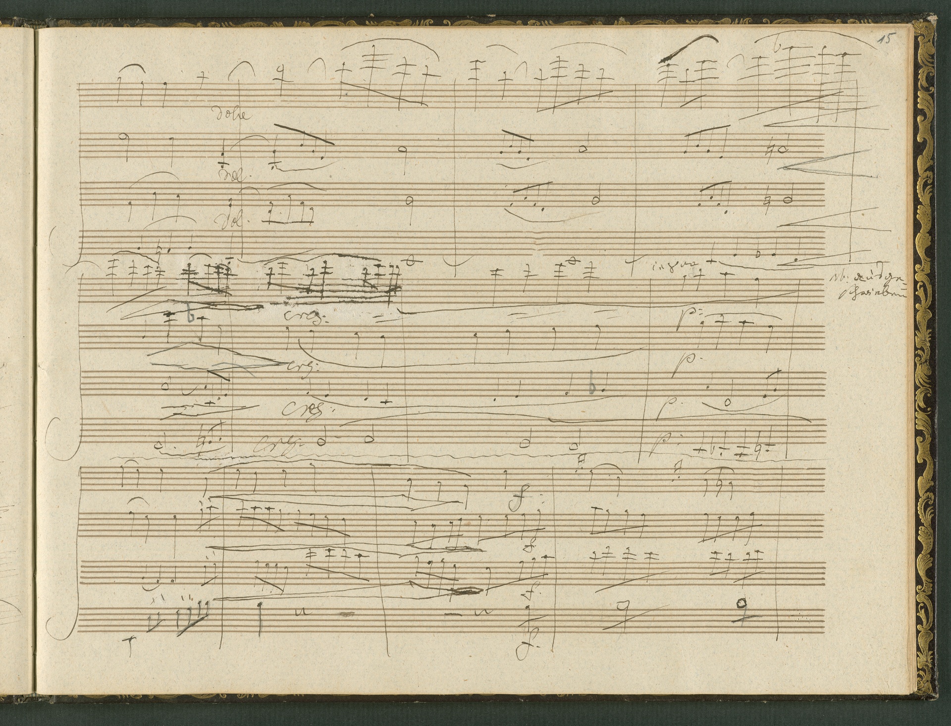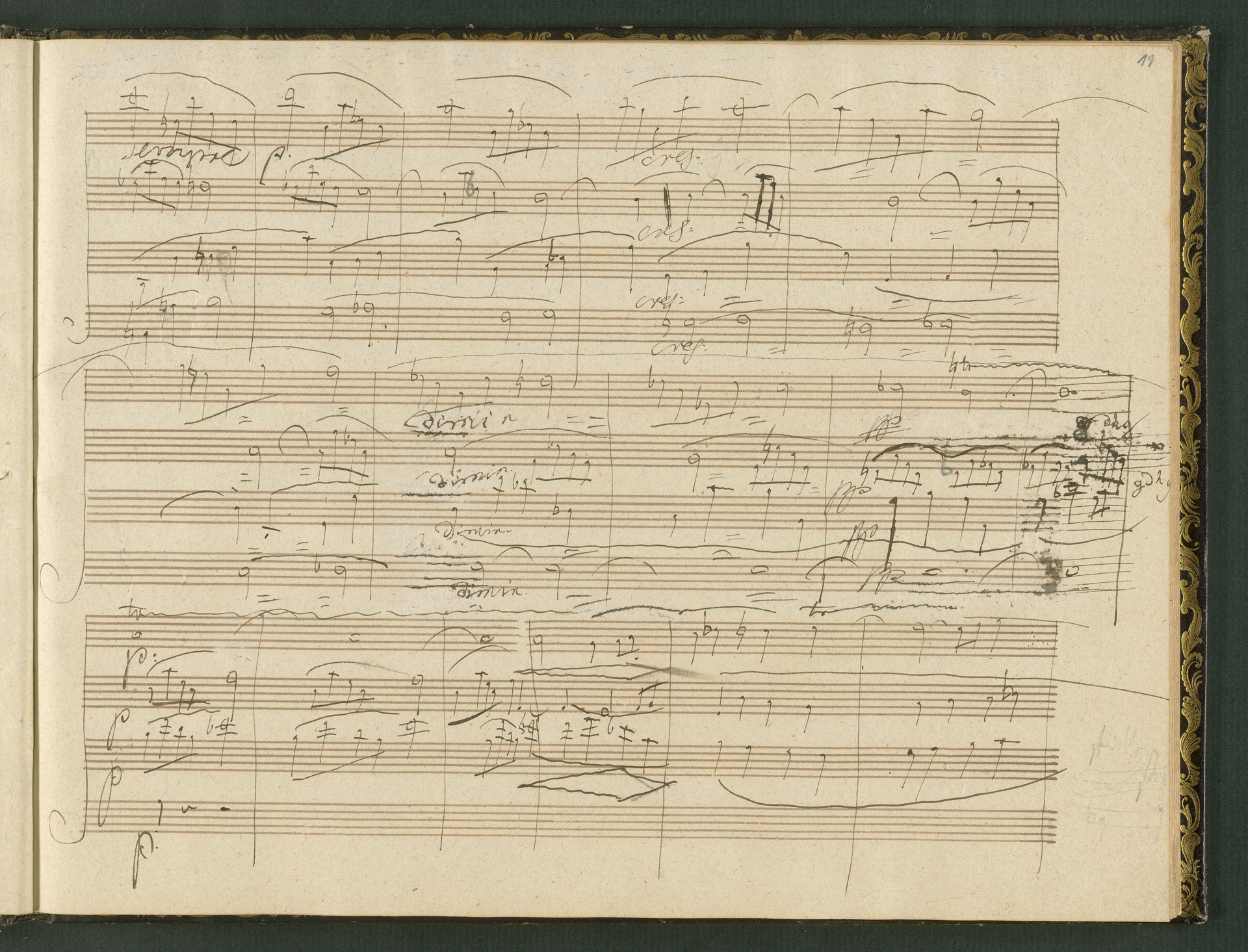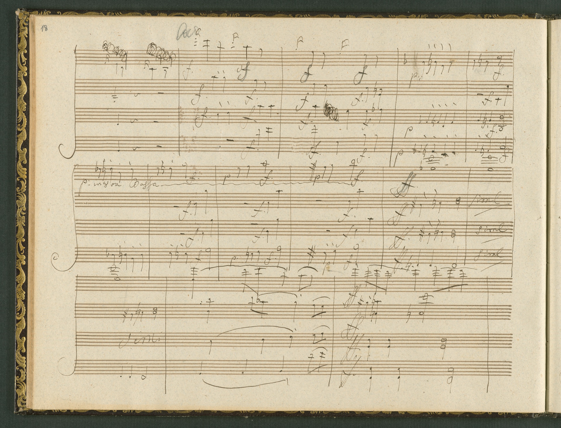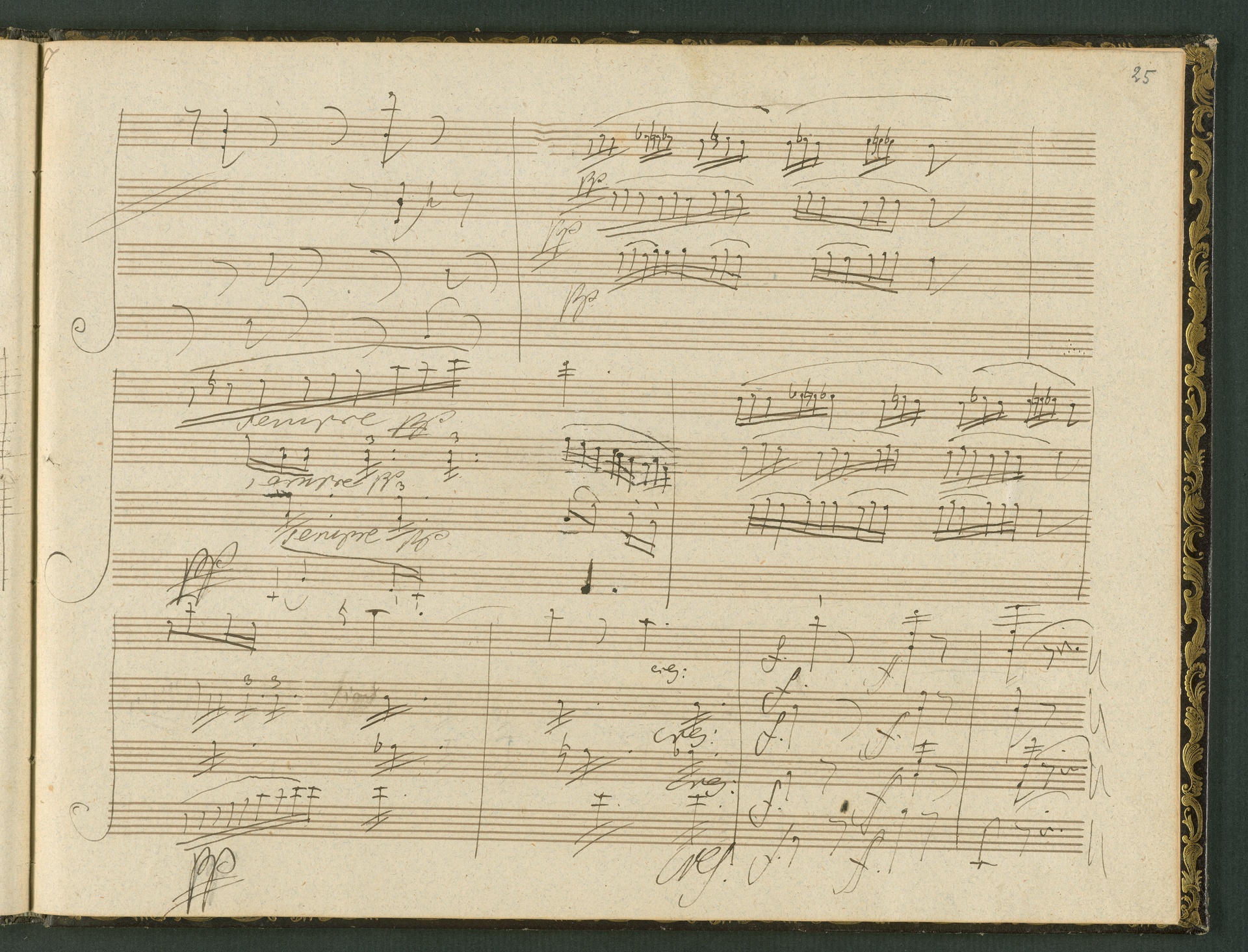The autograph score of the String Quartet op. 127 (the last movement of which can be seen here) was probably acquired by Domenico Artaria, a Viennese publisher and music dealer, at the auction of Beethoven's estate following the composer's death. At this time the manuscript was still complete. Artaria, who bought a great deal of music at the auction, probably hoped to make some money by printing unknown works by the composer. The autograph scores could also be sold to collectors, which is what happened to the String Quartet op. 127. In the years that followed he sold it piece by piece to different interested parties. This is why the individual movements are now preserved in collections held at different libraries. The manuscript is a clean copy: it is very clear, contains almost no corrections, is legible and relatively consistent. (J.R.)