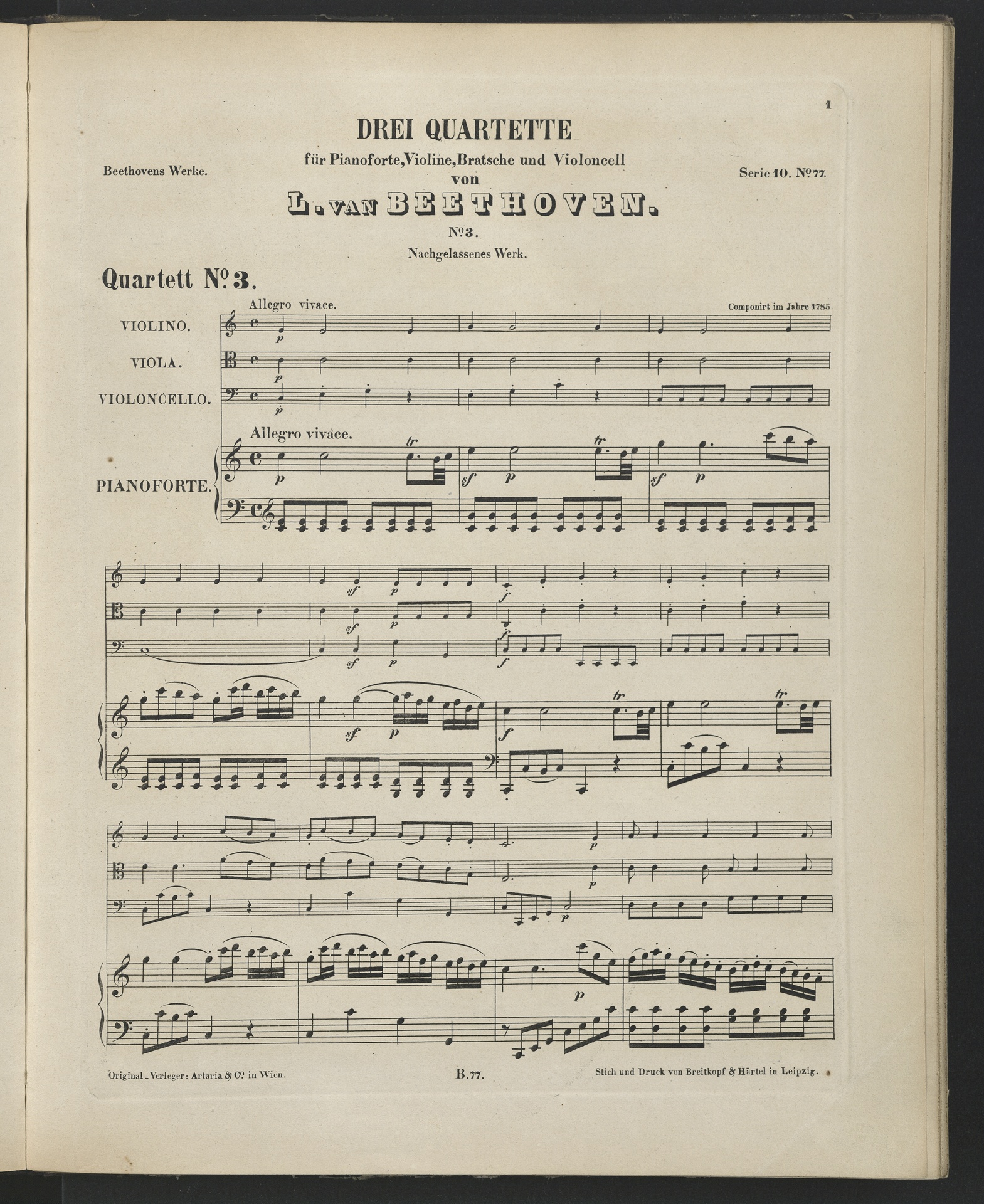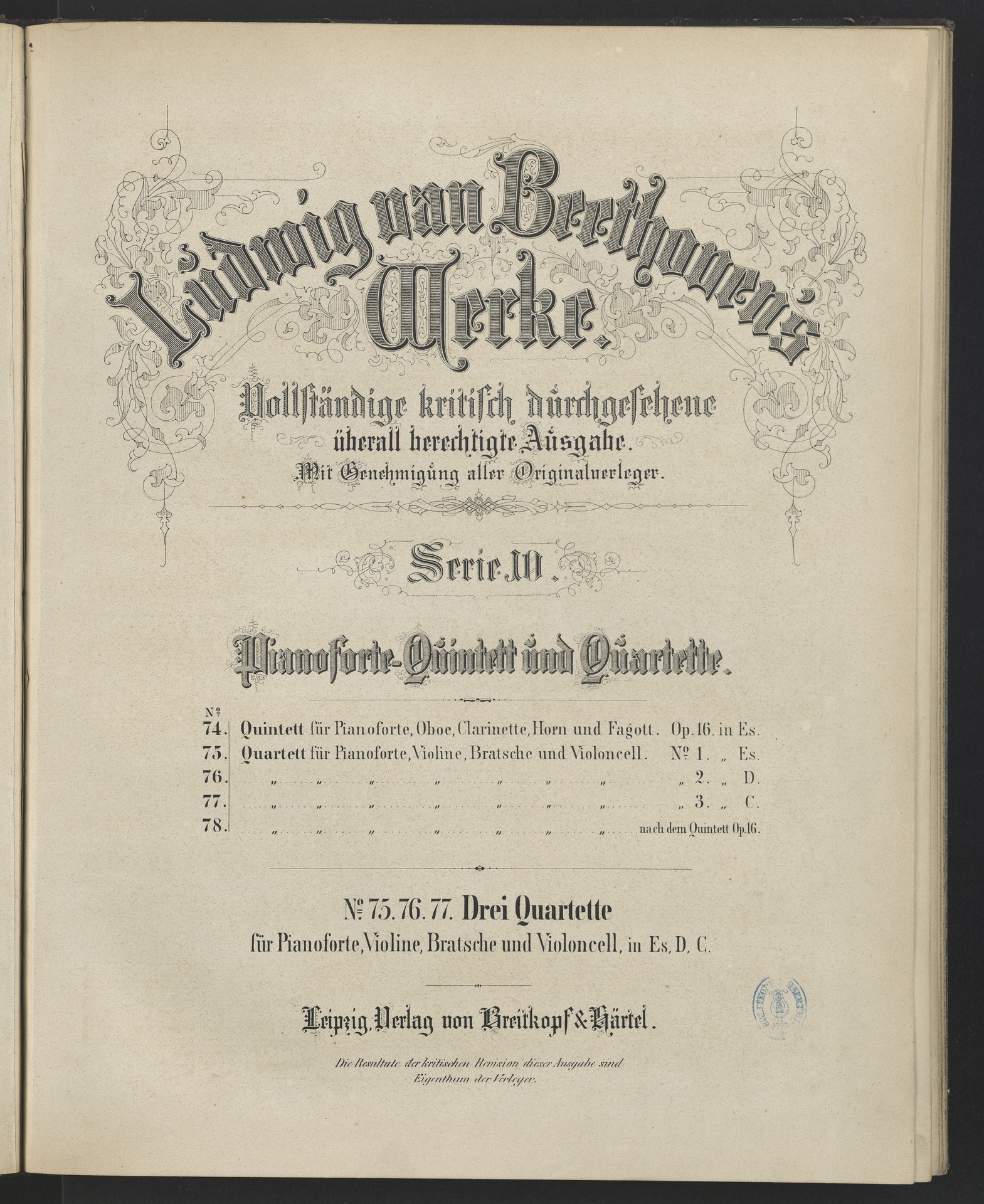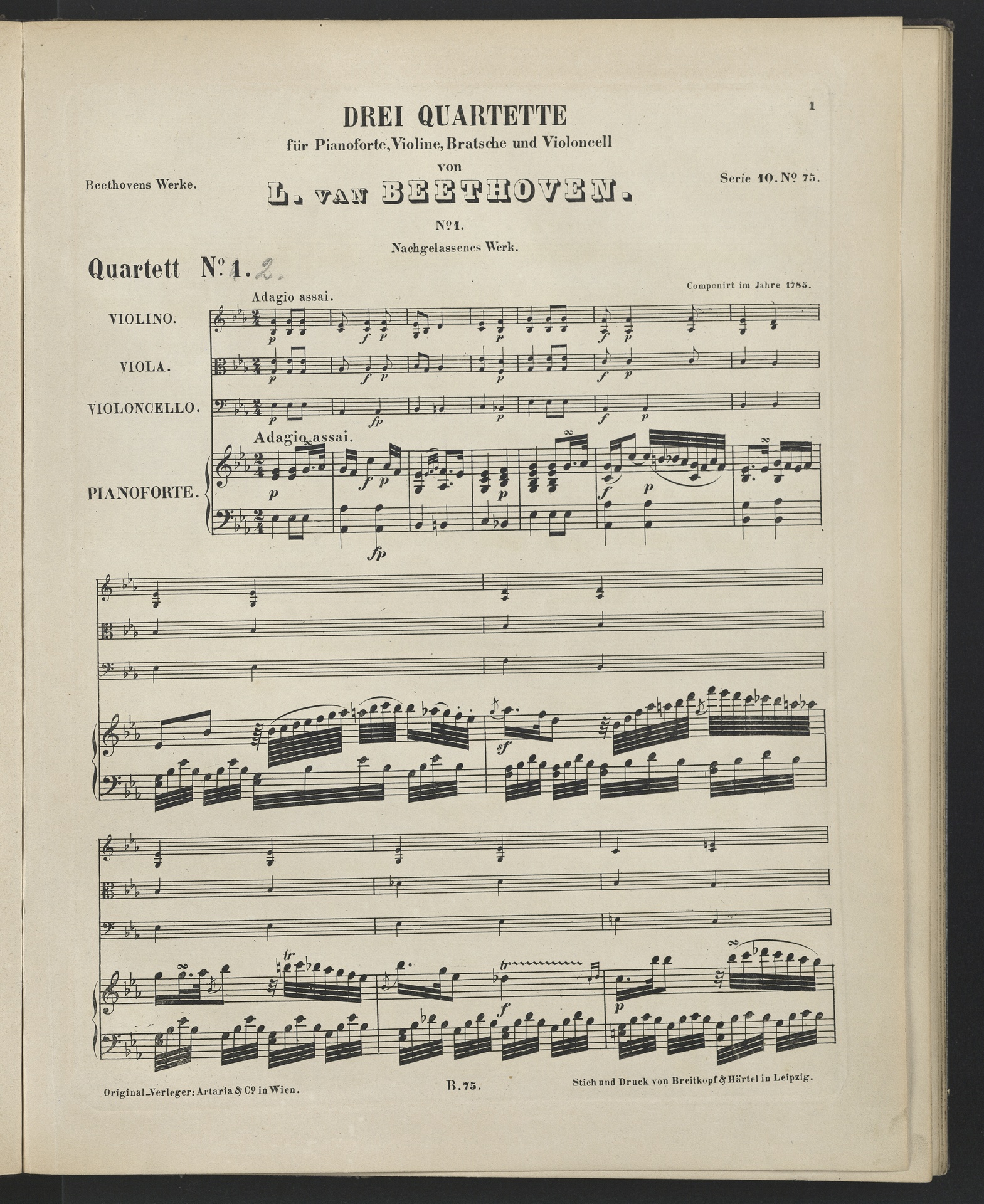 Ludwig van Beethoven, Quartette für Klavier, Violine, Viola, Violoncello (Es-Dur, D-Dur, C-Dur) WoO 36, 1-3, Partitur, Breitkopf und Härtel, 75-77