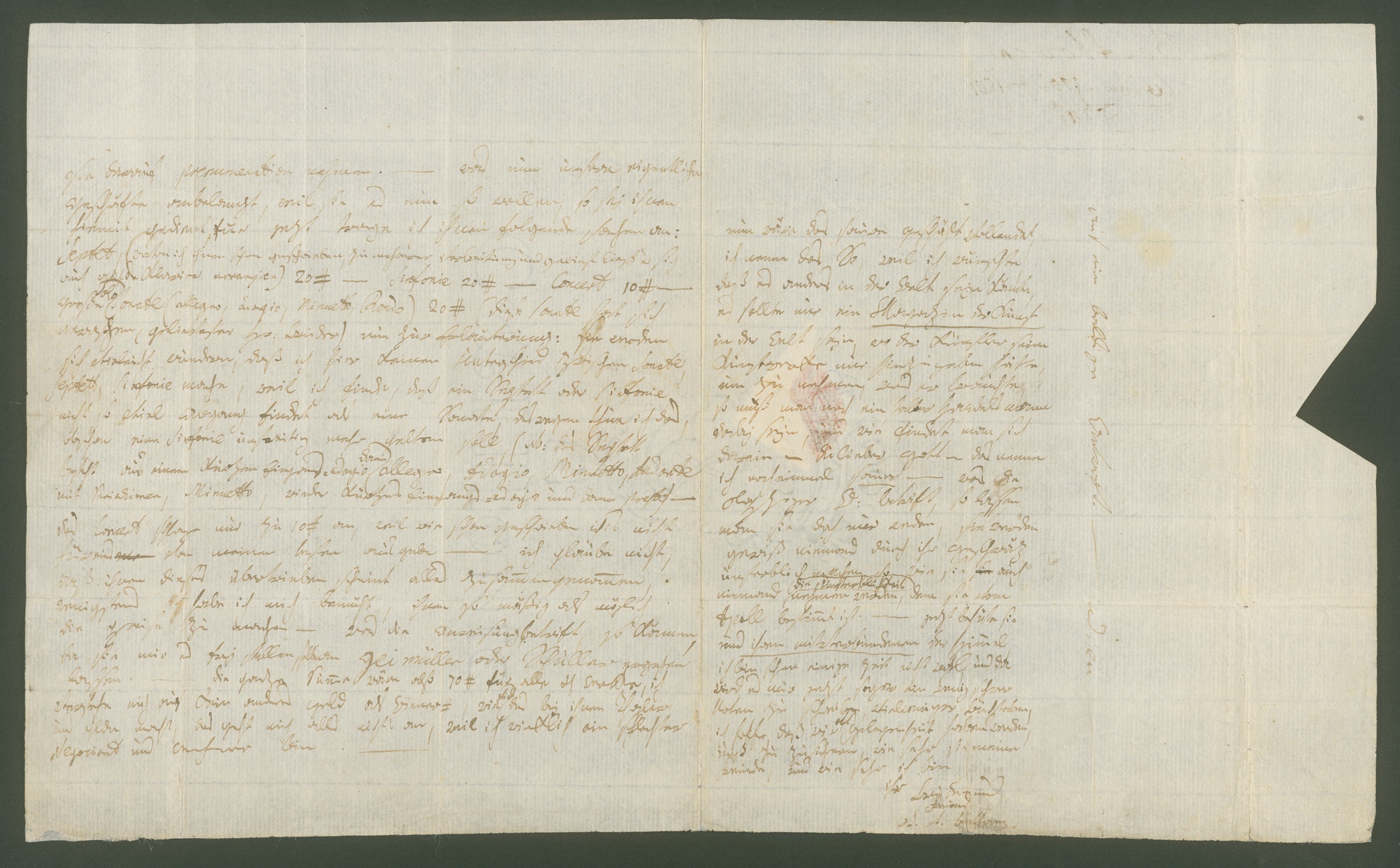 Beethoven offers Hoffmeister four of his compositions: the Piano Concerto op. 19, the Septet op. 20, the Symphony op. 21 and the Piano Sonata op. 22. He asks for a total of 70 ducats Viennese currency. Beethoven names two firms via which delivery can be made. Beethoven adds "now the sour business has been completed" and explains that he finds these business dealings very unpleasant. He wishes that he could just deliver his works to a central "Art archive" and in return he would be able to cover his financial need without having to negotiate.