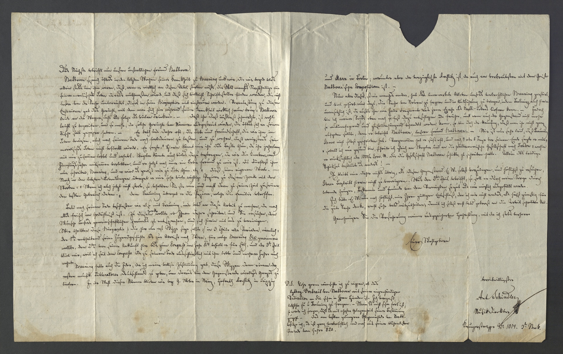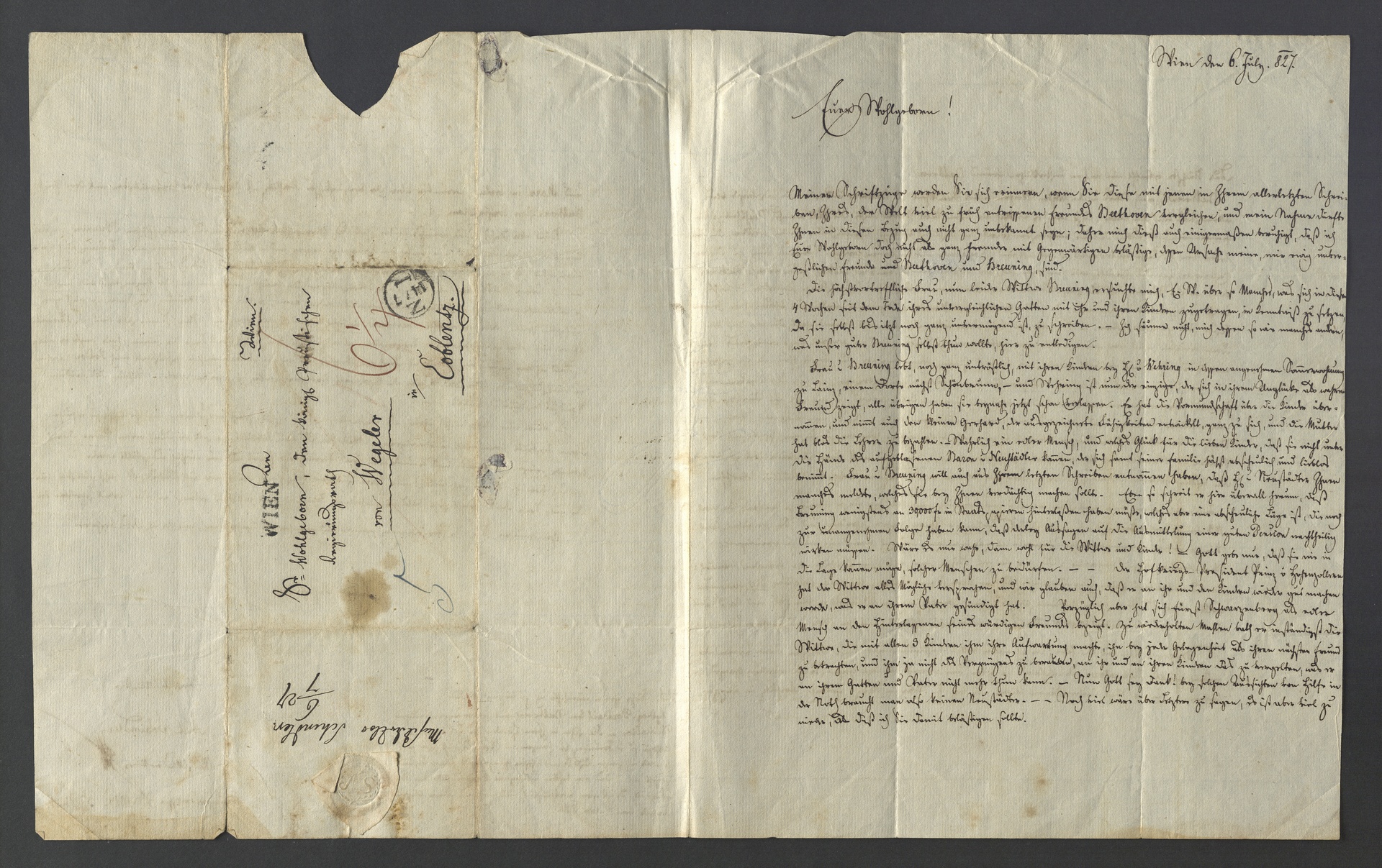 Schindler introduces himself as a friend of Beethoven and Stephan von Breuning. On behalf of Stephan von Breuning's widow he informs Wegeler of the sad circumstances the family has been living in since von Breuning died. Money is short and many friends have turned away. Schindler explains the project of a Beethoven biography that the composer himself initiated. For this purpose Beethoven had given Breuning and Schindler a number of documents before his death. Breuning intended to contact Wegeler concerning the report on Beethoven's adolescence, write the part until 1814 himself and have Schindler take care of Beethoven's last years. An expert in music literature (preferably Rochlitz from Leipzig) should then compile a complete biography based on the individual reports. After Breuning's unexpected death in early June, Schindler still wants to proceed with the project and asks Wegeler to write about Beethoven's adolescence. Instead of the middle part to be written by Breuning, he plans to summarise the memories of other Beethoven contemporaries. (After the publication of Aloys Schlosser's biography and the call from Jakob Hotschevars Schindler changes his opinion, see W 40 and W 168.) In the postscript he wonders if Wegeler has already received Beethoven's portrait with the hand-written dedication (see W 25). He believes that Ferdinand Schimon's oil painting, that he himself owns, is the best portrait of Beethoven. (FG)