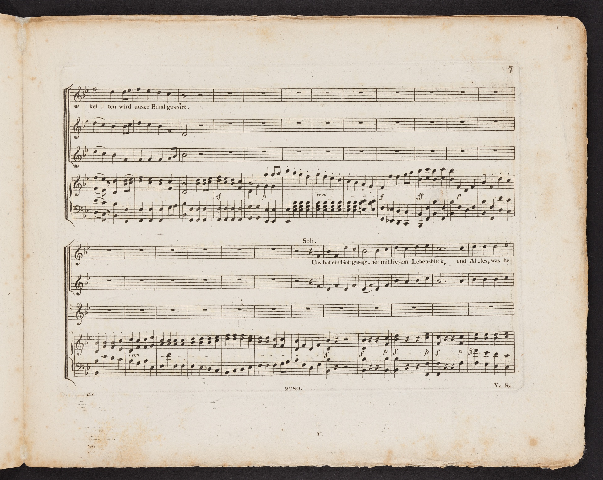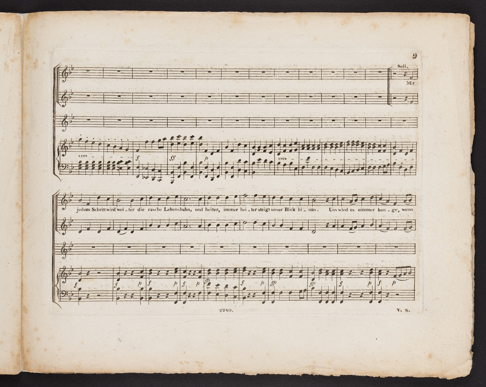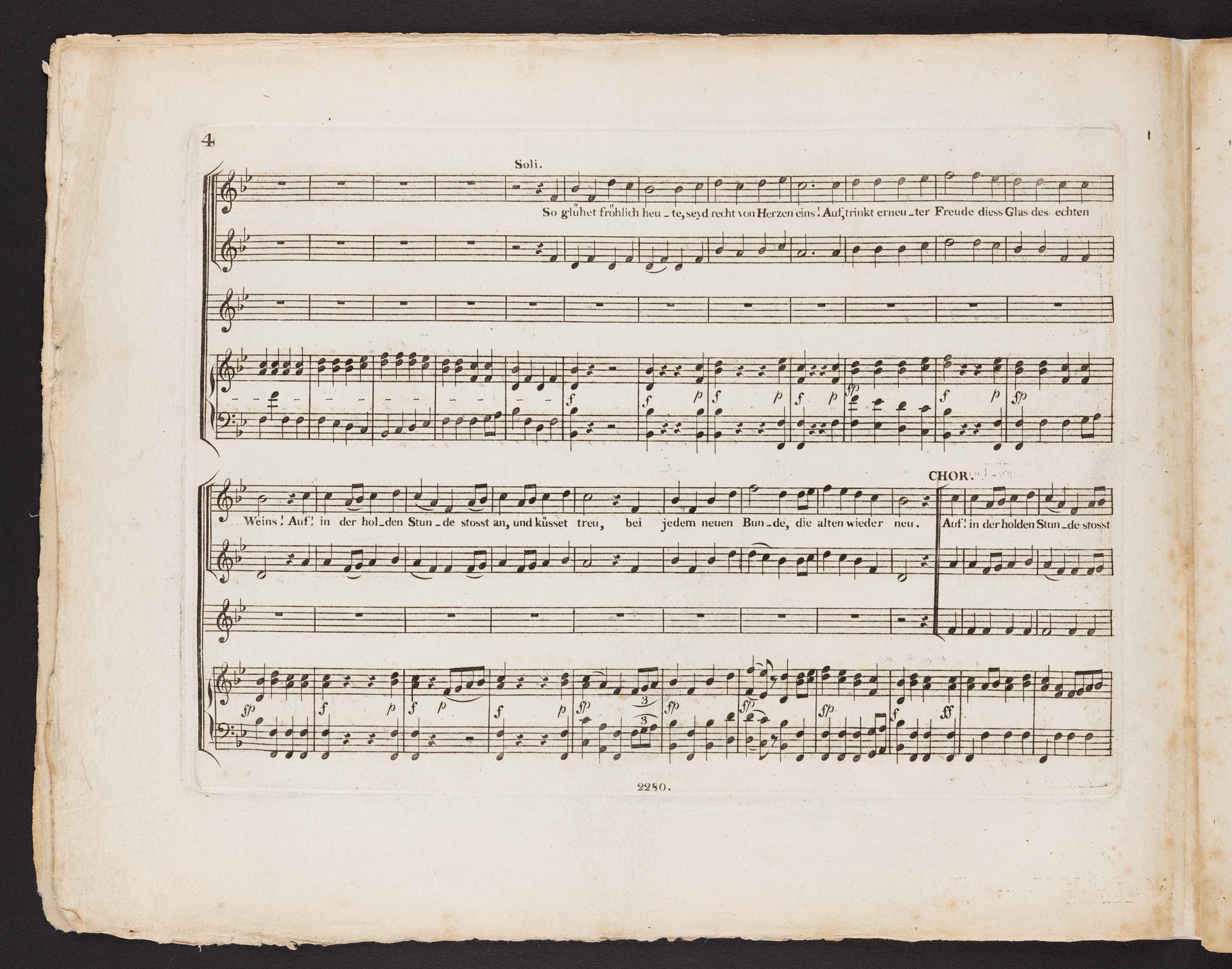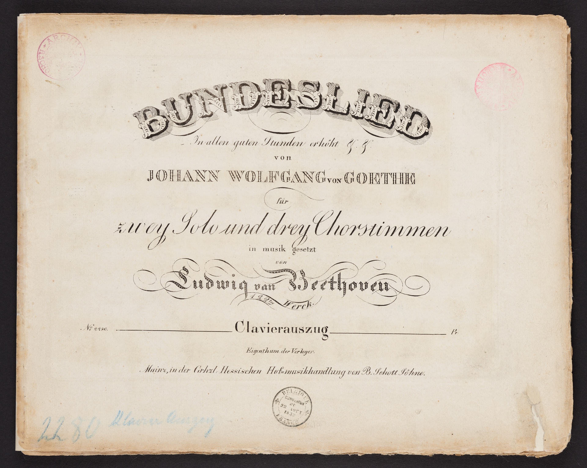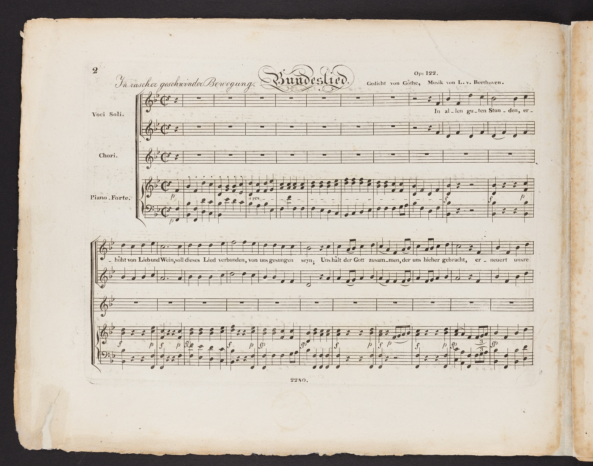 Ludwig van Beethoven, "Bundeslied", Lied für zwei Solostimmen, Chor, zwei Klarinetten, zwei Fagotte und zwei Hörner op. 122, Klavierauszug, Schott, 2280