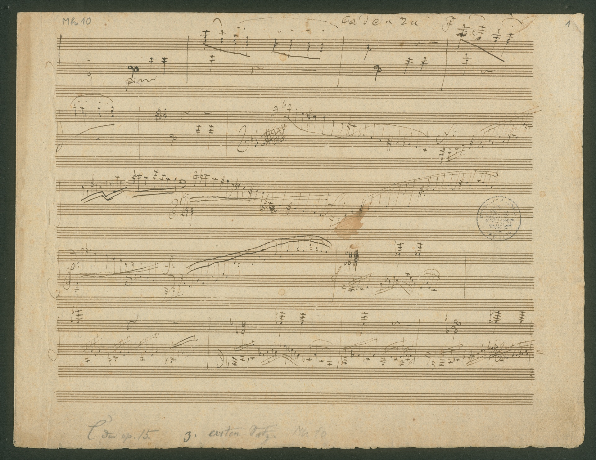 Beethoven performed his First Piano Concerto in C major op. 15 for the first time in an academy of the Tonkünstler-Societät (Musician's Society) at the Hofburgtheater in Vienna on 29 March 1795. On this occasion he did not, however, play the cadenza for the first movement of the concerto in the autograph score shown here. He only wrote it after the concerto had been published. Beethoven may have mentioned it in a letter to Count Moriz von Dietrichstein in January 1808. He said that he had written the cadenza in connection with the "Liebhaber Concert", which took place on 31.1.1808. In the same letter the composer wrote that Johann Baptist Stainer (Steiner) von Felsburg (1756-1832), who was meant to play the solo part, was not very dexterous, adding " be advised, he [Felsburg] will fall, before he reaches the cadenza - (...) - I myself said to H. Felsenburg that I would advise him not to play tomorrow - he'll make a pig's ear of it. NB. As soon as he can play the concerto better, he may perform it."