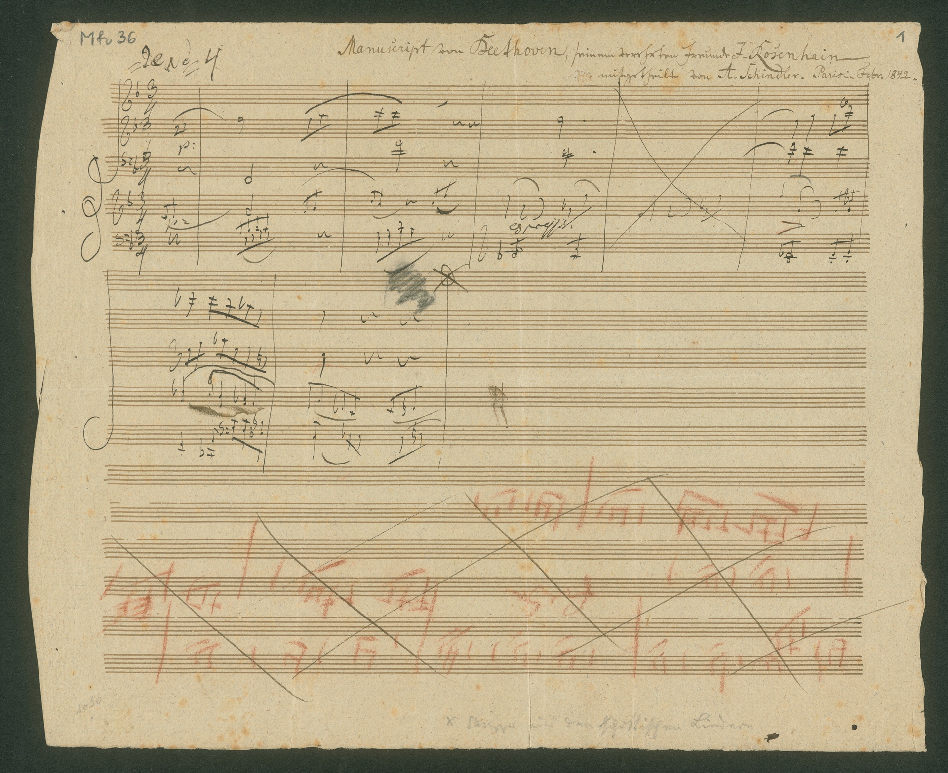 Beethoven only wrote down six complete bars on the leaf (next to the sketches in red pen in the lower staves), writing in the top left-hand corner "=de no 4". A very cryptic abbreviation! It is actually points to another spot. Beethoven wrote "Vi-de" to indicate parts in the music which were to be left out or replaced. The beginning of the part in question was marked "Vi-" and the end "de". The "=de no 4" on the autograph score shown here indicates that these six bars belonged to no. 4 in another work. The "Vi-" marking the beginning of the passage would be found there. It was actually possible to identify a manuscript which fitted the bill in a collection of several autograph books in the Staatsbibliothek zu Berlin Preußischer Kulturbesitz. In book 3 Mus. ms. autogr. Beethoven 29/2 on leaves 40r-41r there is a Scottish lied with the title no. 4 and which bears the missing "Vi-" on the left next to the number. The six bars on the autograph score shown here are the instrumental introduction to the lied, which begins with bar 7 in the autograph score in Berlin. (J.R.)