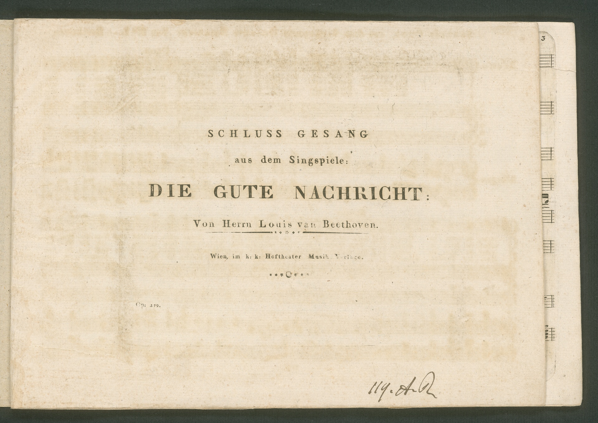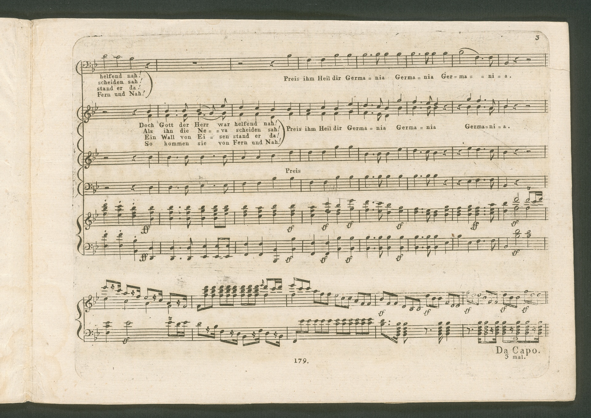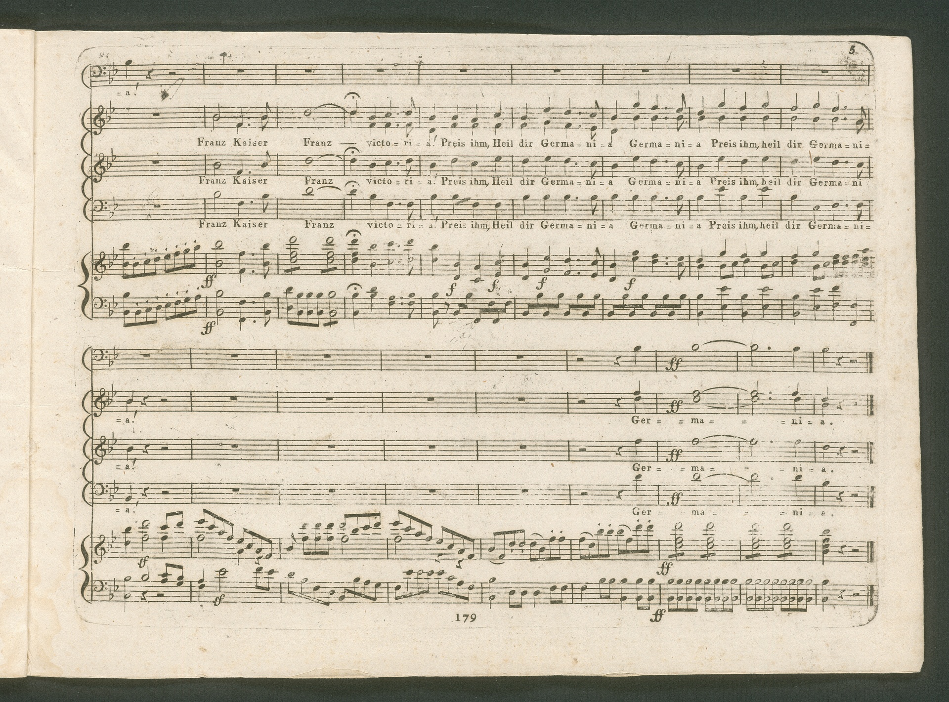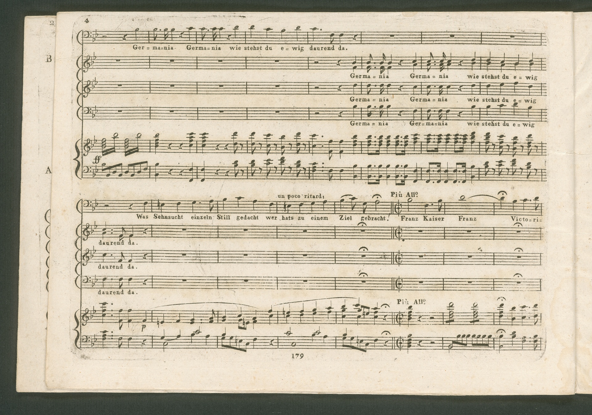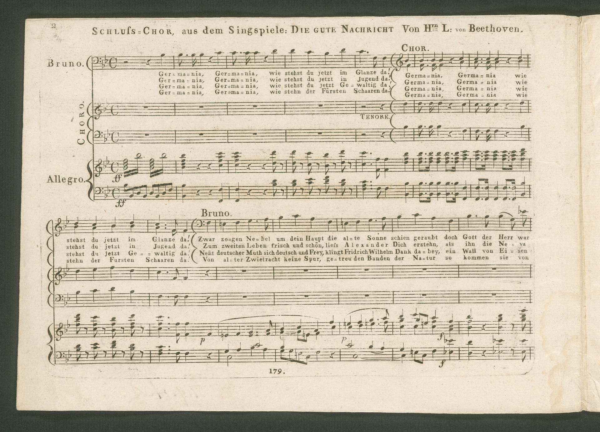 Ludwig van Beethoven, "Germania", Schlussgesang aus Friedrich Treitschkes Singspiel "Die gute Nachricht" für Bass, Chor und Orchester WoO 94, Klavierauszug, Hoftheater-Musikverlag, 179