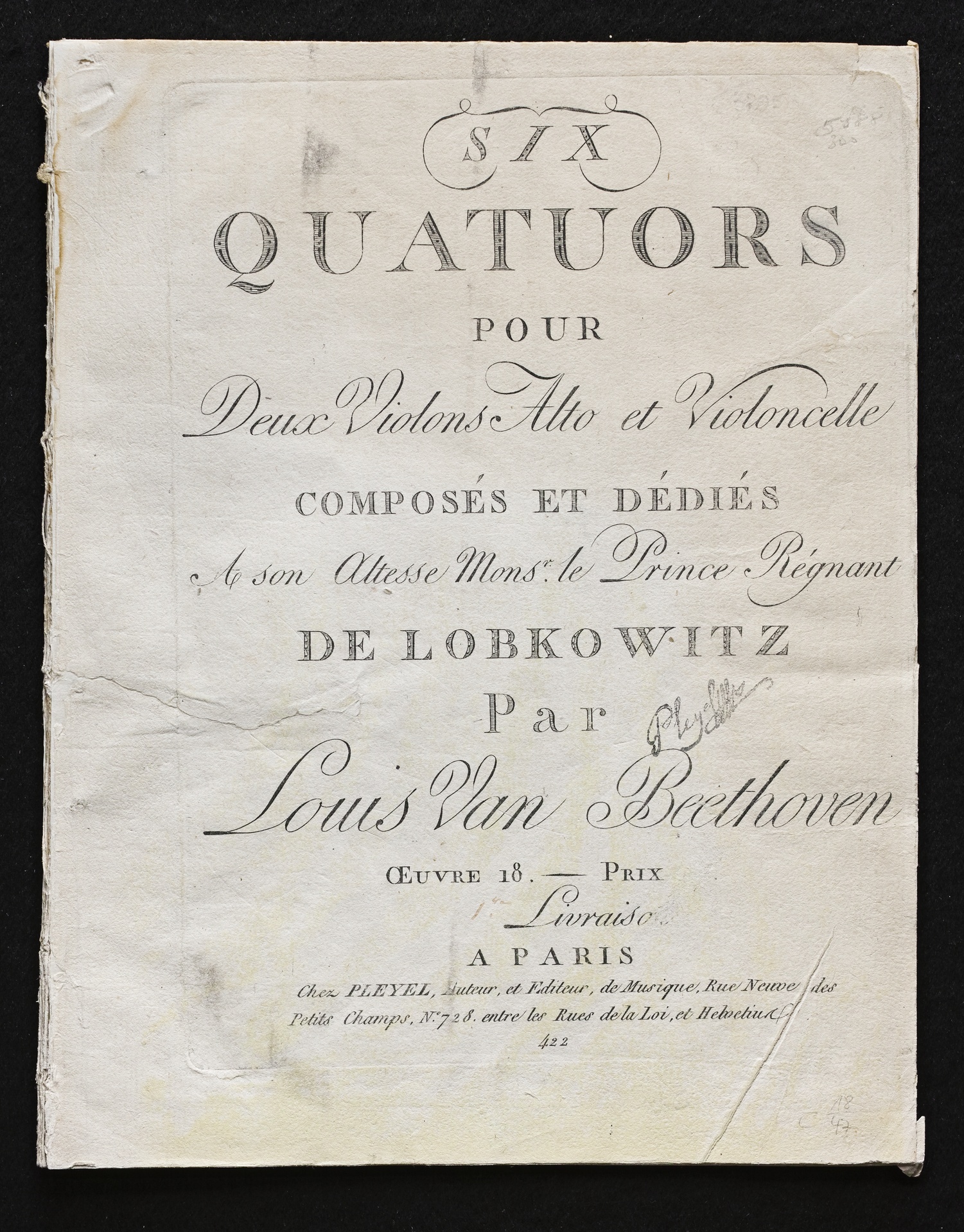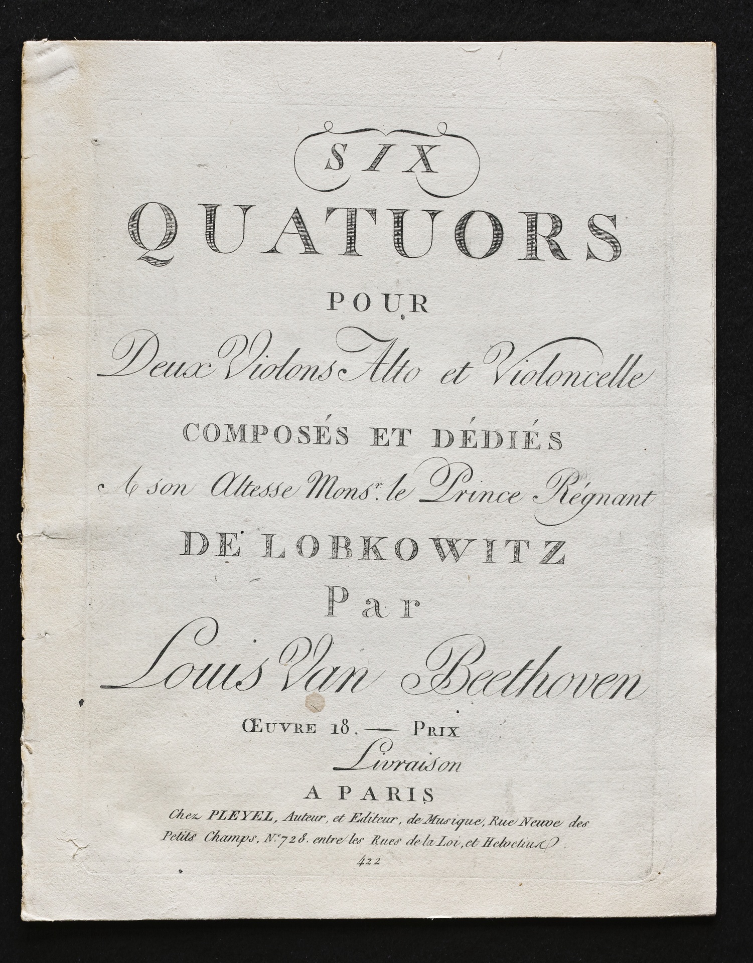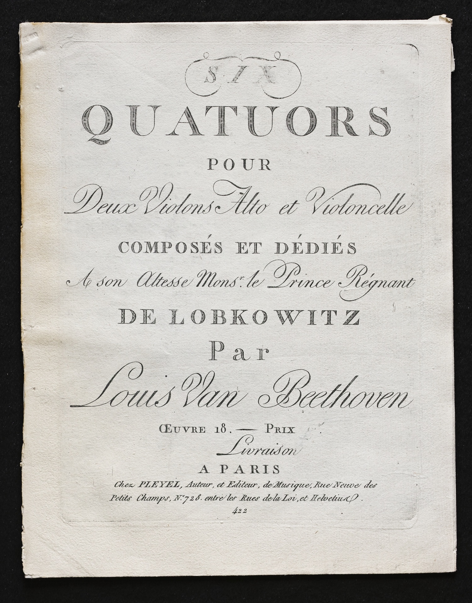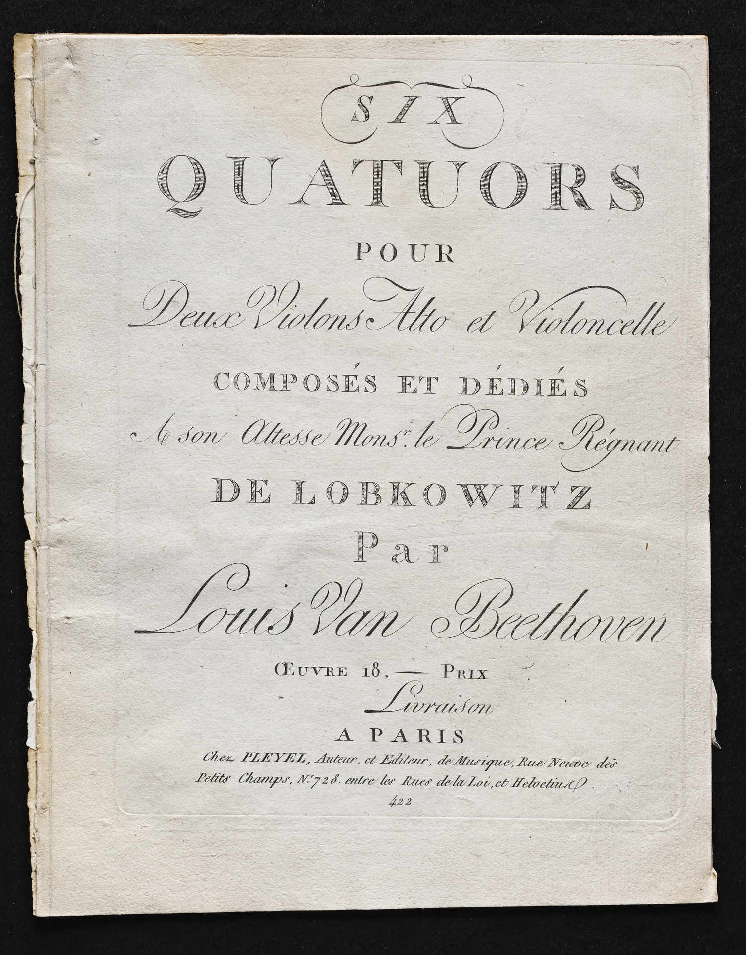 Ludwig van Beethoven, Quartette für 2 Violinen, Viola, Violoncello (F-Dur, G-Dur, D-Dur, c-Moll, A-Dur, B-Dur) op. 18, 1-6, Stimmen, Pleyel, 422, 472