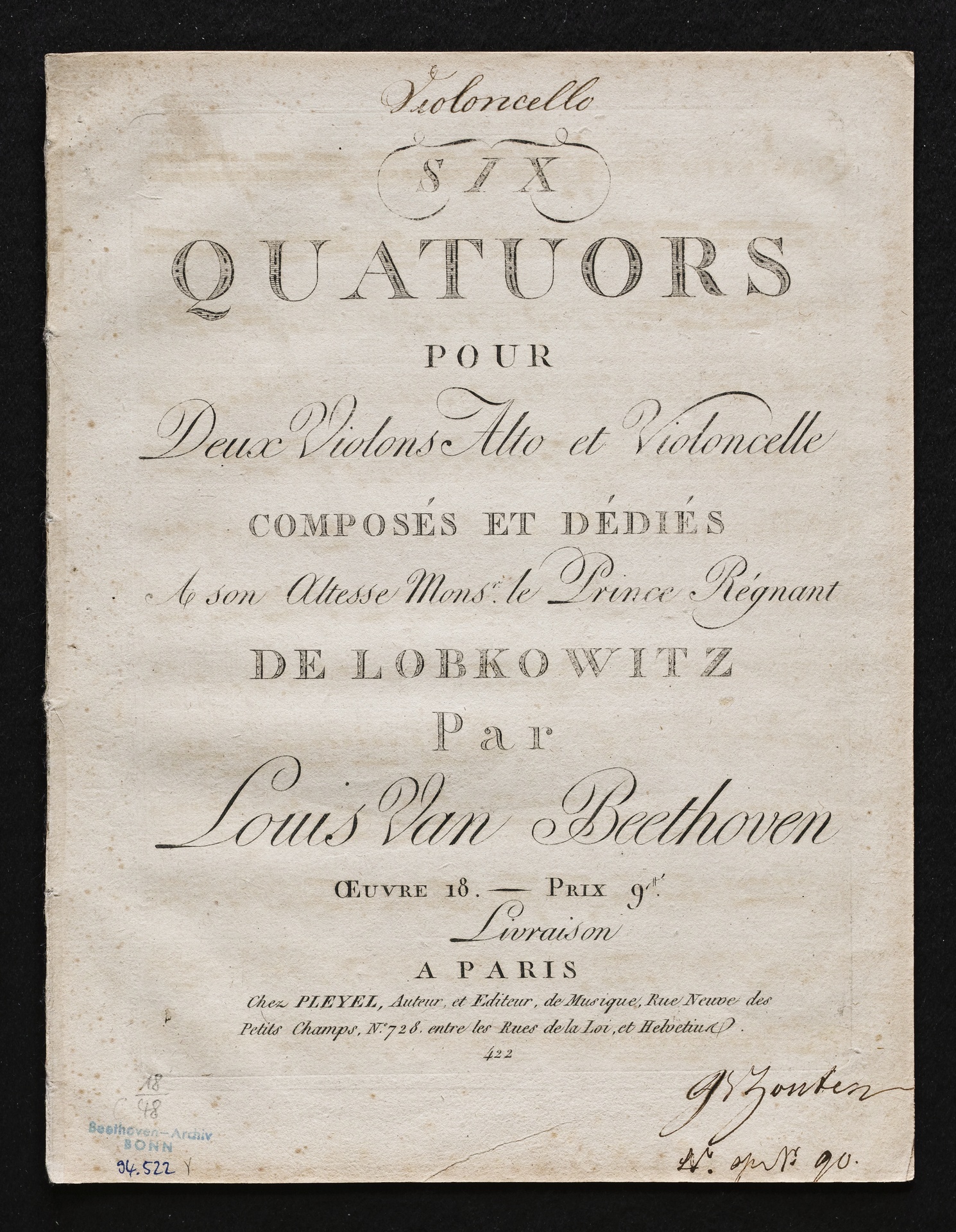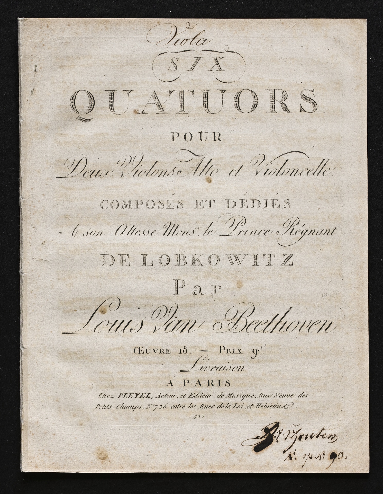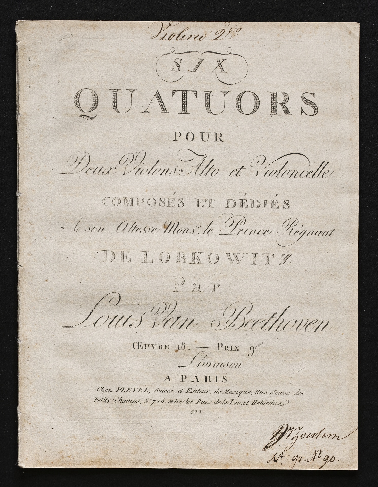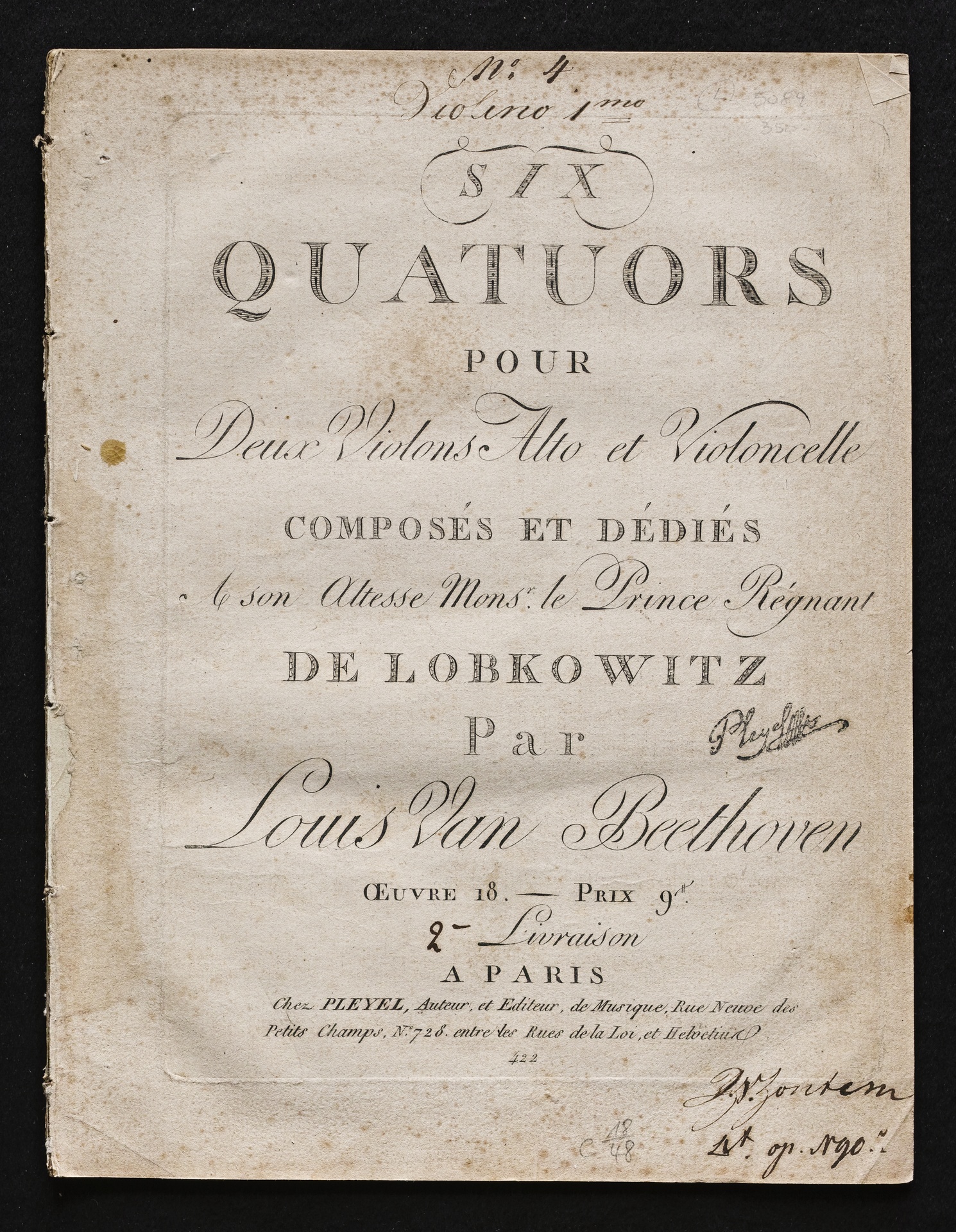 Ludwig van Beethoven, Quartette für 2 Violinen, Viola, Violoncello (F-Dur, G-Dur, D-Dur, c-Moll, A-Dur, B-Dur) op. 18, 1-6, Stimmen, Pleyel, 422, 472